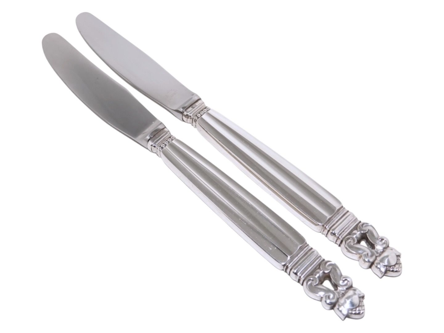 Description: Georg Jensen Acorn sterling silver, luncheon knife with short and serrated knife blade.