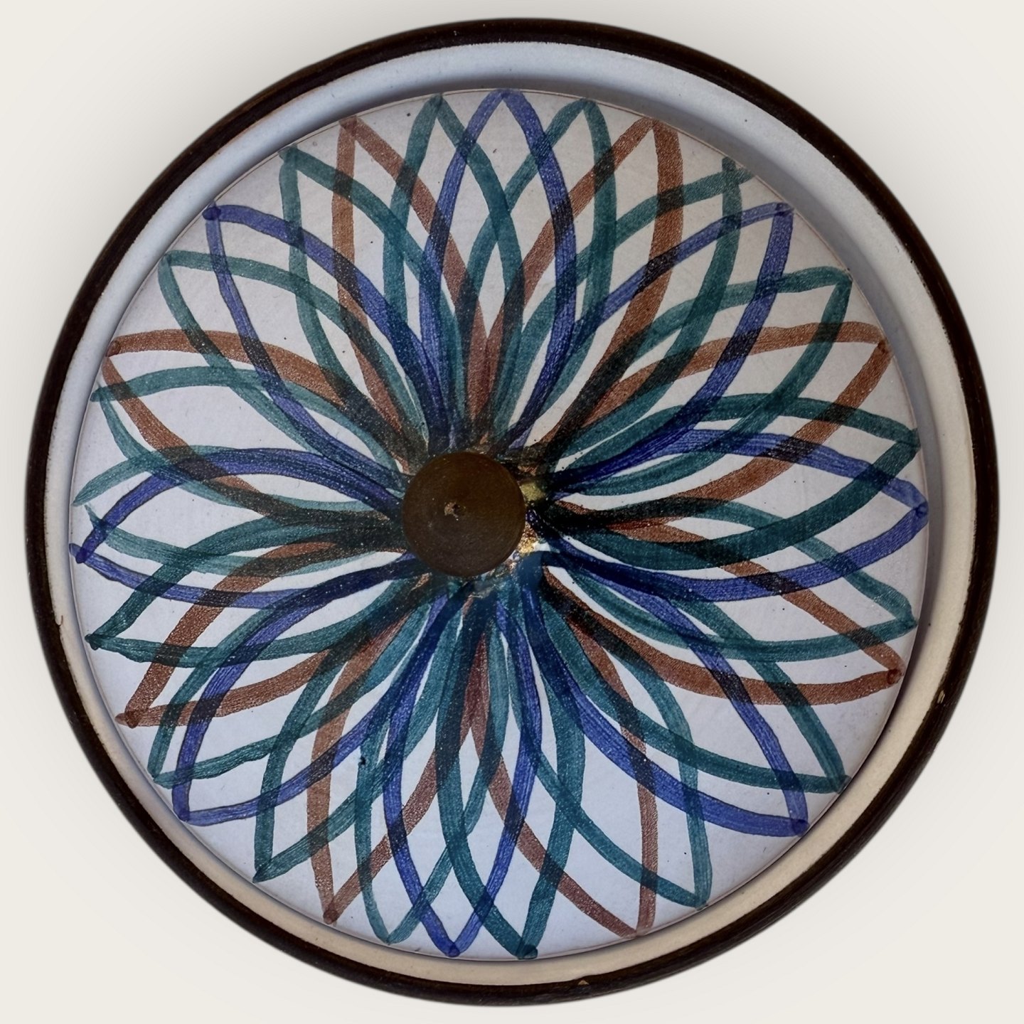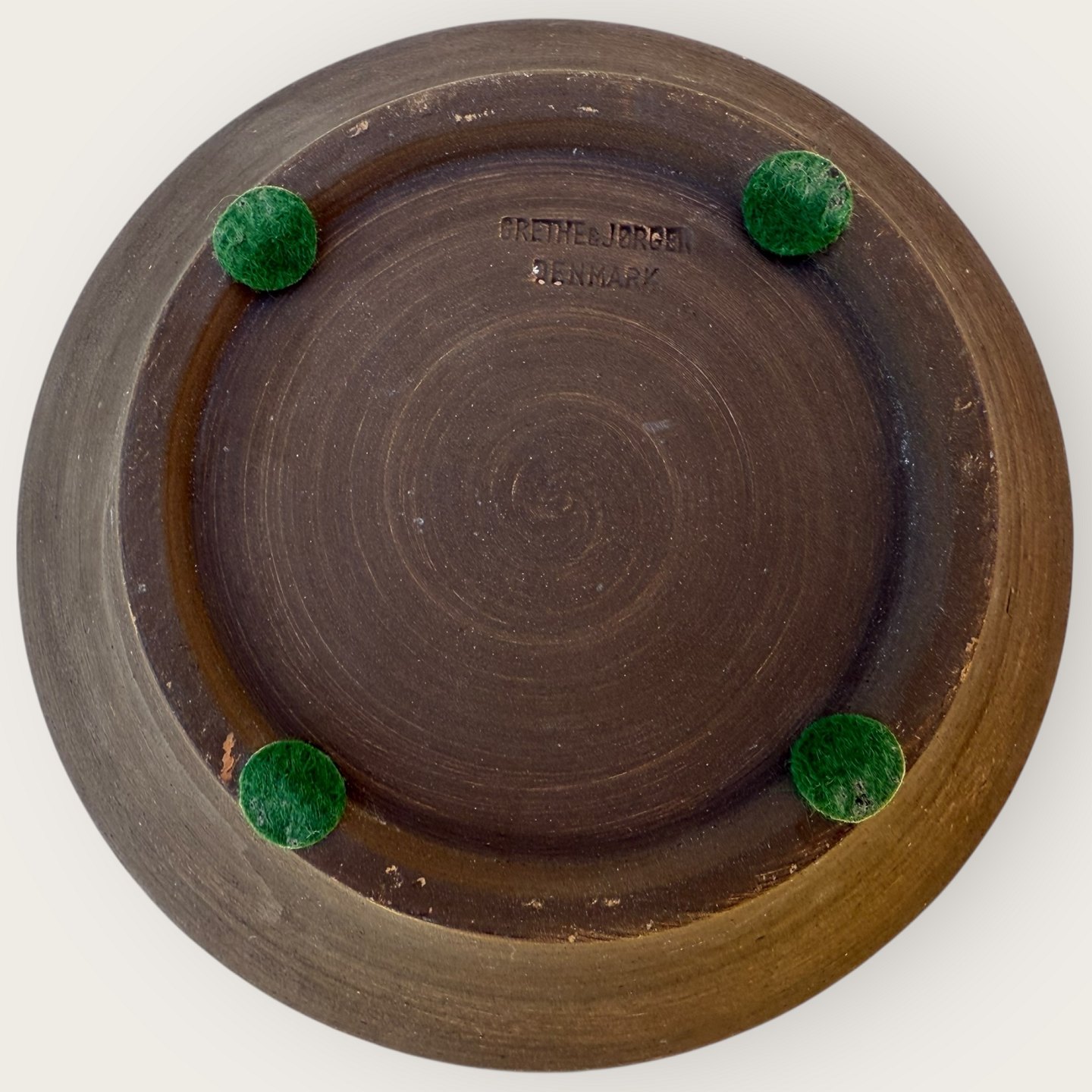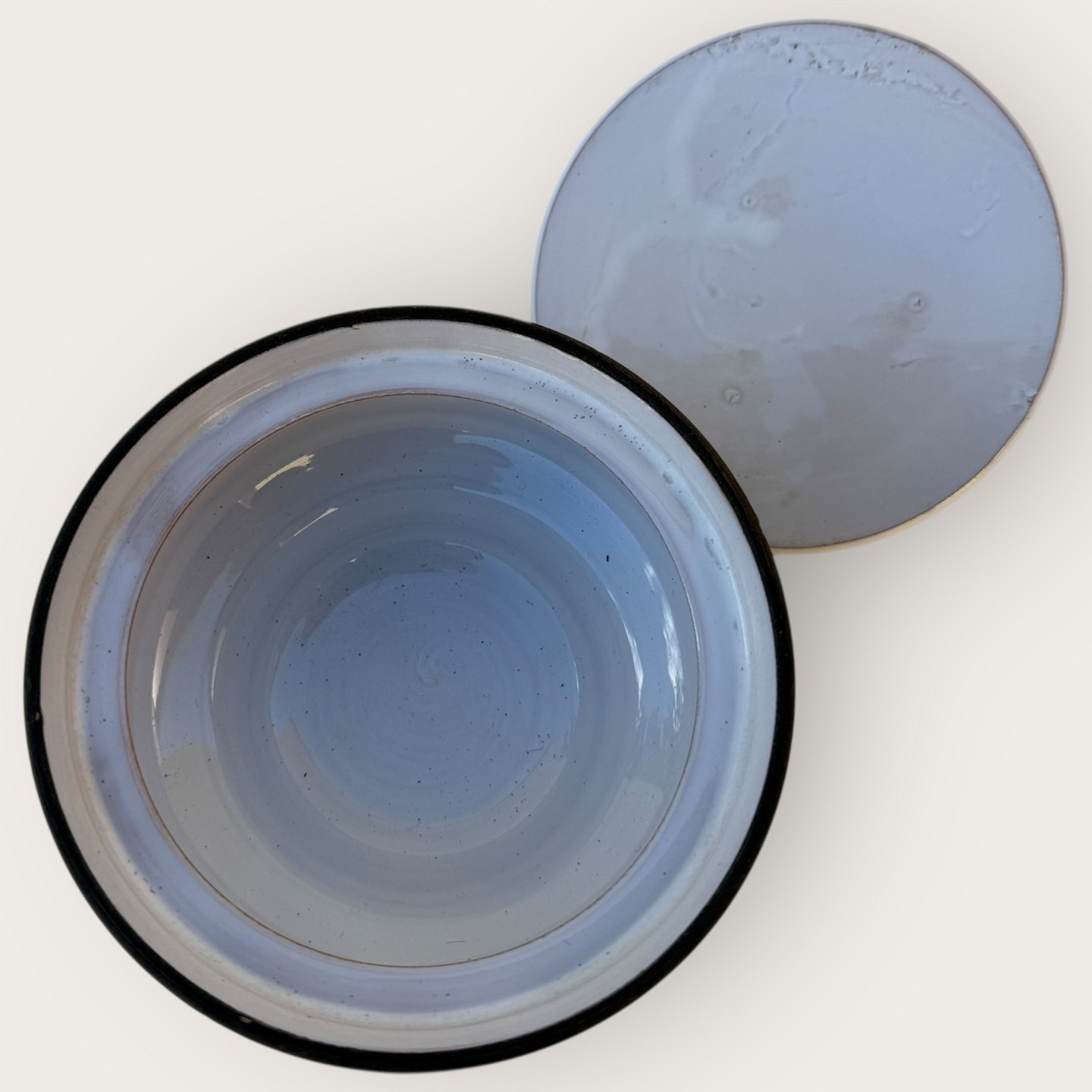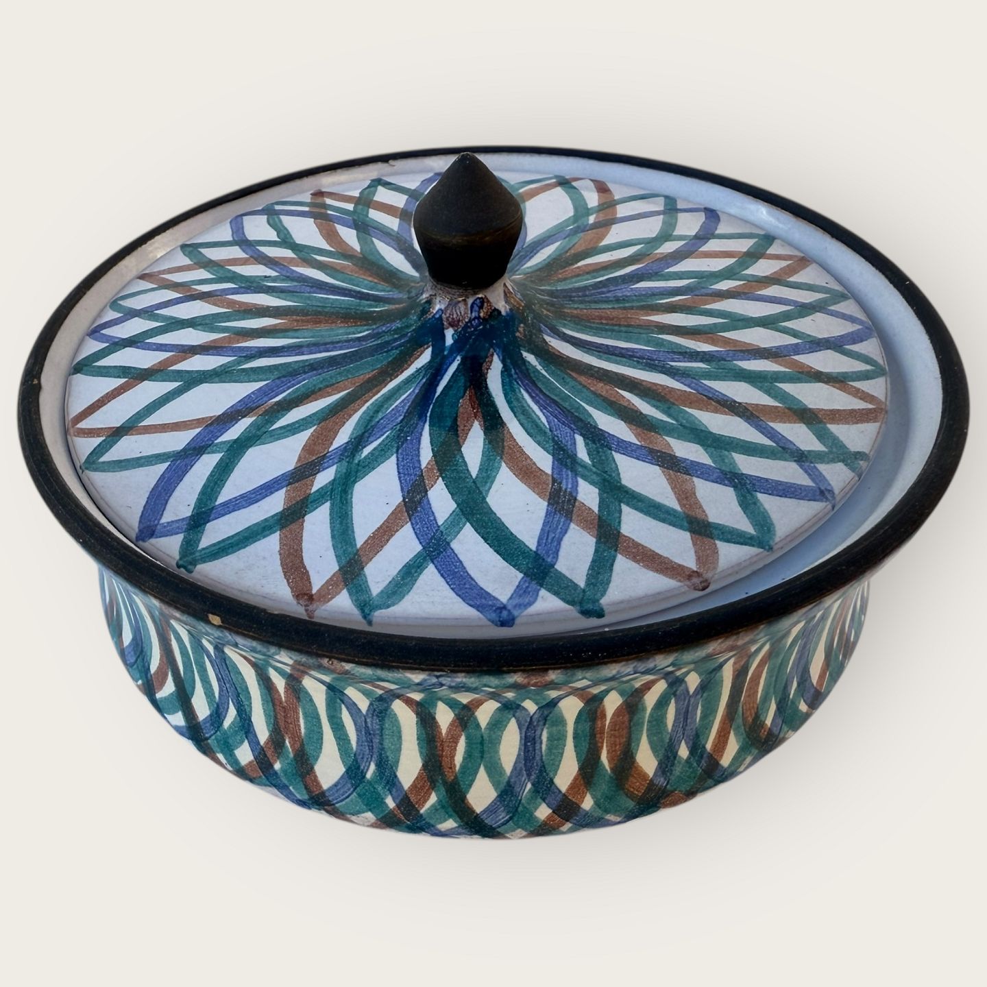 Beskrivelse: Grethe og Jørgen keramik, Stribet skål med låg, Diameter 13,5cm, højde 7,5cm, fin stand