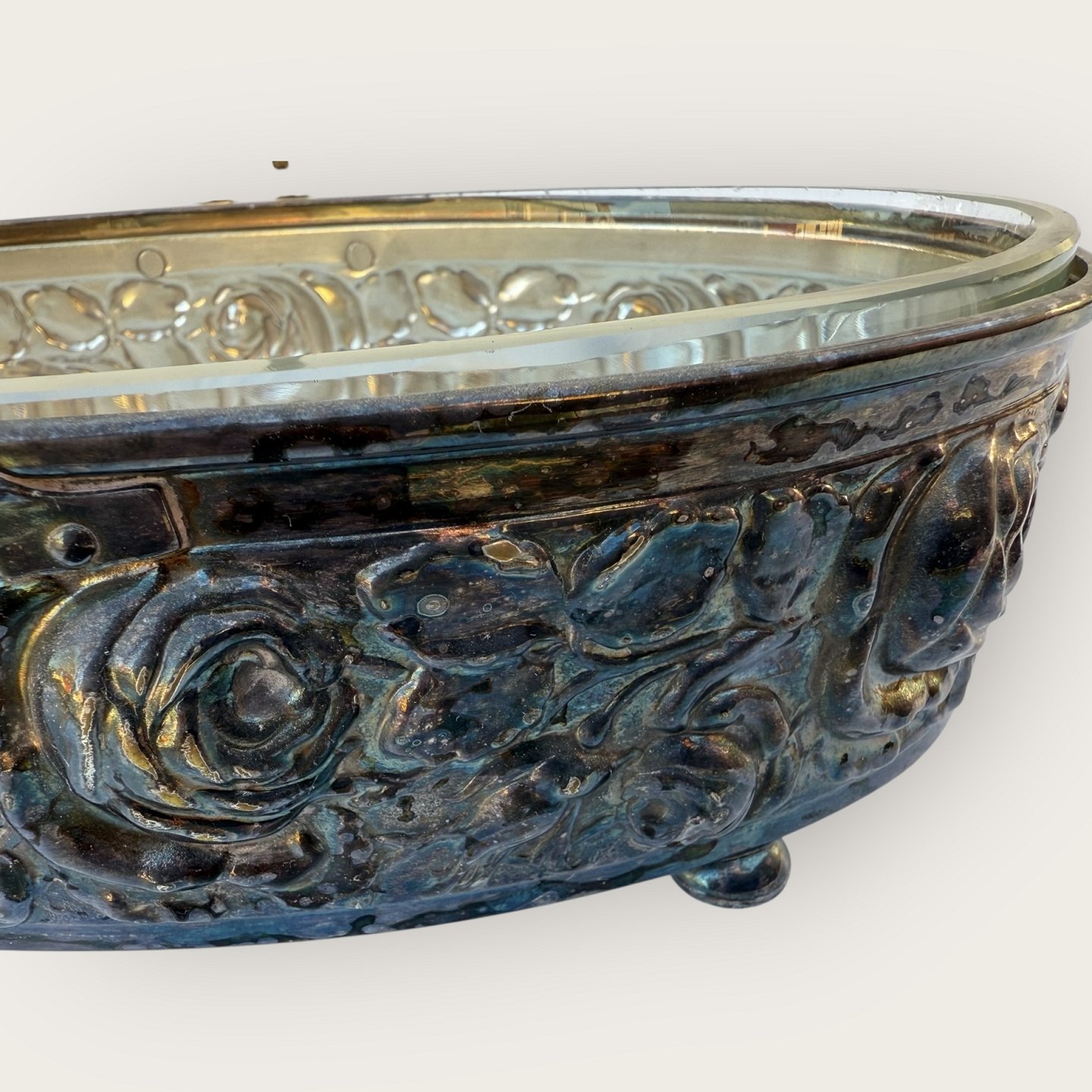 Beskrivelse: Skål med glasindsats i sølvplet med udsmykning af roser og med hank, 25x14cm. *Flot patineret stand, med hel glasskål*