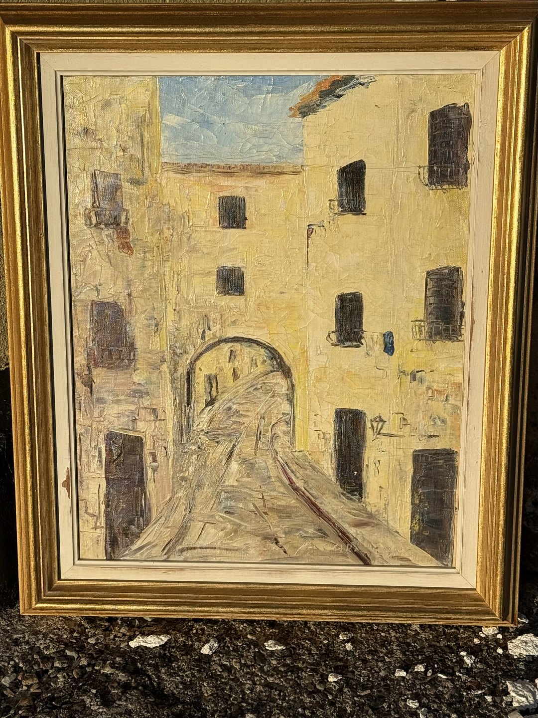 Beskrivelse: Carl Lang, Sydlandsk bymotiv, Olimaleri på lærred, Mål med ramme 51x43cm