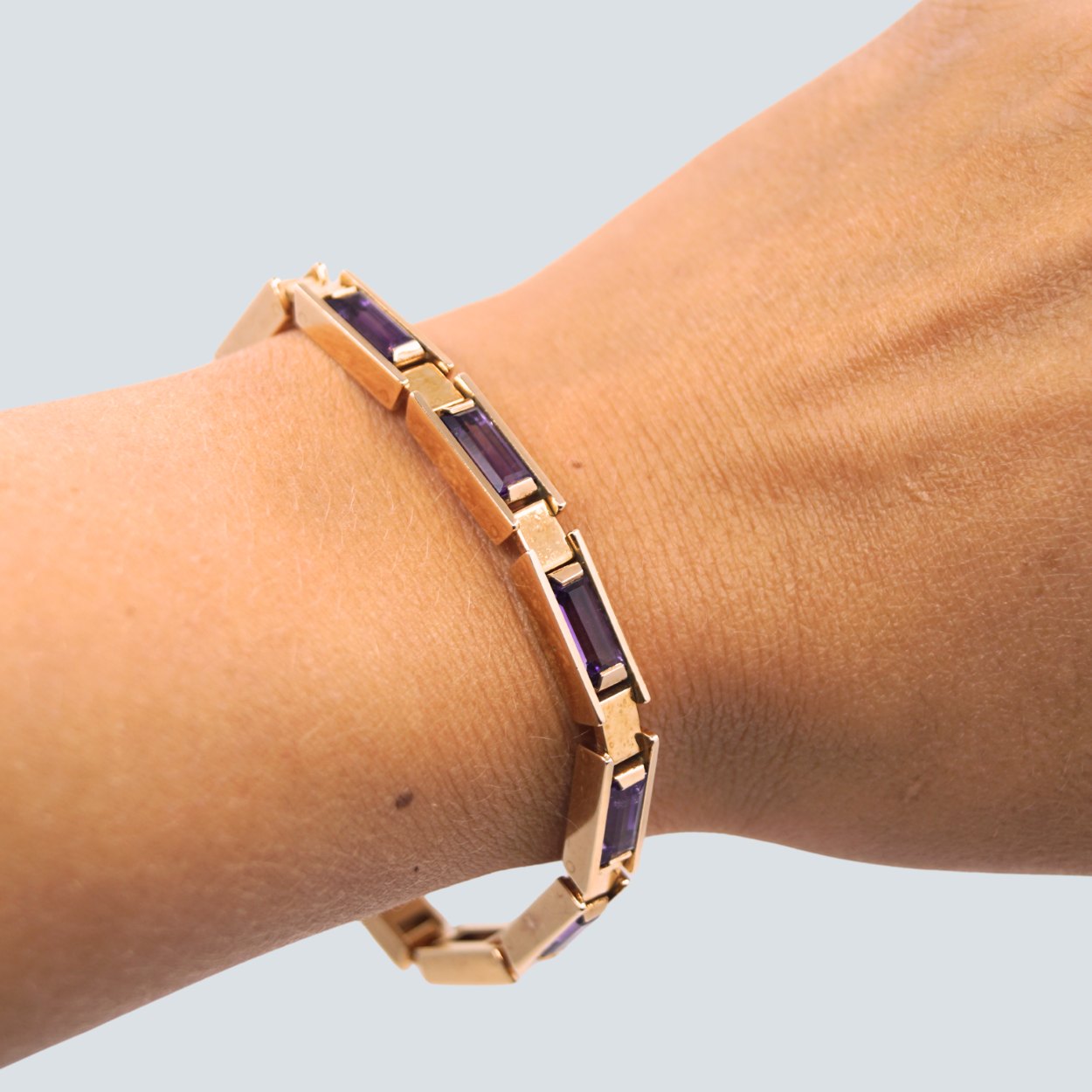 Sven Haugaard; Leddelt armbånd af 14 kt. guld prydet med ametyster. B. 5 mm. L. 18 cm. Med kasselås, samt sikkerhedslås.