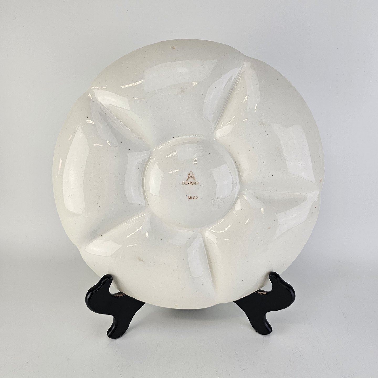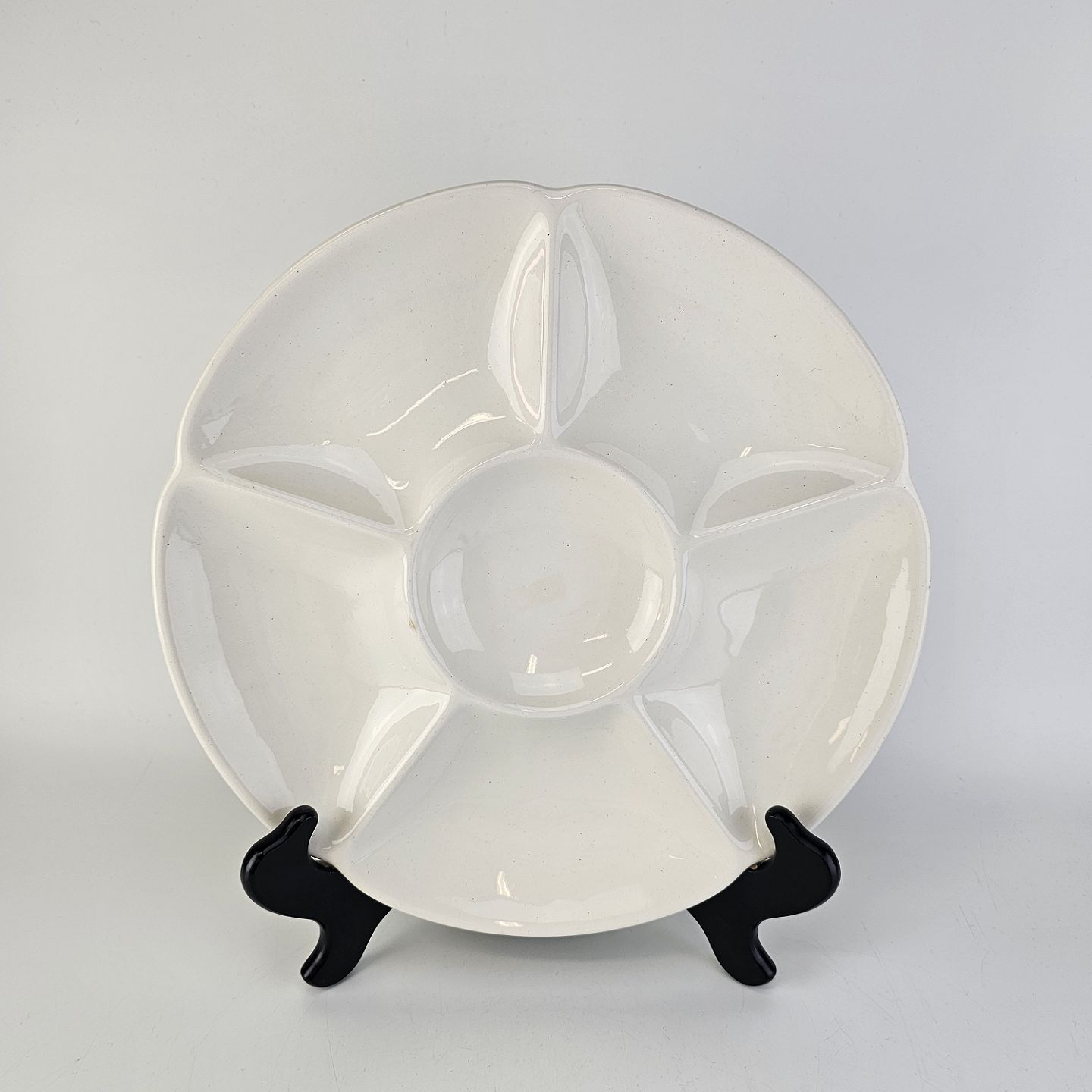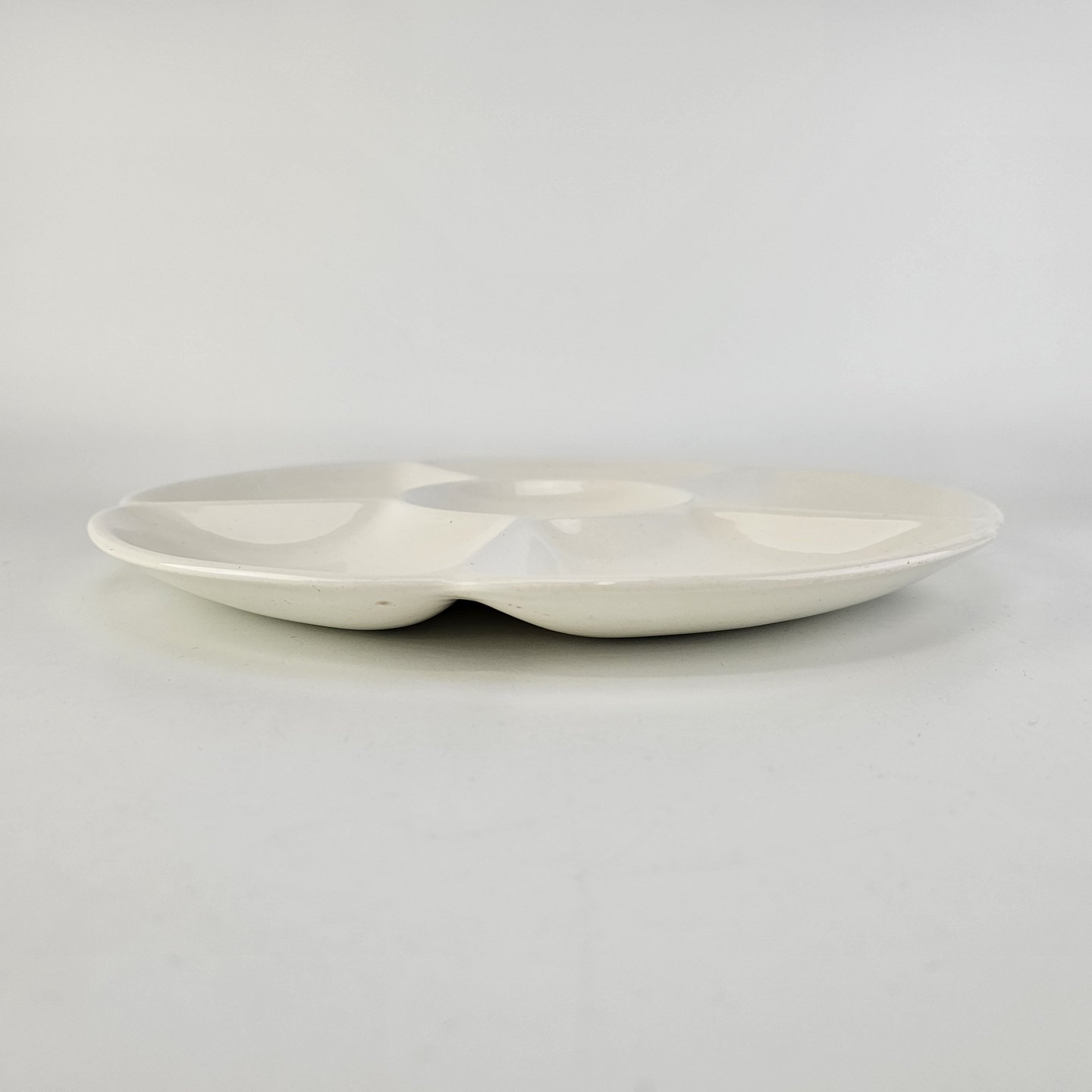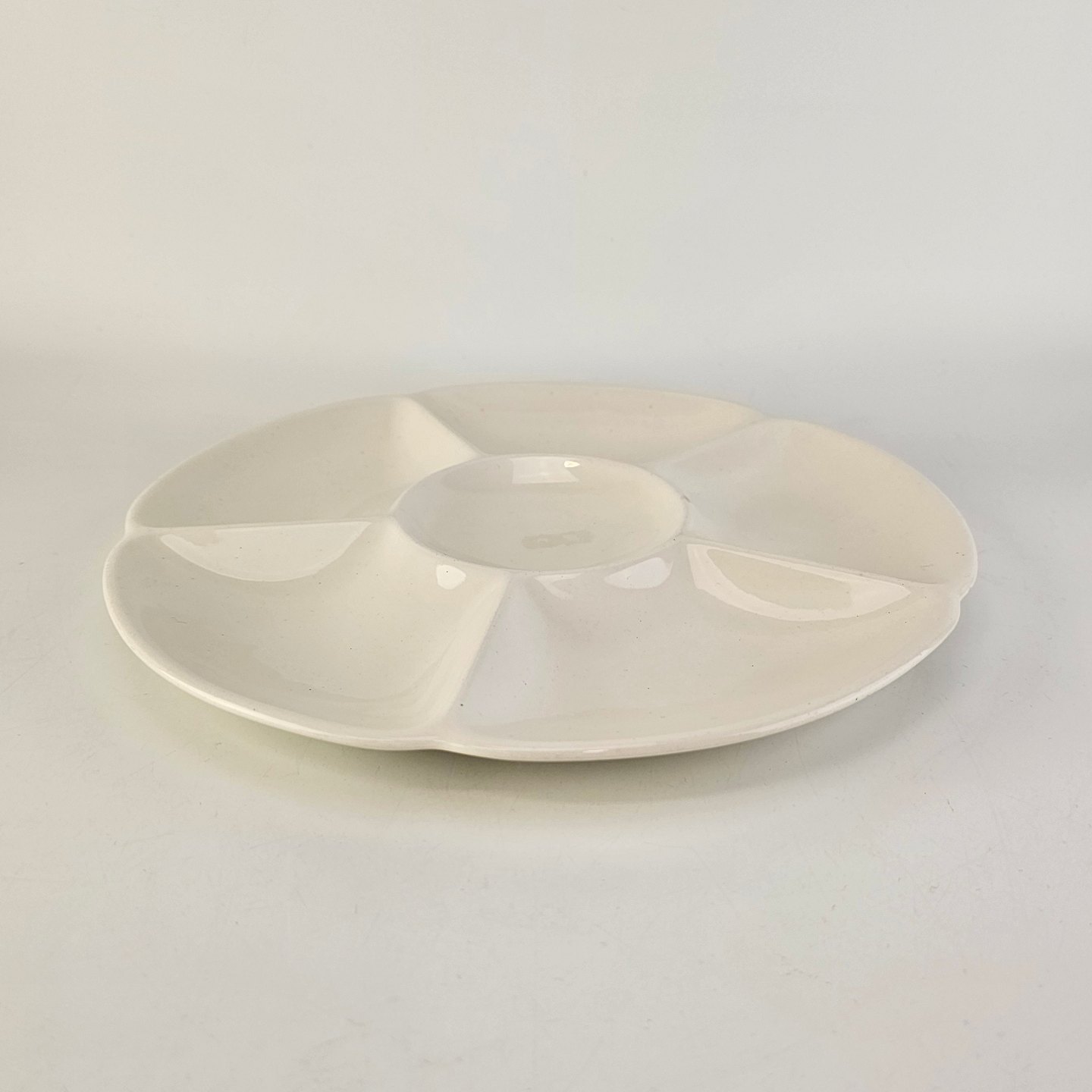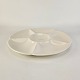 Beskrivelse: Rundt fad med seks rum i cremefarvet fajance fra stellet Alma