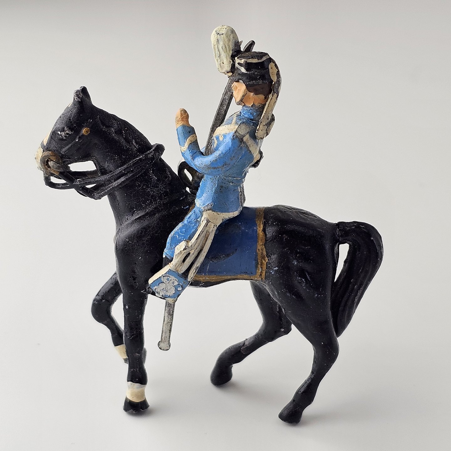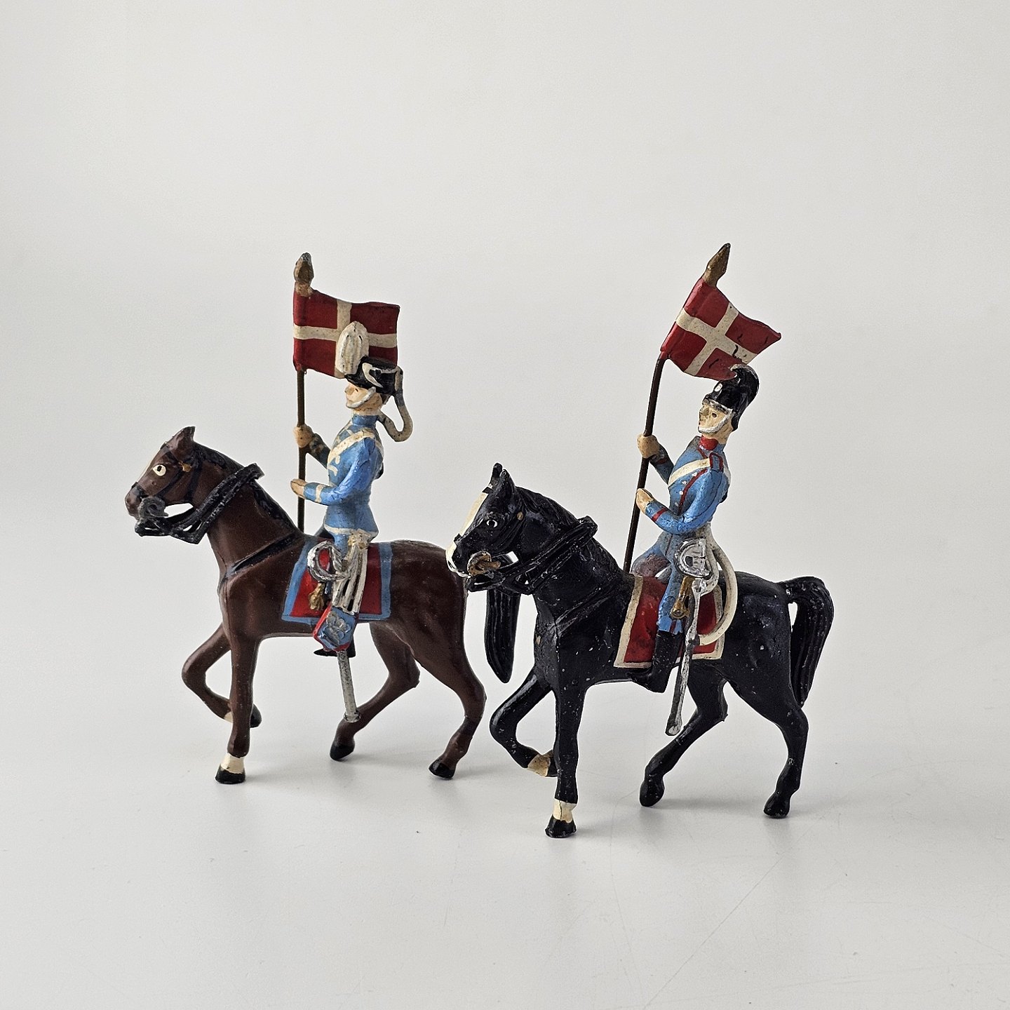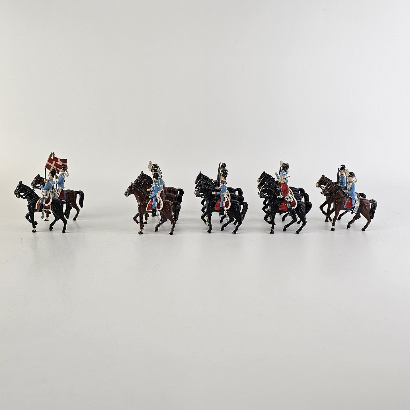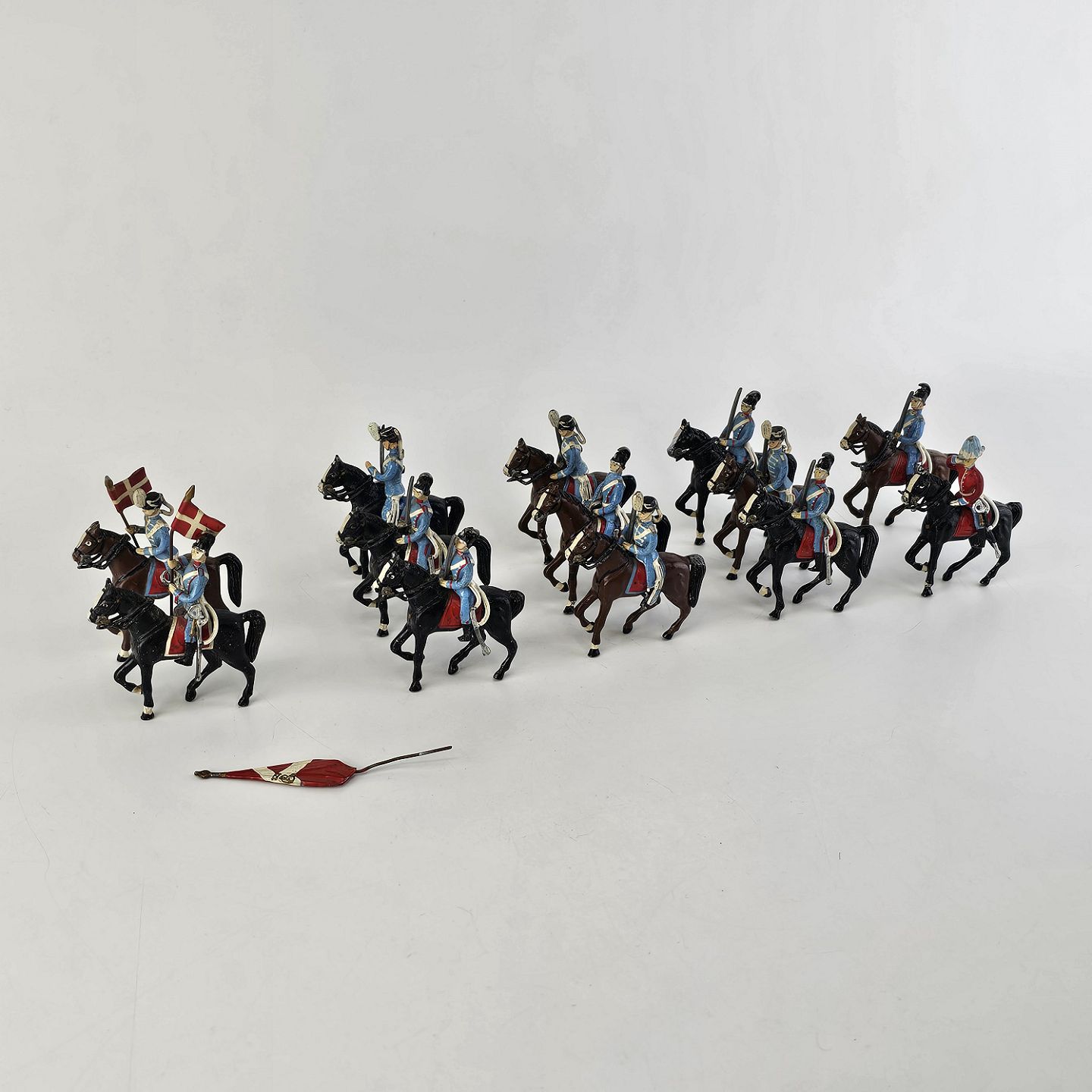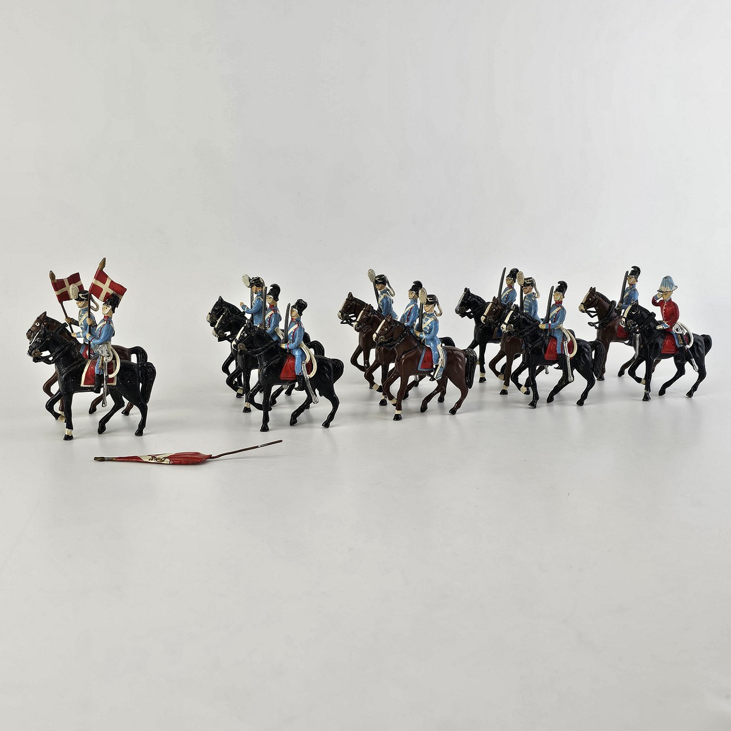 Beskrivelse: 13 figurer af dragoner på heste i tin. Seks brune heste og syv sorte heste, to dragoner rider med flag og ni med sabler, og en løs fane