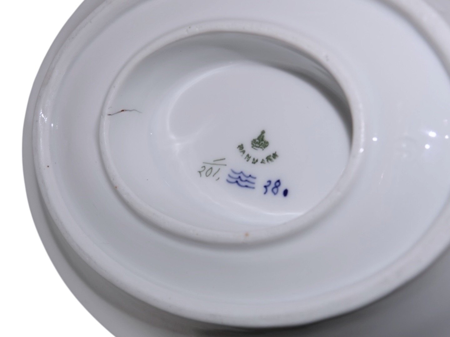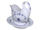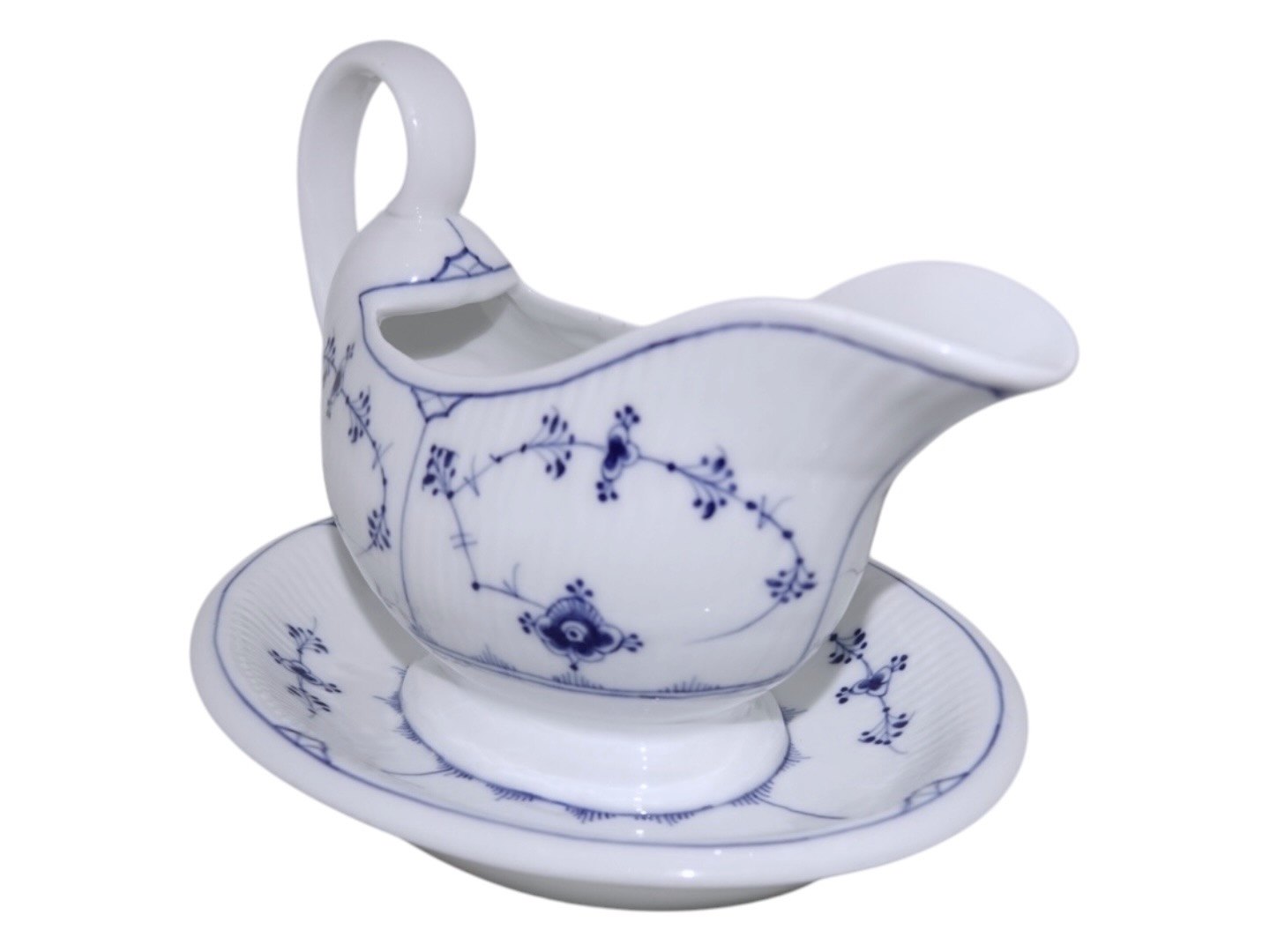 Beskrivelse: Royal Copenhagen Musselmalet Riflet sovseskål på fast underfad og med hank.