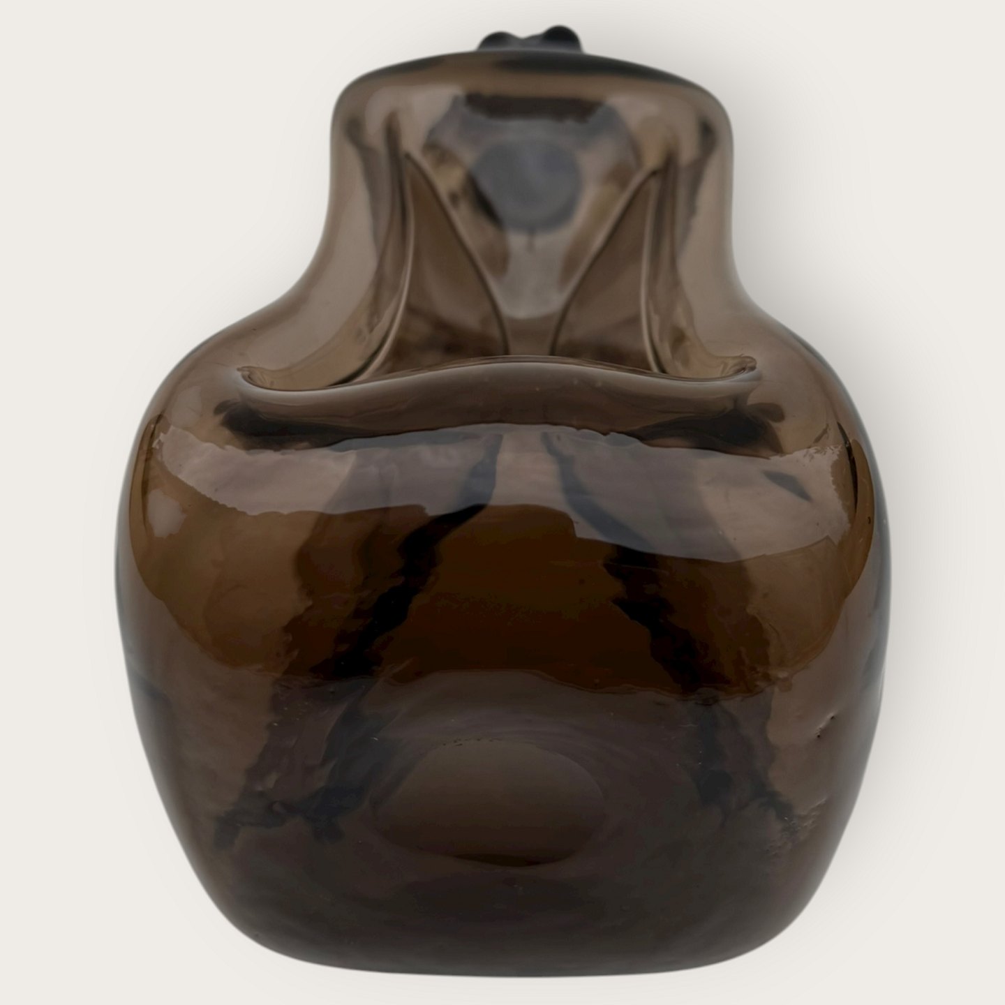 Beskrivelse: Holmegaard, klukflaske i brunt glas og med krone prop, Lille smule urenhed indvendigt i bunden ellers pæn stand, Mål: 26x10x10cm