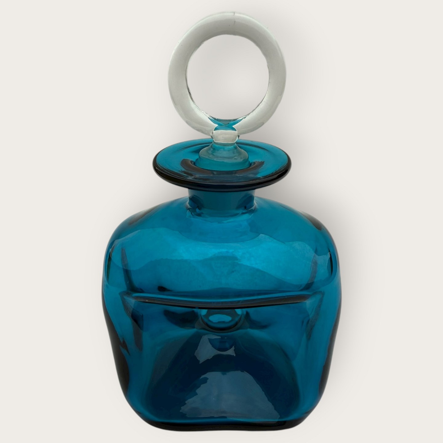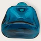 Beskrivelse: Kastrup Glasværk, Blå klukflaske med flad klar prop, 19x11x7cm *pæn brugt stand*