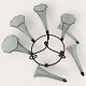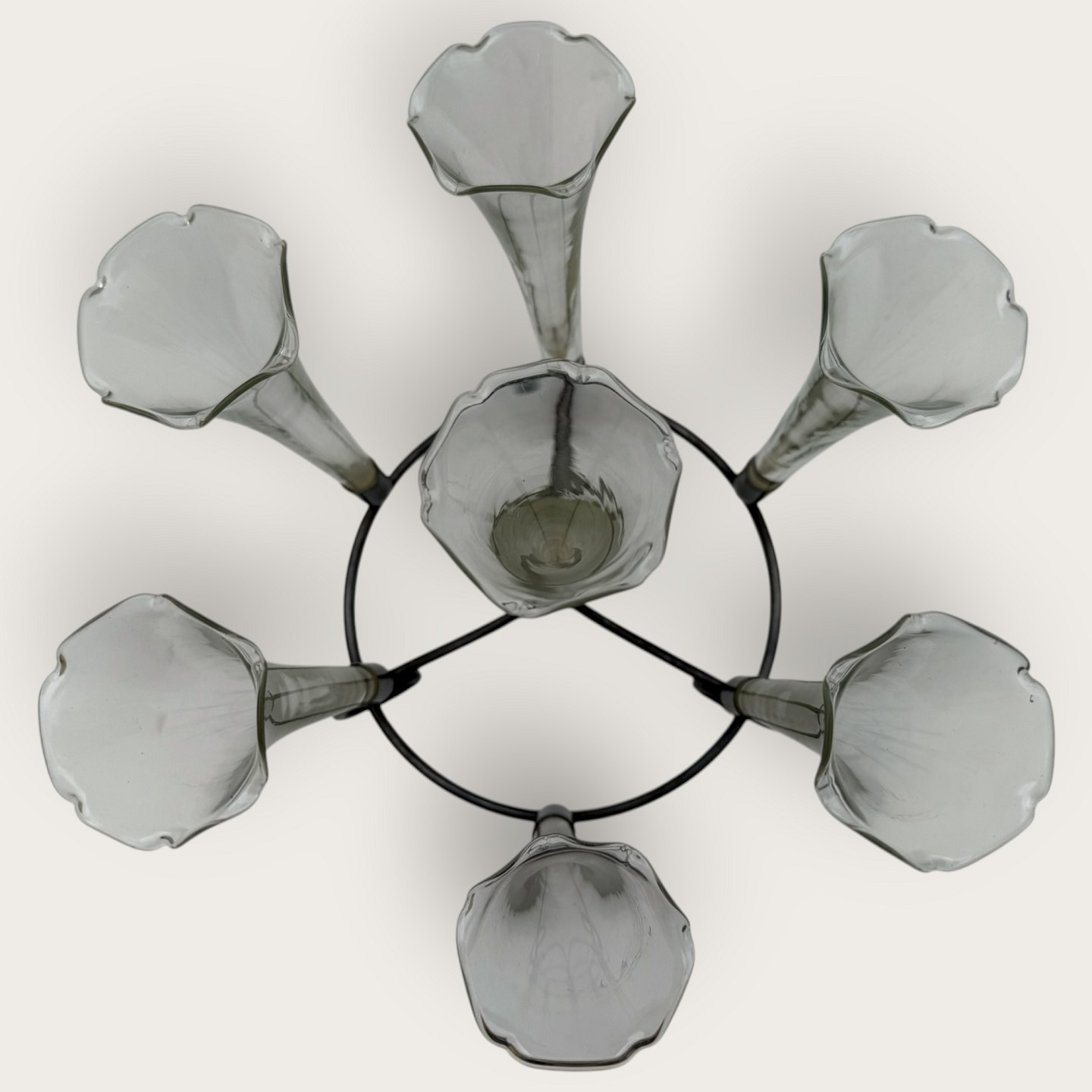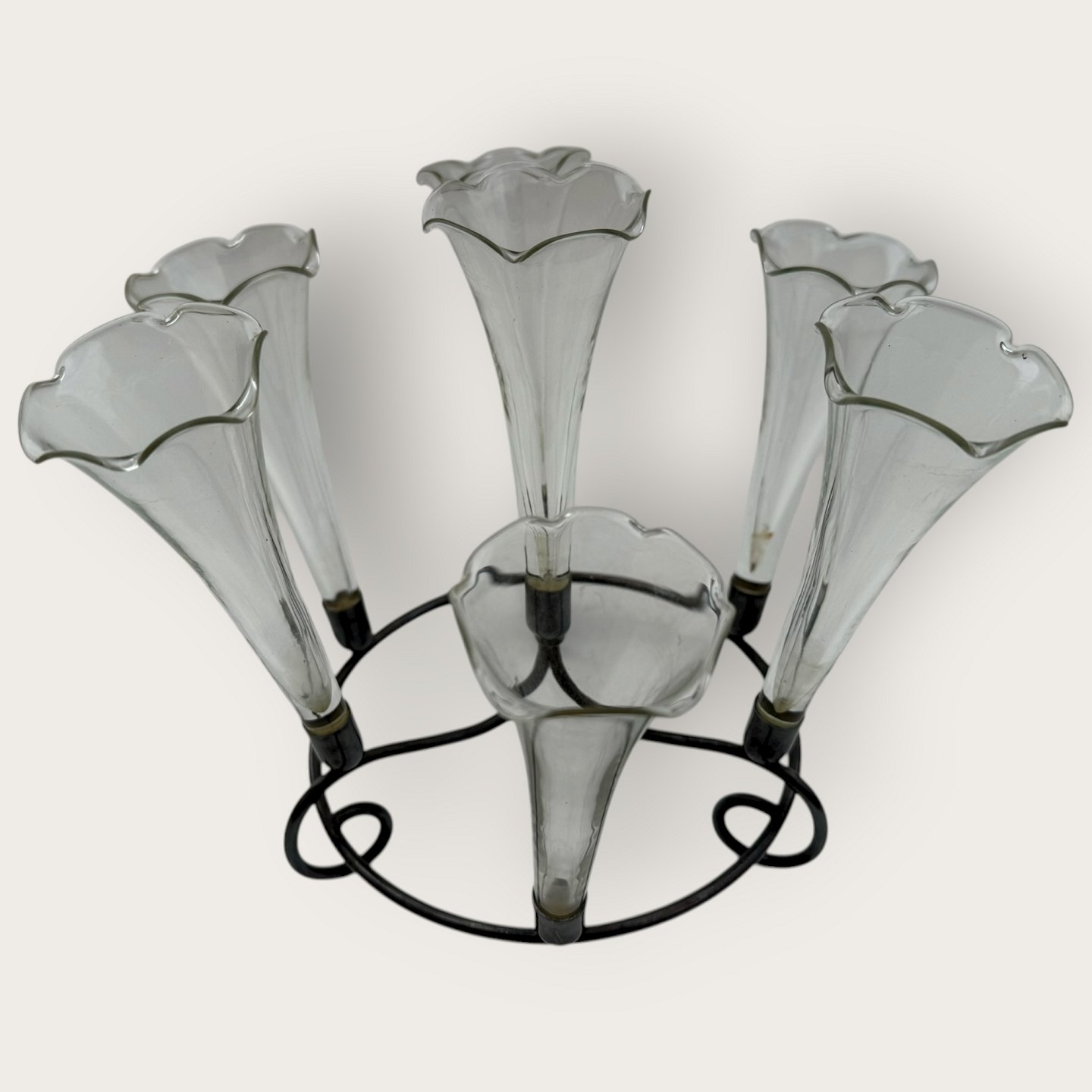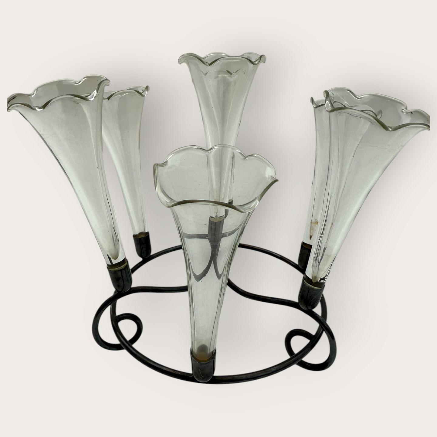 Beskrivelse: Epergne vase, Fint tyndt glas med flæsekant, alle vaser med sølvpletmontering, 7 vaser i art nouveau holder, ca. 19cm høj og 24cm i diameter, hver glasvase 13x5cm *Fin stand*
