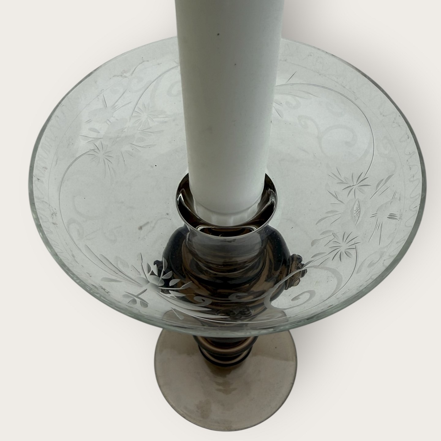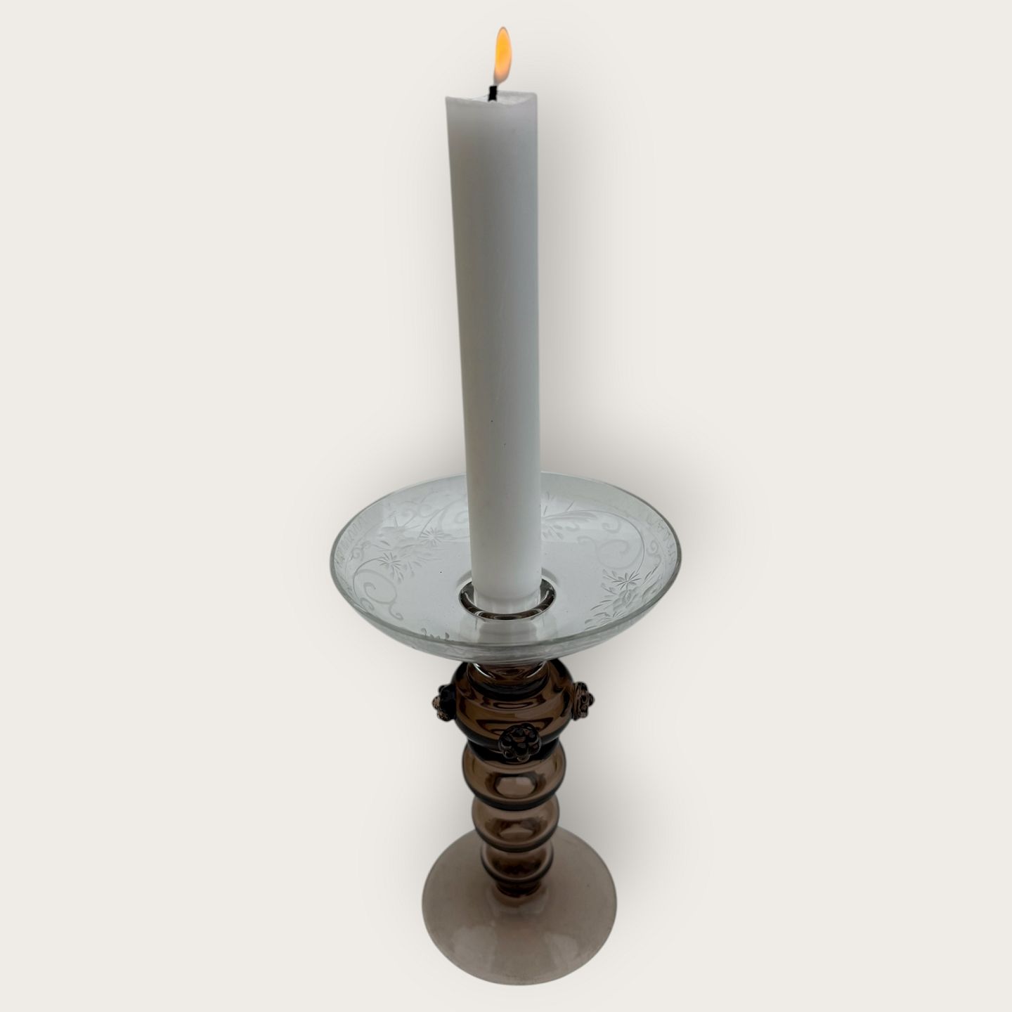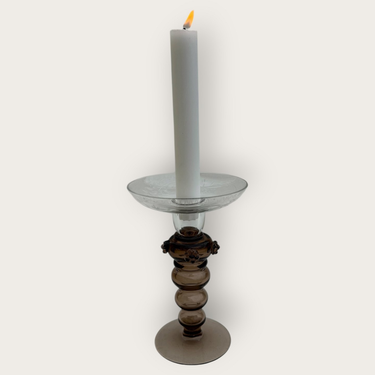 Beskrivelse: Gammel glaslysestage, hul brun stamme med rosetter, Skål med slibninger affugle, mønster og blomster, flot stand, højde 16,5cm, diameter 11cm