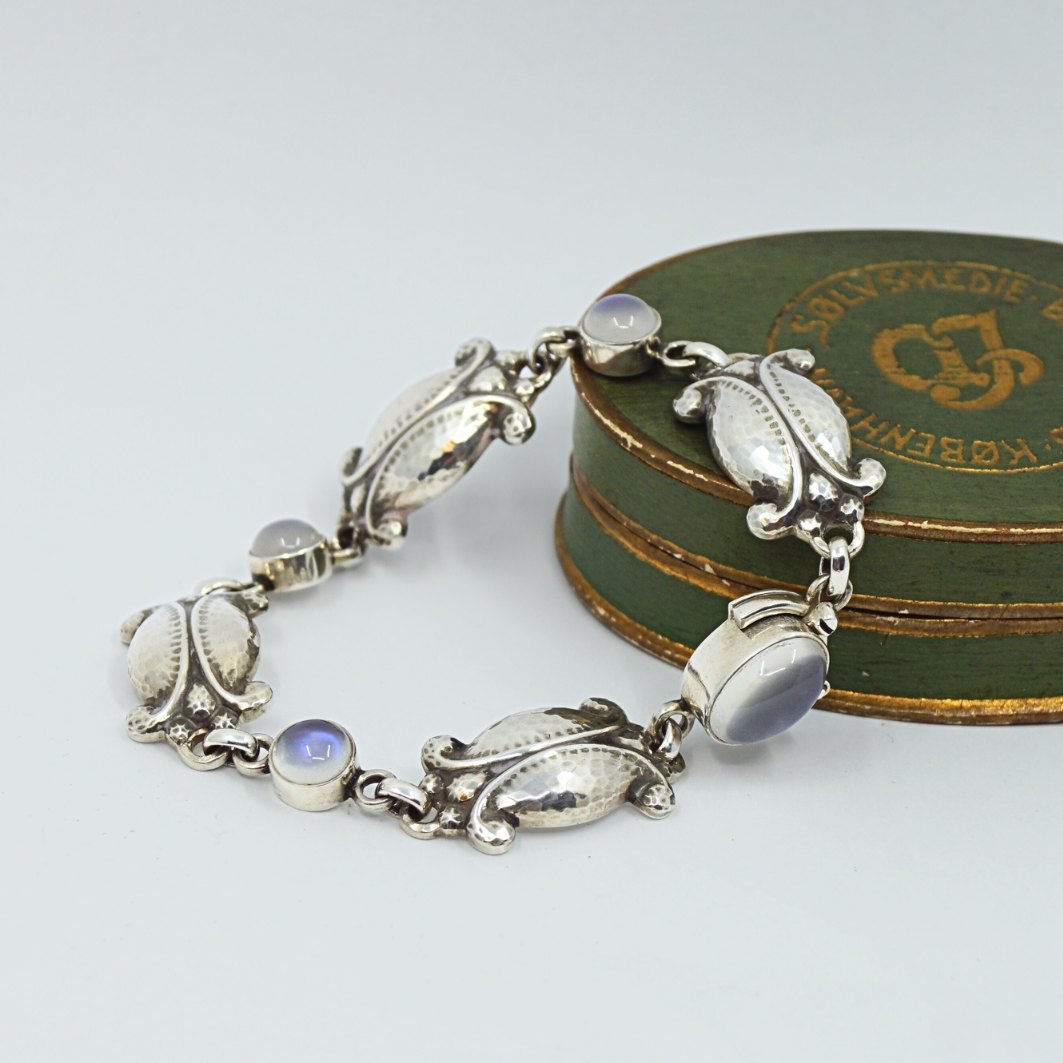 Georg Jensen; A "Moonlight Blossom" bracelet of sterling silver, set with moonstone, No. 11