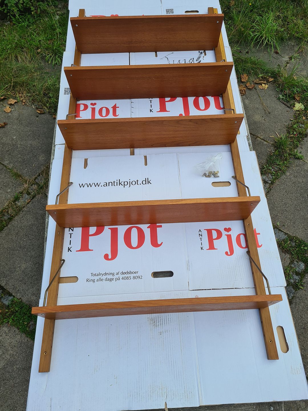 Beskrivelse: Reol til ophængning på væggen fra 1960'erne i finéret teak. Består 5 hylder á 80 x 20 cm. og 2 vanger á 198 cm. Pænt og ok velholdt dog med lidt brugsspor i form af overflade skrammer og uoriginale skruer. (Billede)