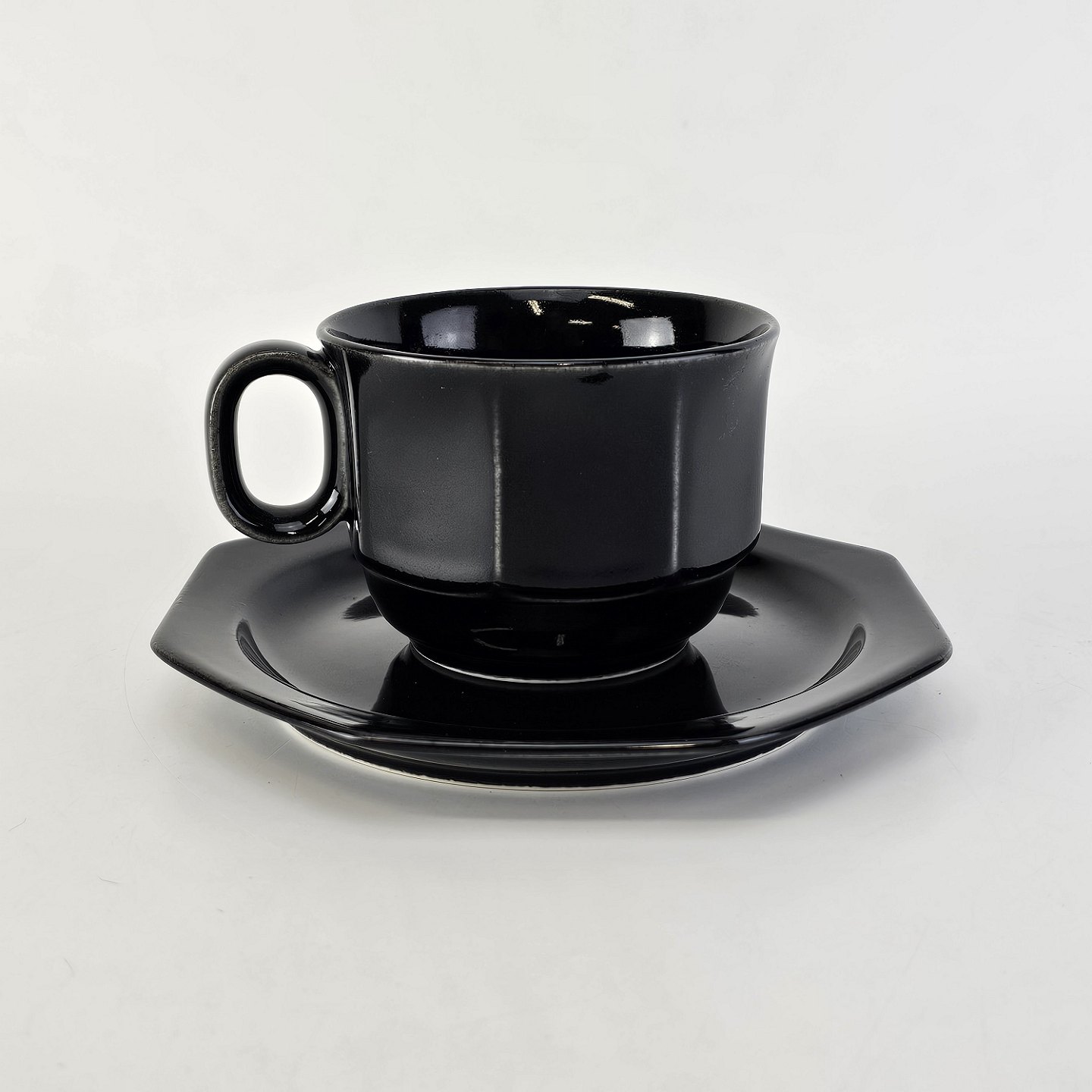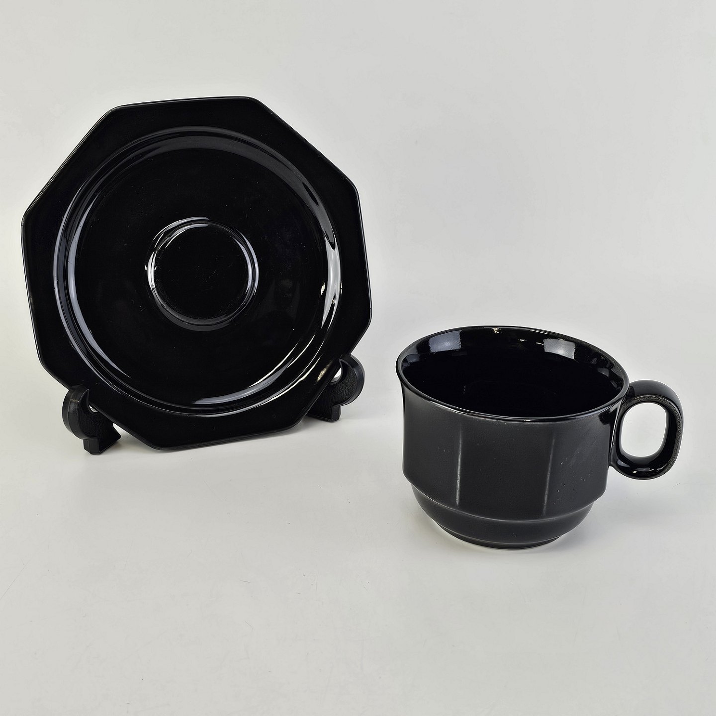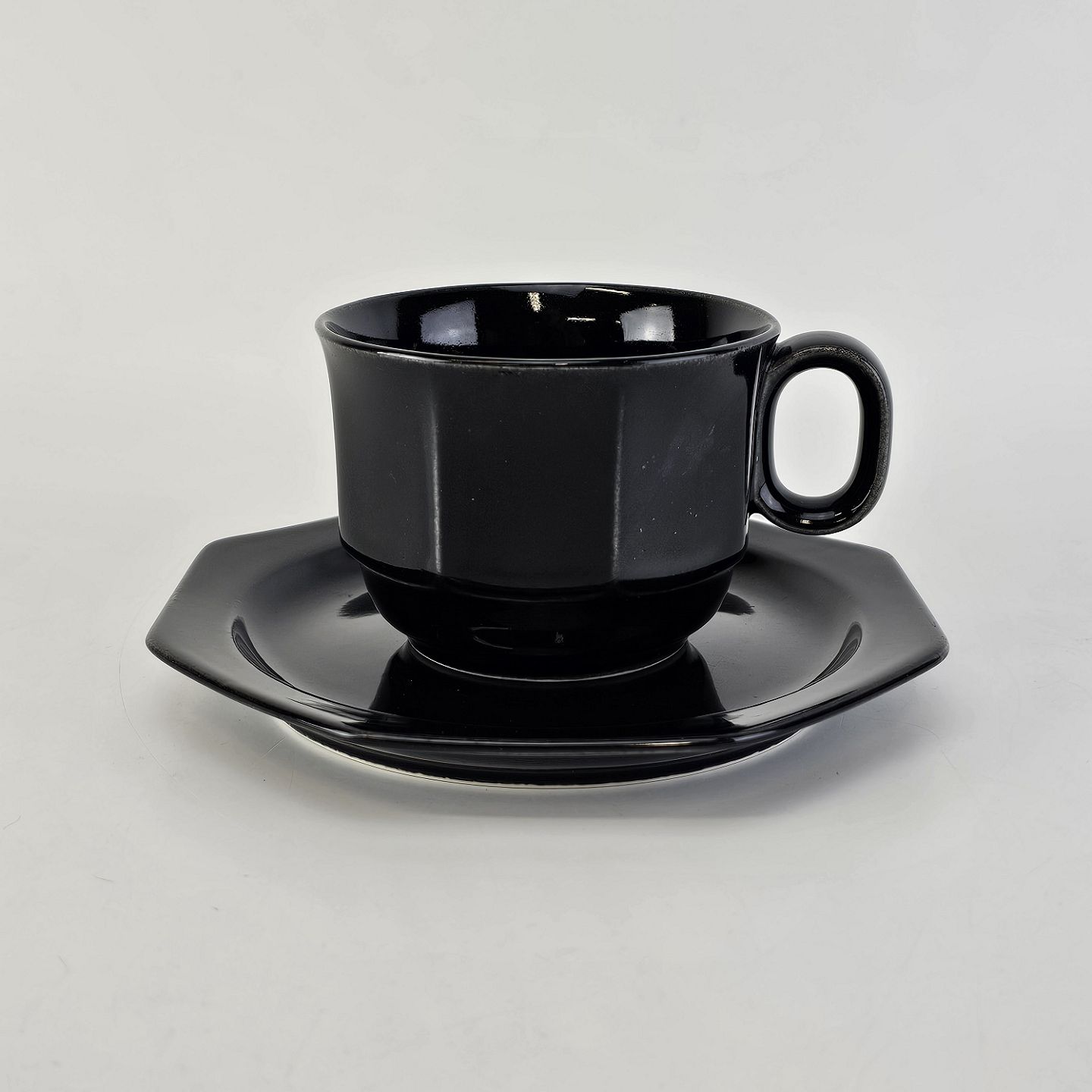Beskrivelse: Kop og underkop i sort stentøj fra stellet Café