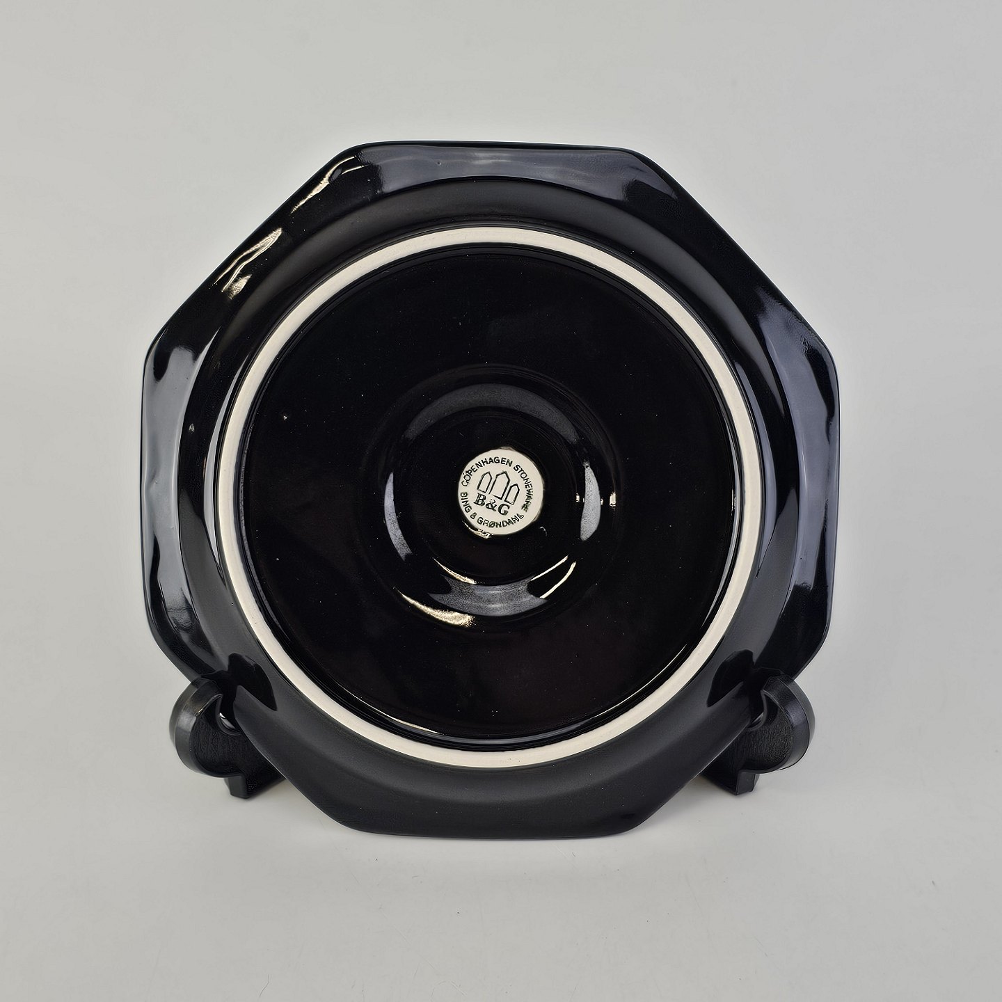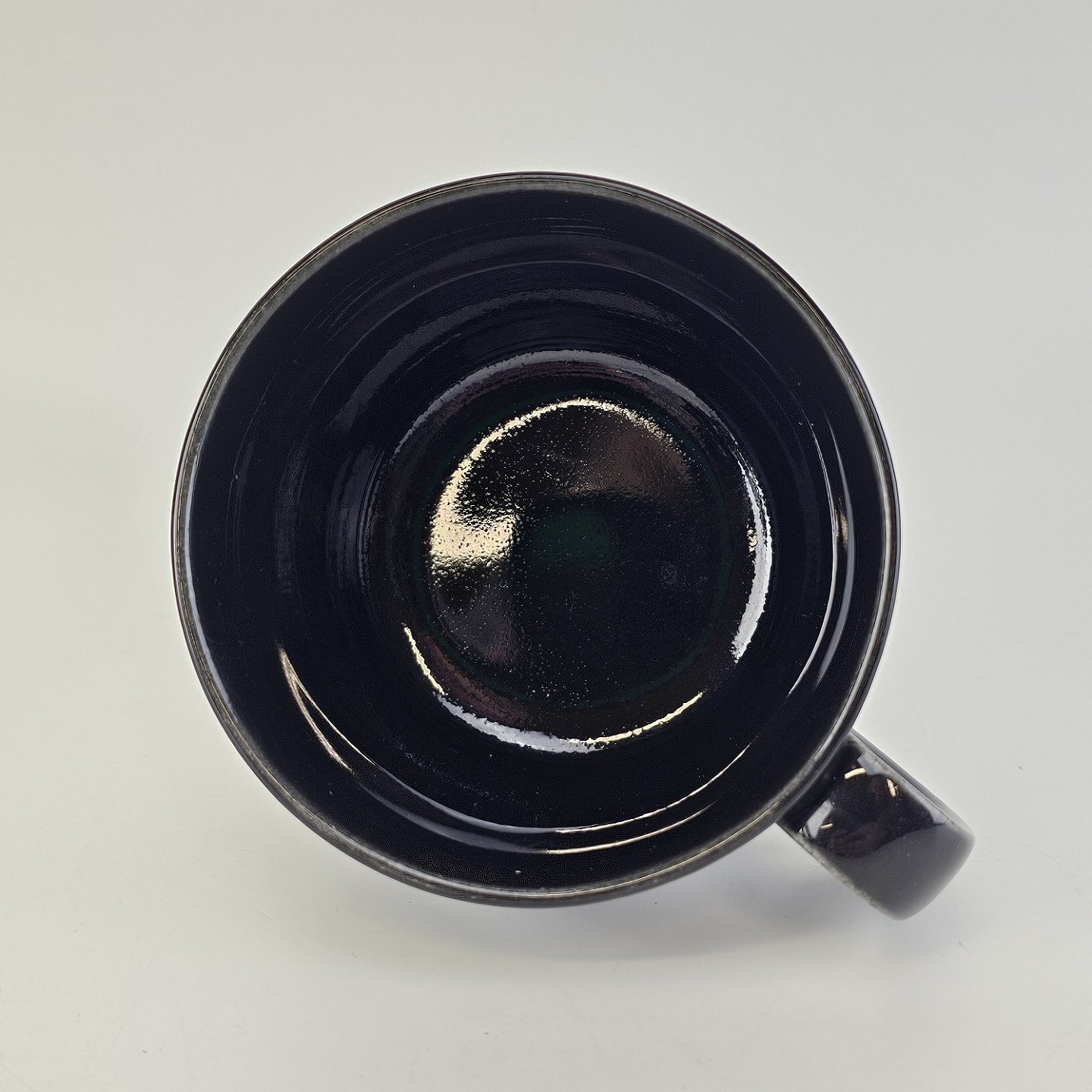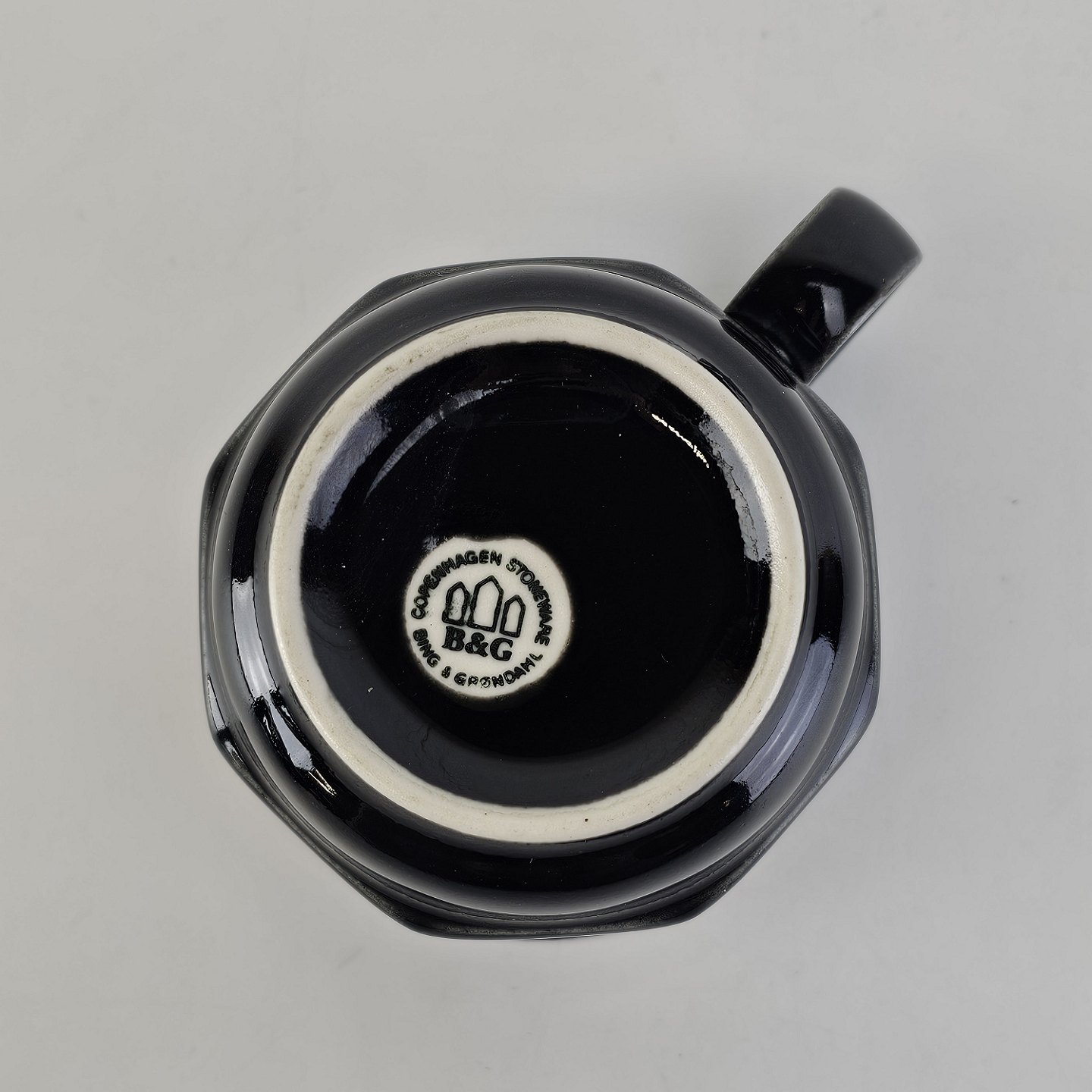 Beskrivelse: Kop og underkop i sort stentøj fra stellet Café