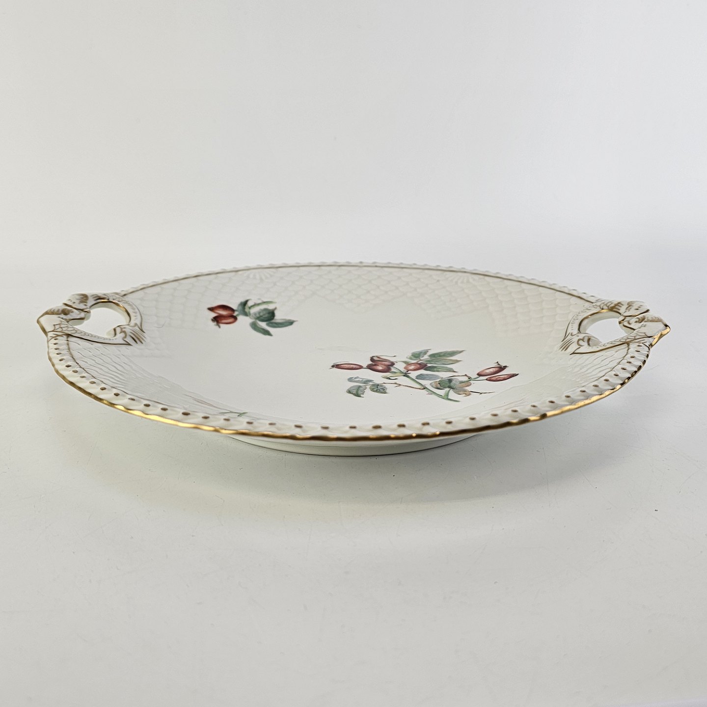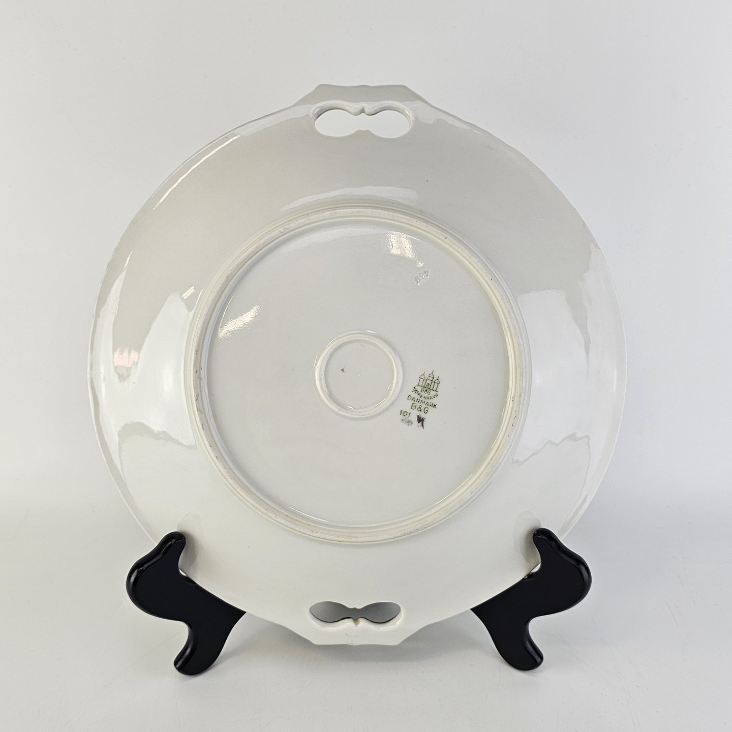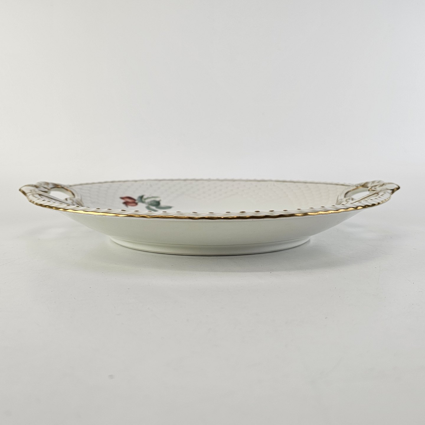 Beskrivelse: Rundt fad med håndtag i porcelæn fra stellet Balder