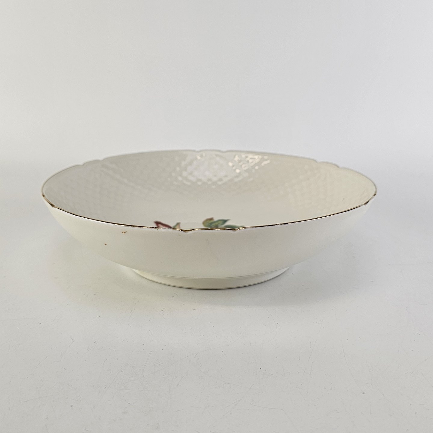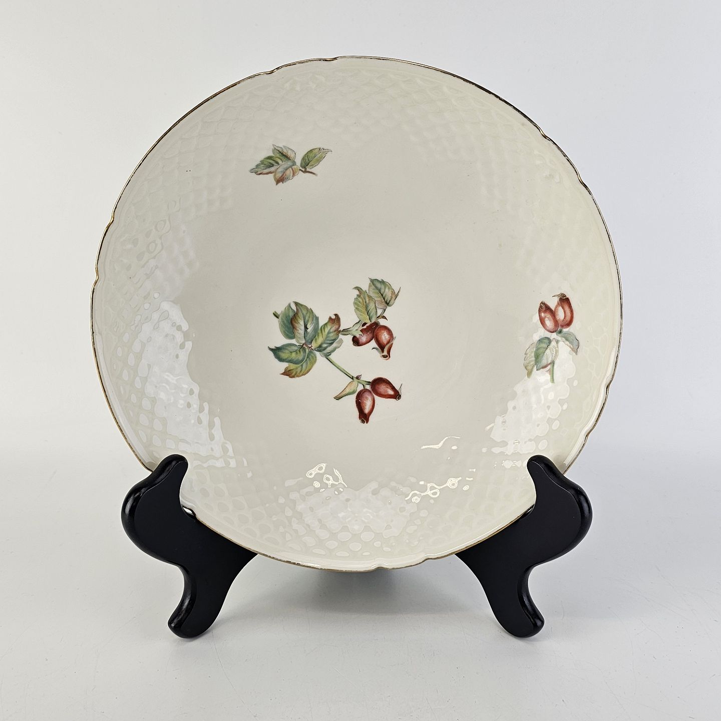 Balder er cremefarvet porcelæn i skælform, dekoreret med hyben og guldkant.