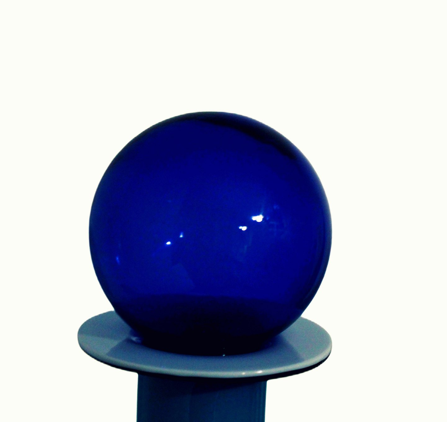 Beskrivelse: Kastrup/Holmegaard, Pyntekugle i transparent blåt glas. Kan bruges både som "prop" på Bauer flasker og til at hænge op. Produceret i 1970'erne. Diameter 7 cm. Højde 9 cm. Pris: SOLGT
