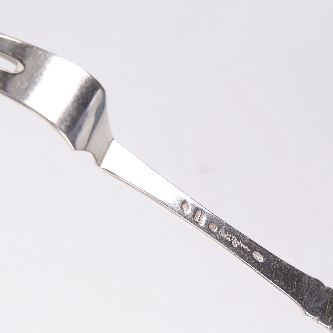 Beskrivelse: Stegegaffel i mønster nr. 13 af Evald Nielsen. Tretårnet sølv, stemplet. Klassisk dansk sølvdesign i tidløs kvalitet.