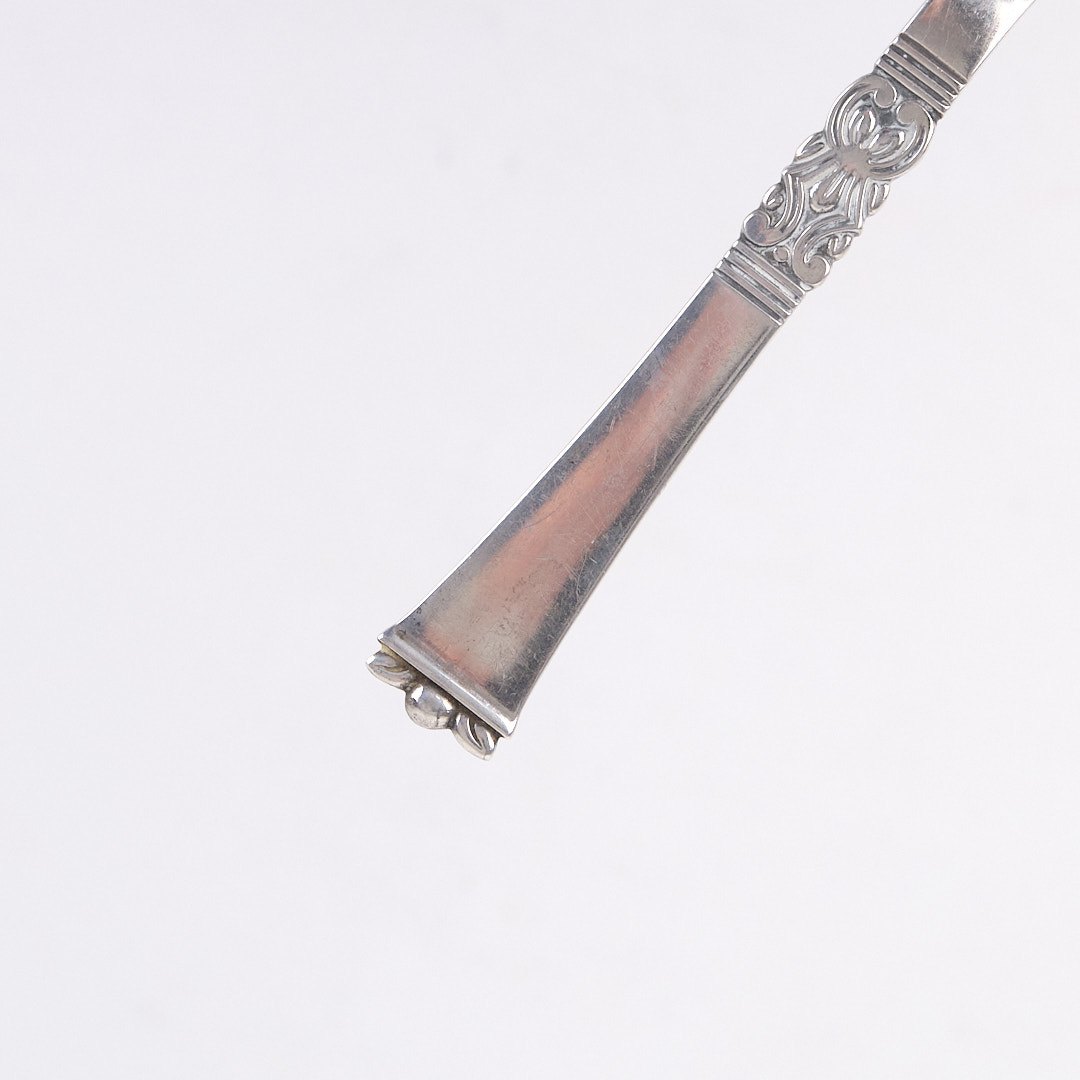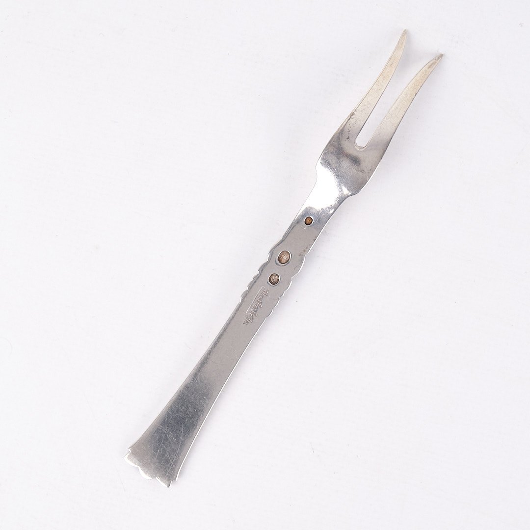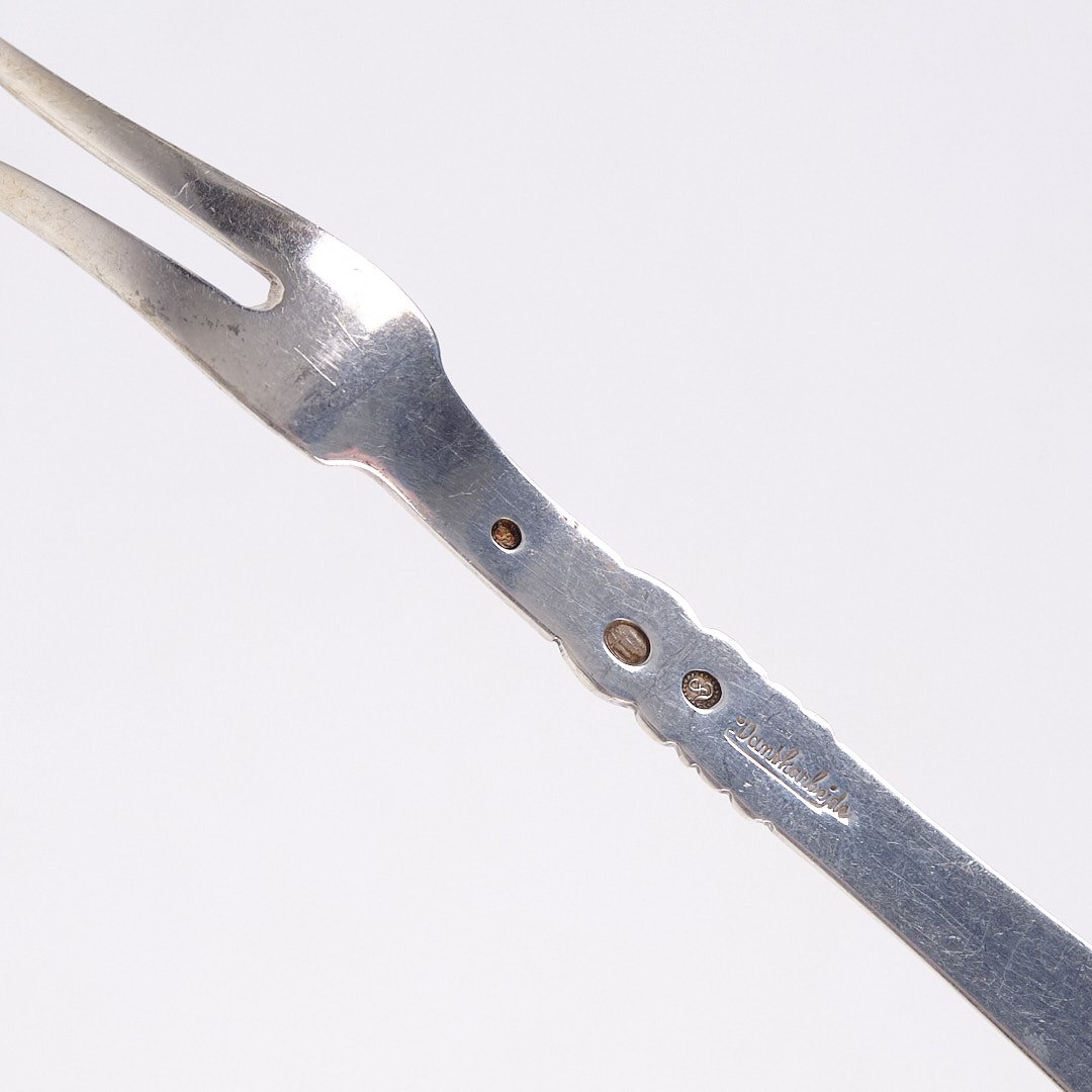 Beskrivelse: Pålægsgaffel i Rigsmønstret design af Poul Frigast. Sølv 830s fra 1930’erne.