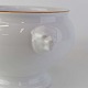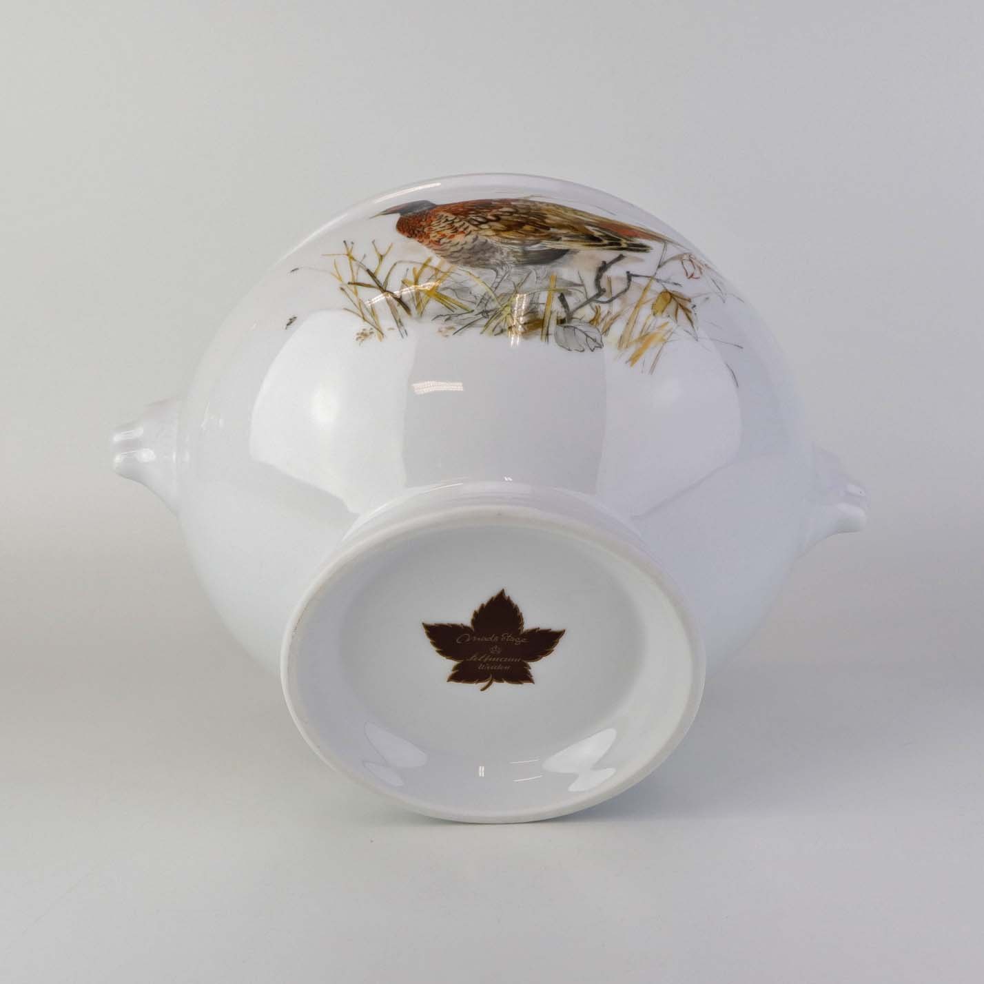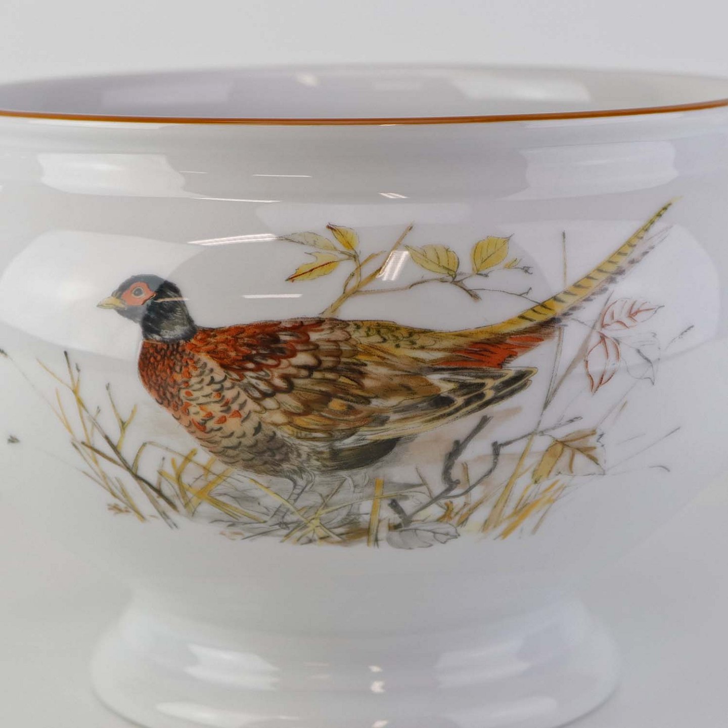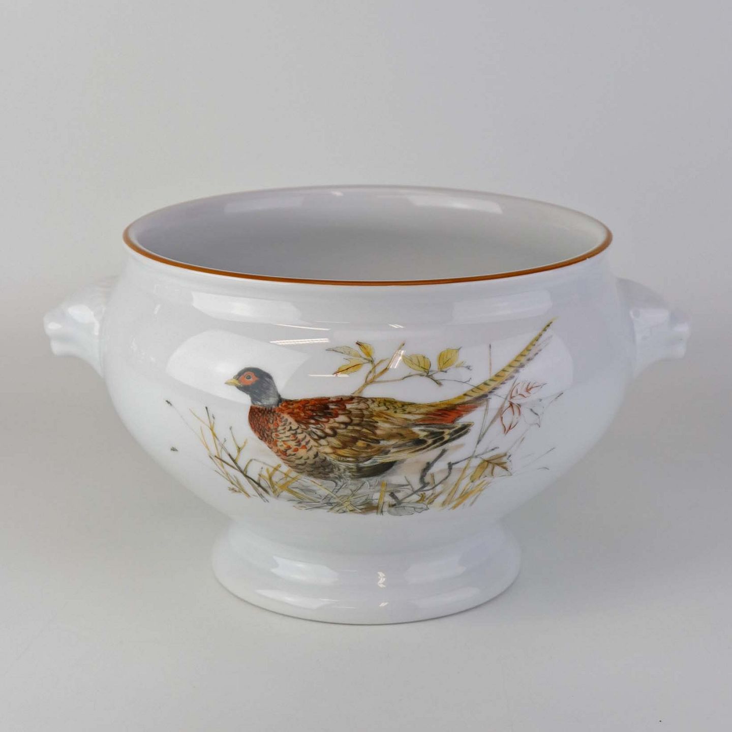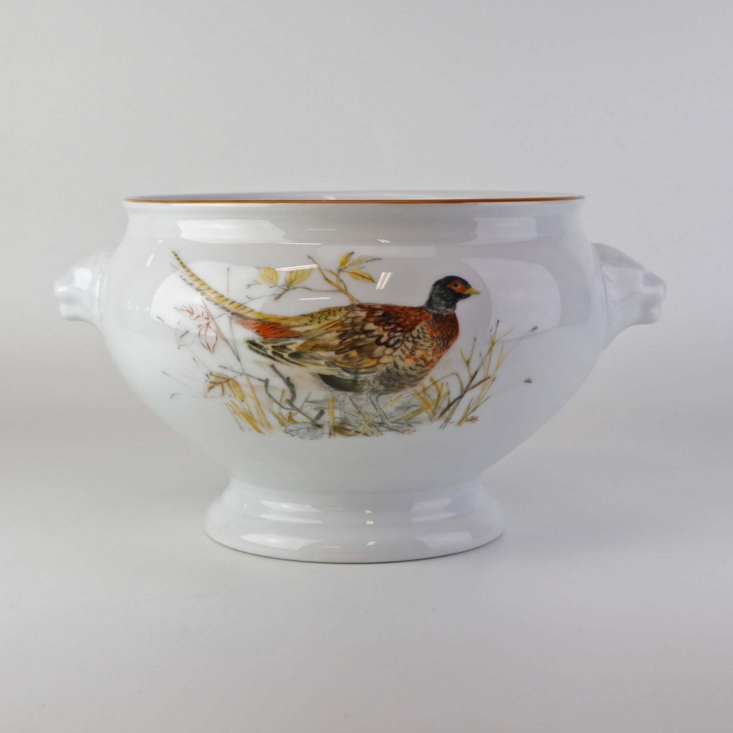 Beskrivelse: Rund skål på fod i porcelæn med hanke af grævlingehoveder og med motiv af fasan fra stellet Jagtstel. Nr. 2