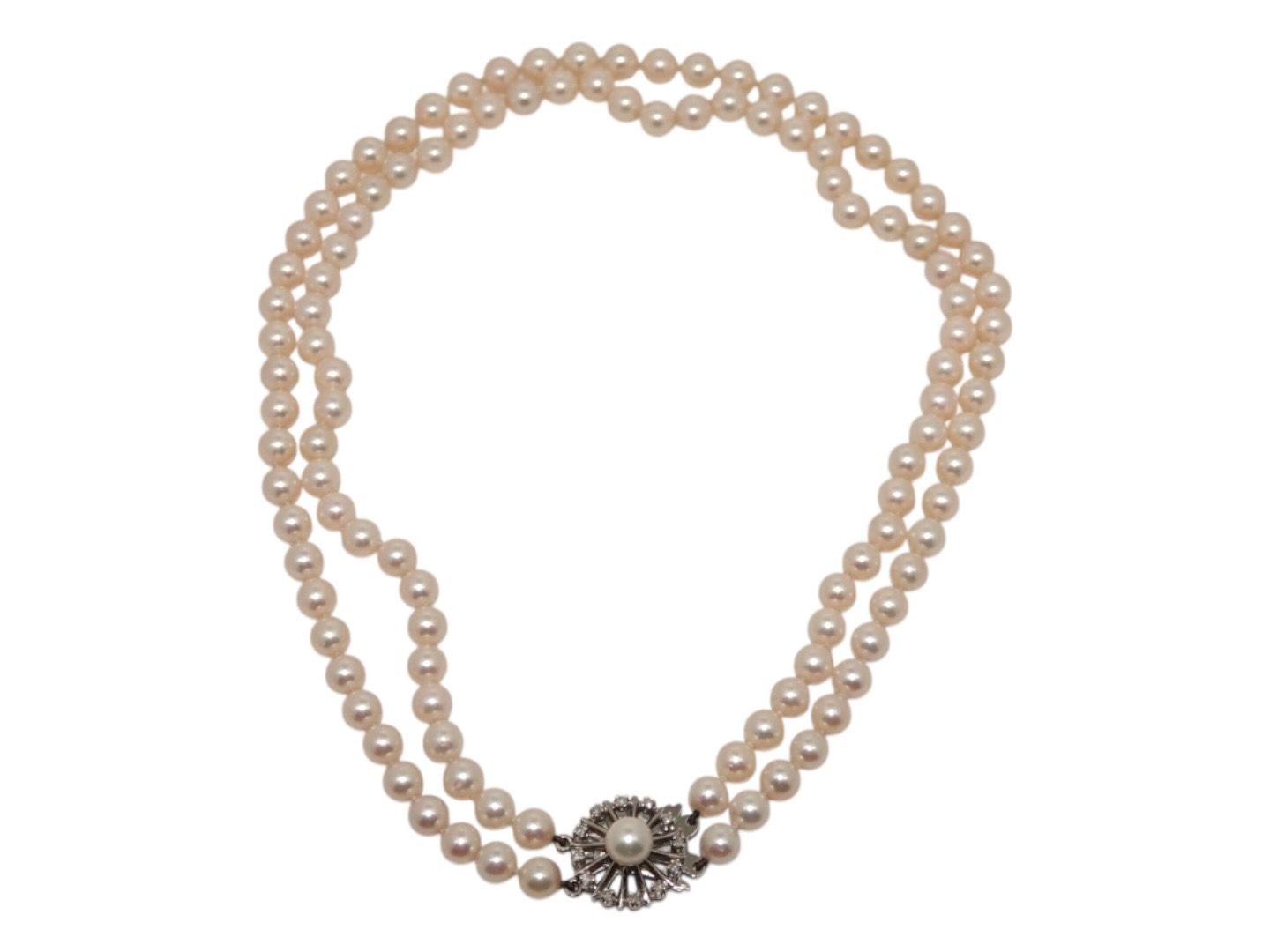 Dobbeltradet perlekæde af store japanske rosa Akoja perler med 14 karat hvidgulds vedhæng med diamanter
