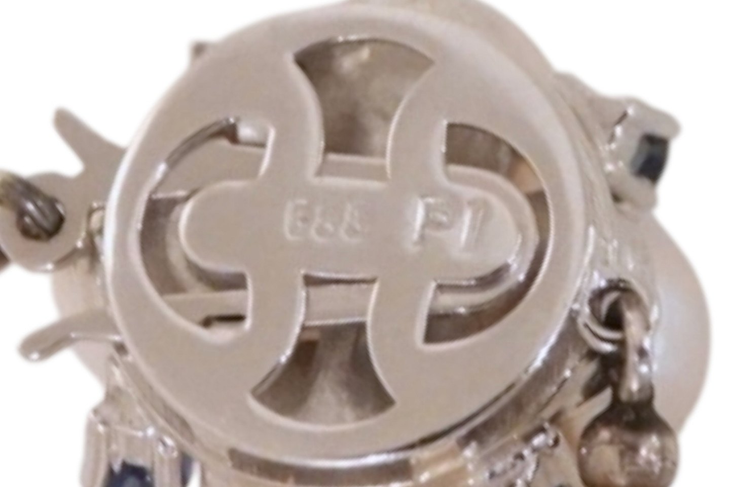 Vedhænget er indfattet i 14 karat hvidglud og flankeret af blå safirer.