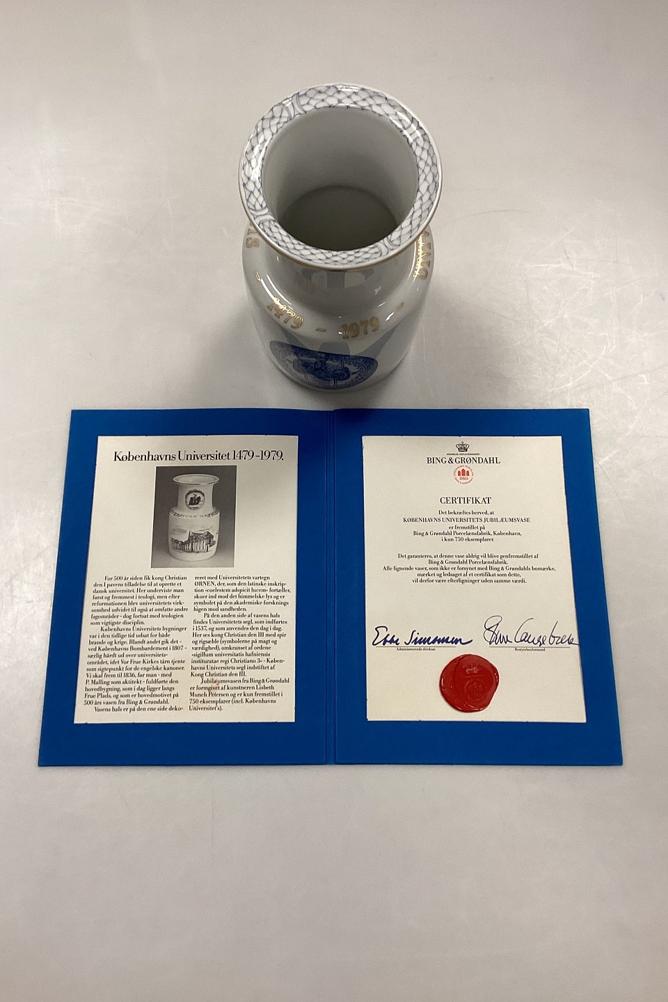 Beskrivelse: Bing og Grøndahl Vase No. 1890/5750 - Københavns Universitet 500 års Jubilæum. Fremstillet i 750 eksemplarer. Indskrift: Universitas Hafniensis - 1479 - 1979. Certifikat medfølger.