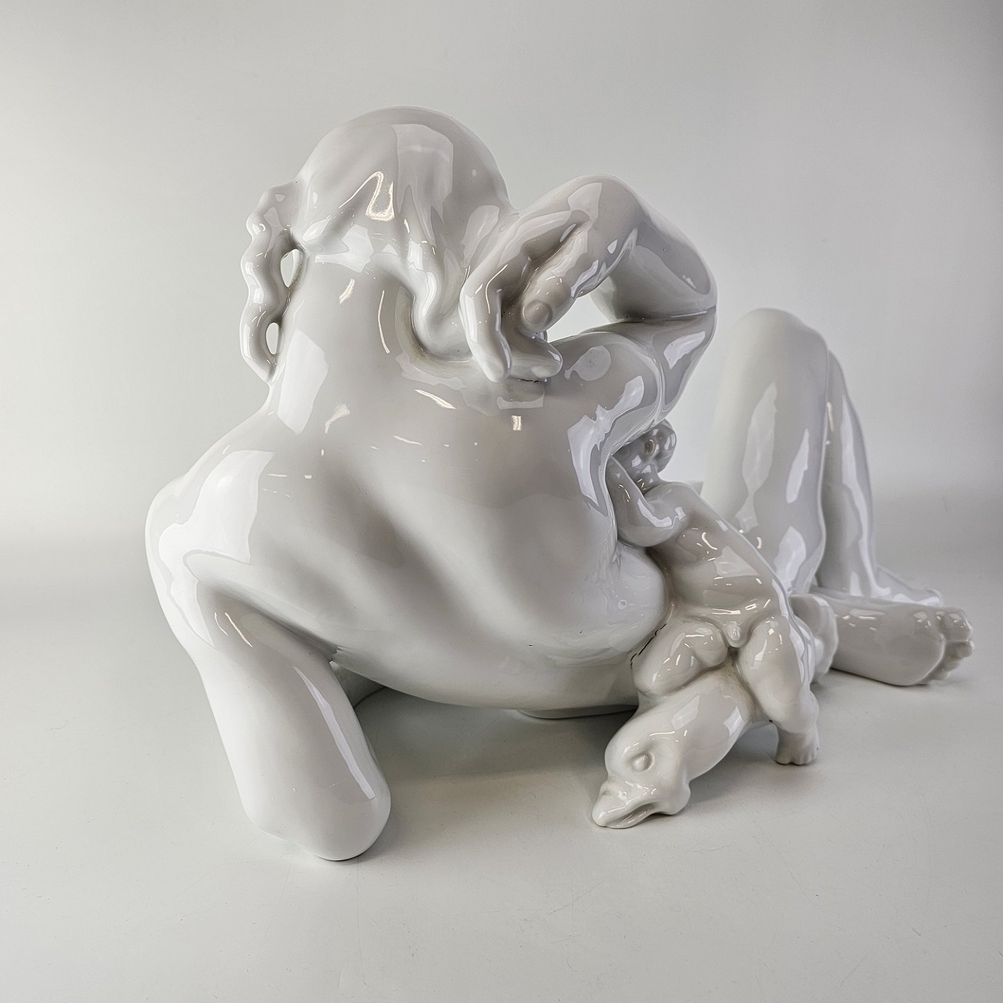 Beskrivelse: Figur i hvidt porcelæn med motiv af en kvinde som ligger med to små børn, kendt under navnene Vandmoderen og Caritas
