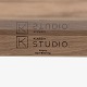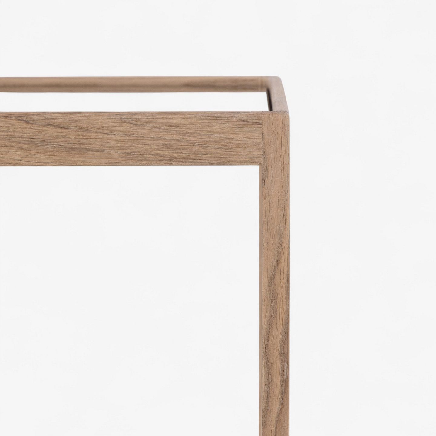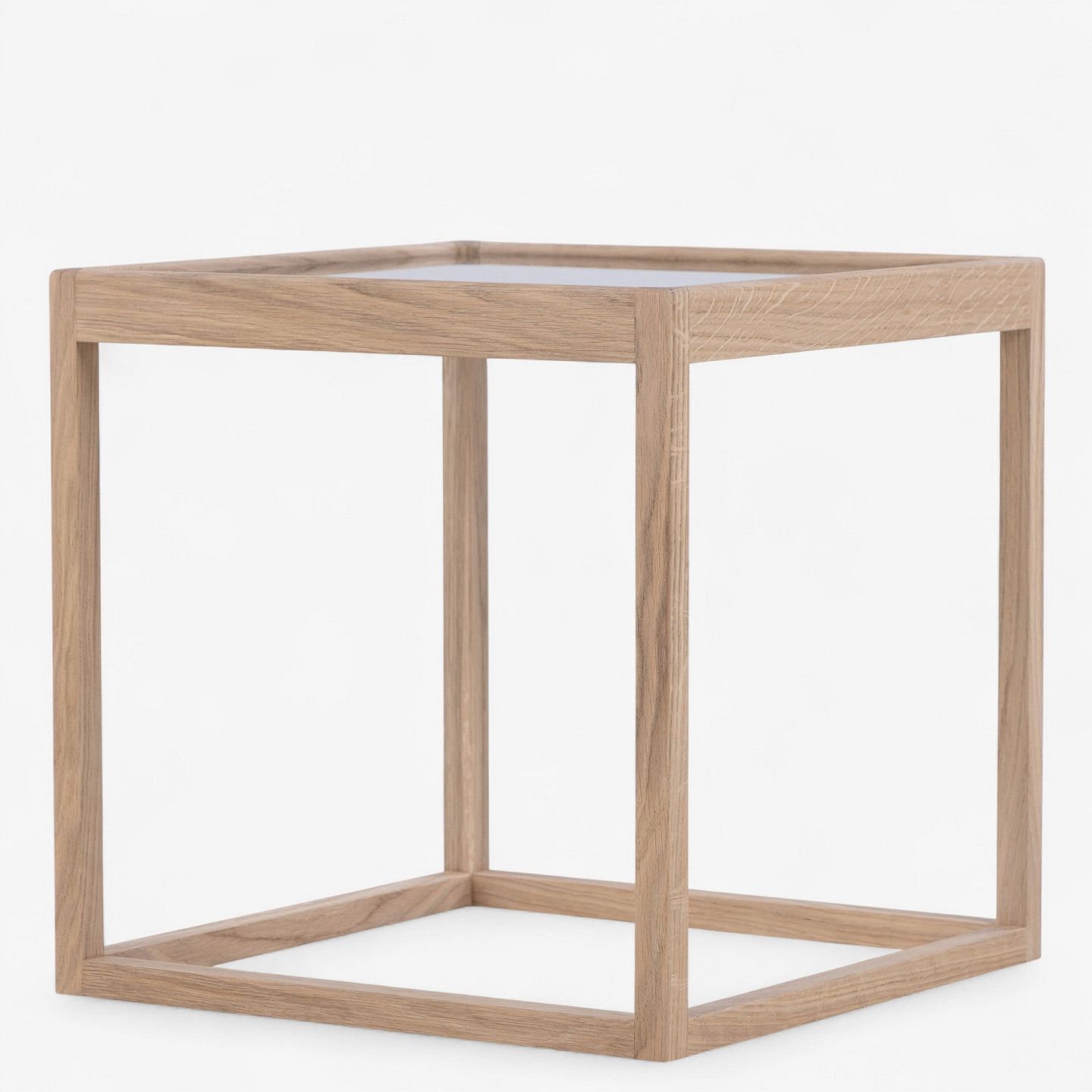 'Kubebord' med stel i lyst egetræ og røgfarvet glasplade.