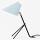 Bordlampe i sortlakeret metal med messing detaljer og blå skærm.