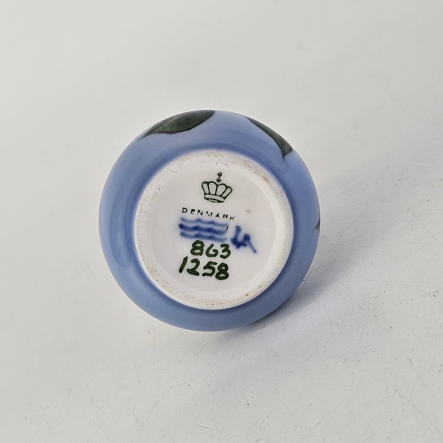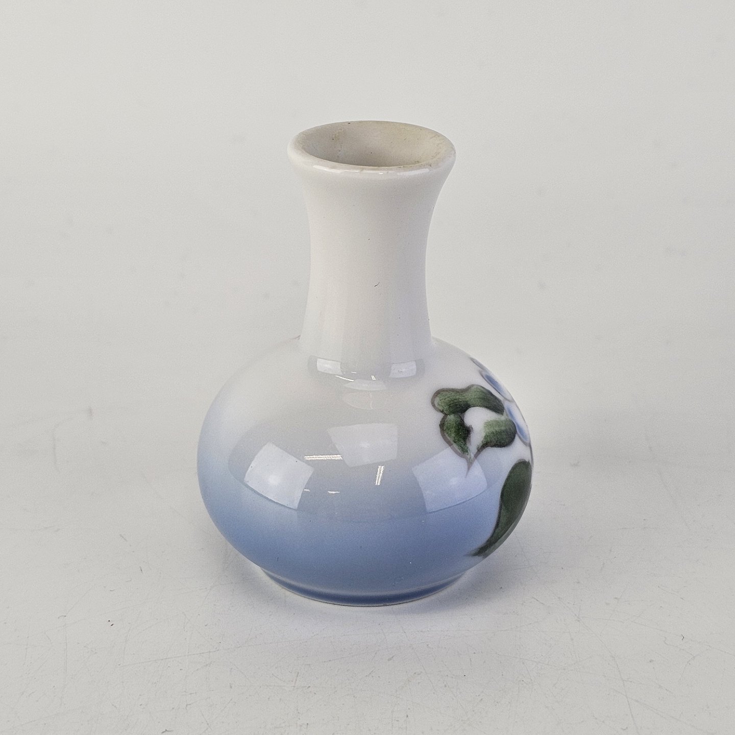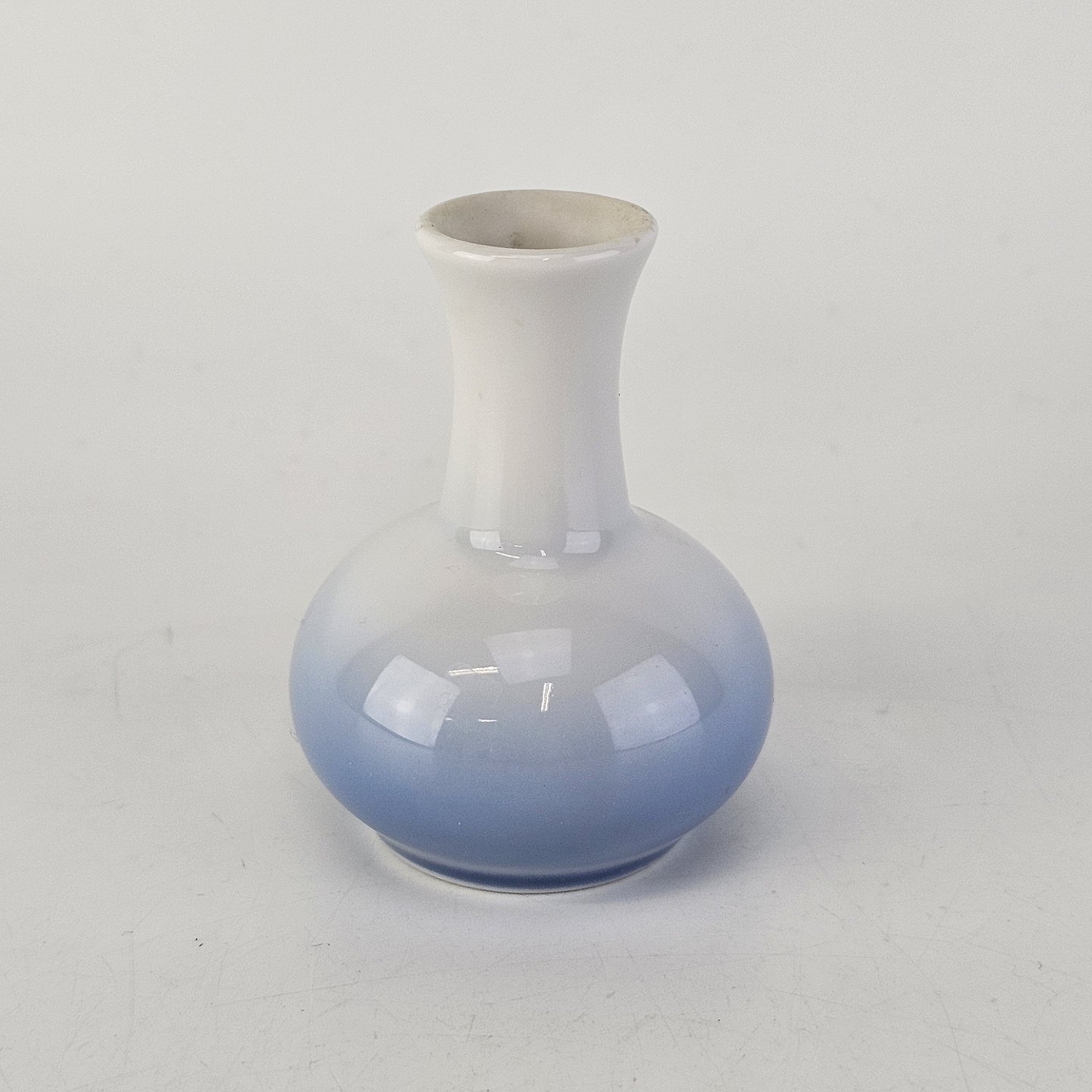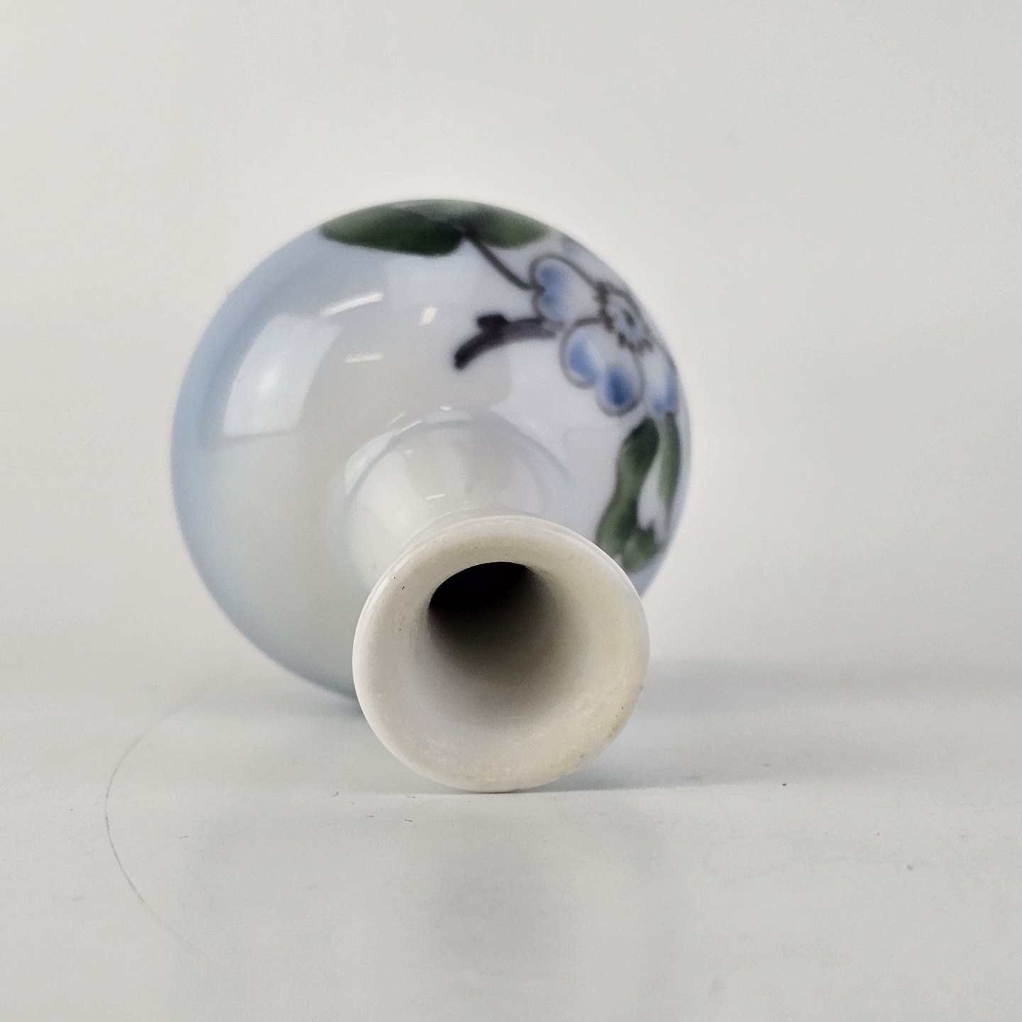Beskrivelse: Miniature vase i porcelæn med motiv af en æbleblomst på gradueret blå baggrund