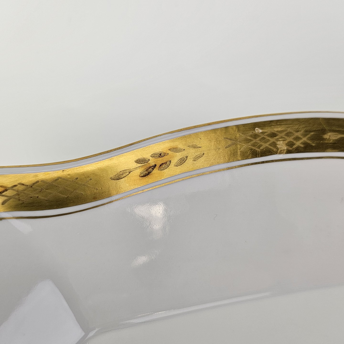 Fremstår med små misfarvninger i guldkanten og et lille hul i kanten på undersiden