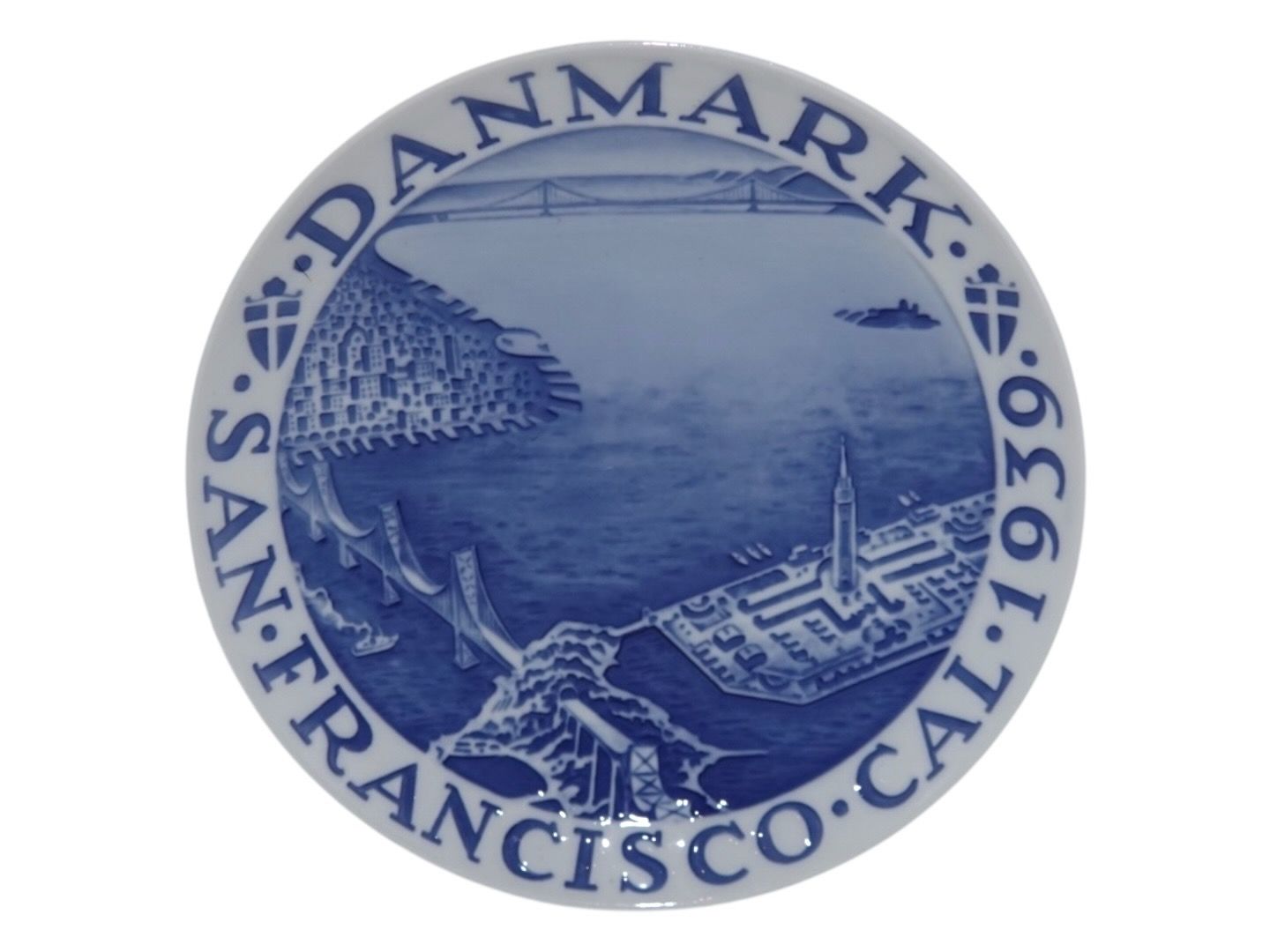Beskrivelse: Bing & Grøndahl Mindeplatte fra 1939 med teksten: "Danmark San Fransisco Cal (Californien) 1939".