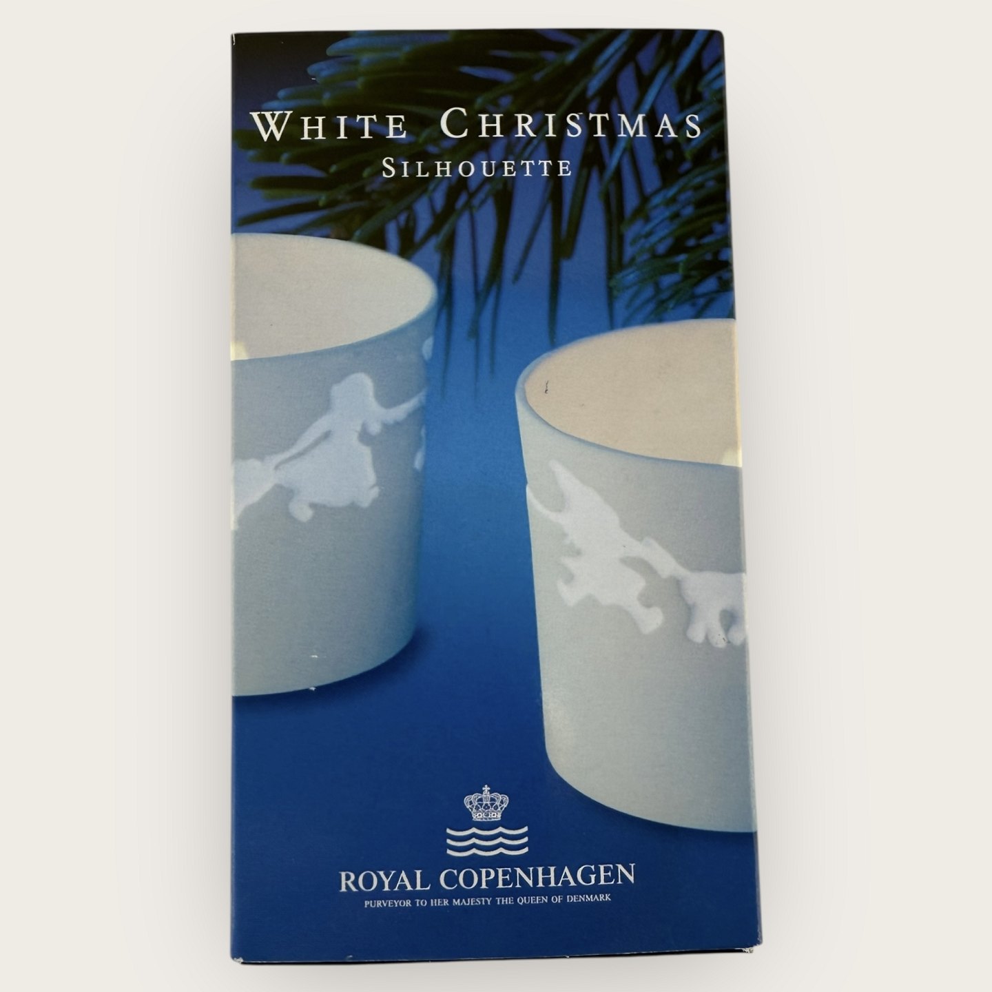 Beskrivelse: Royal Copenhagen, Silhouette, fyrfadslyssestager med dansende nisser, 2 stk i originalæske.