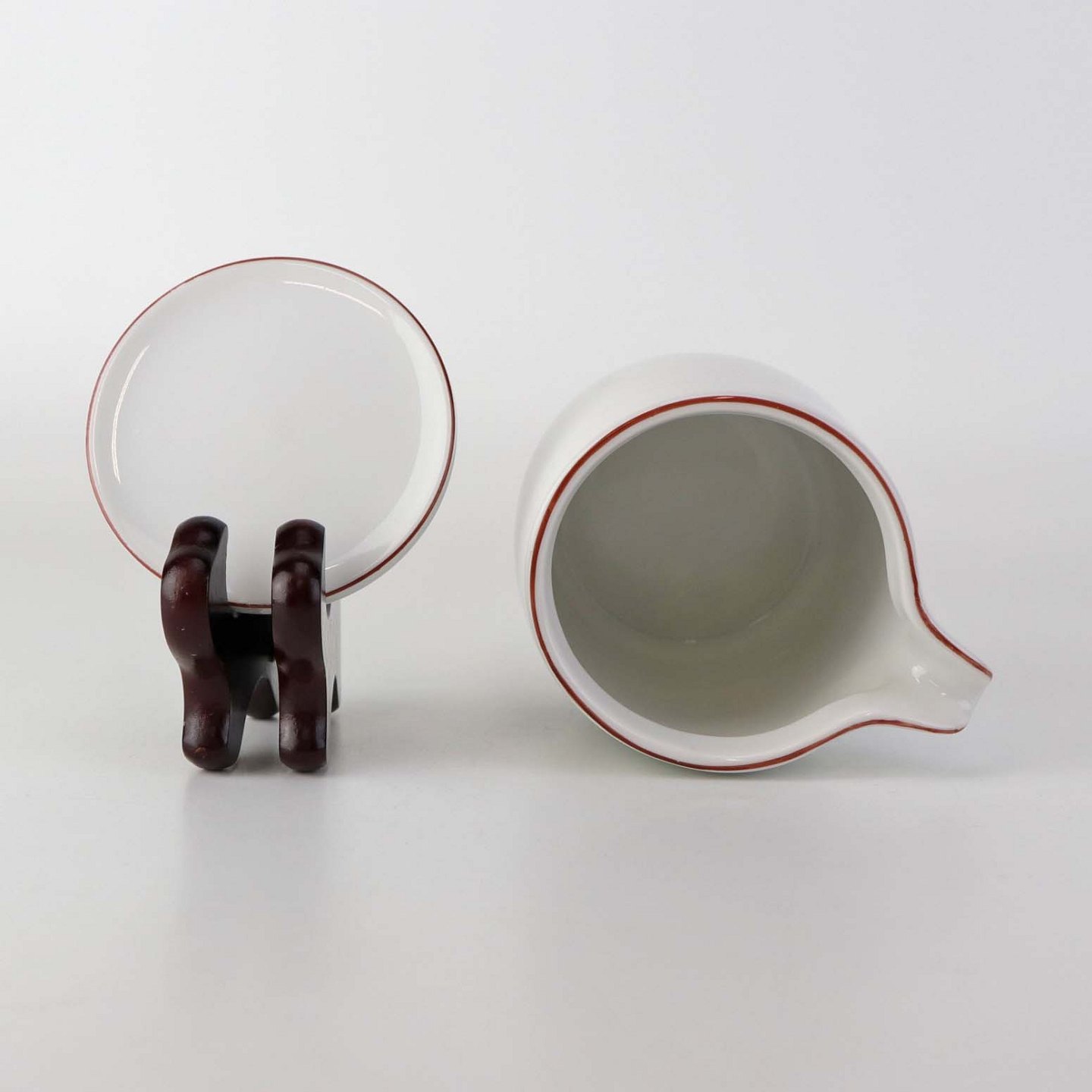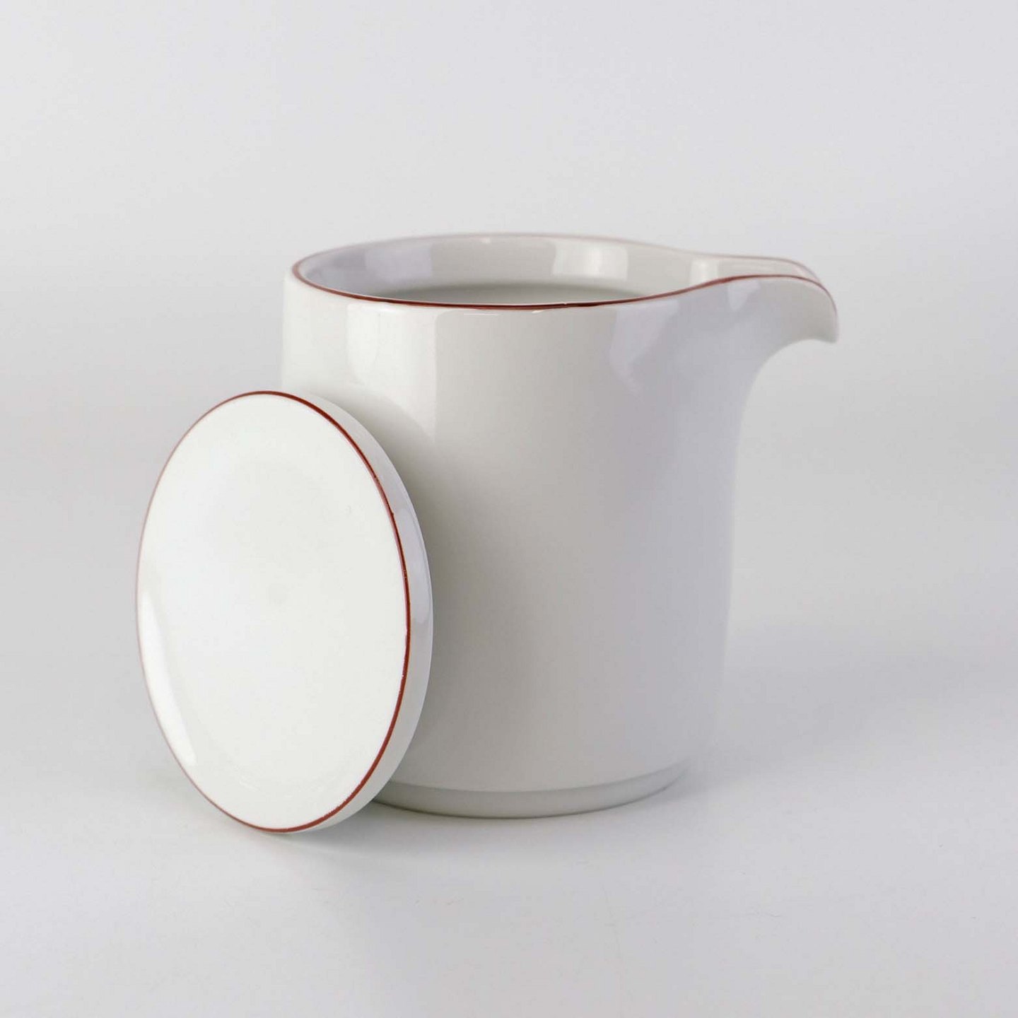 Service i glat hvidt porcelæn med dekoration i tynd rød streg.