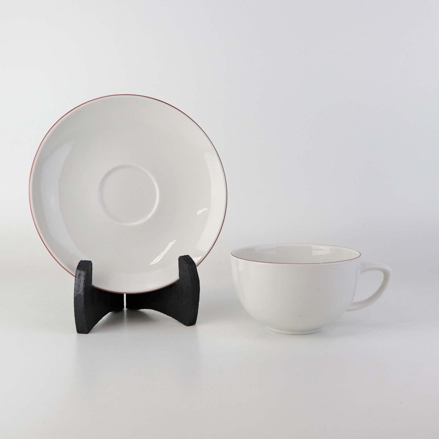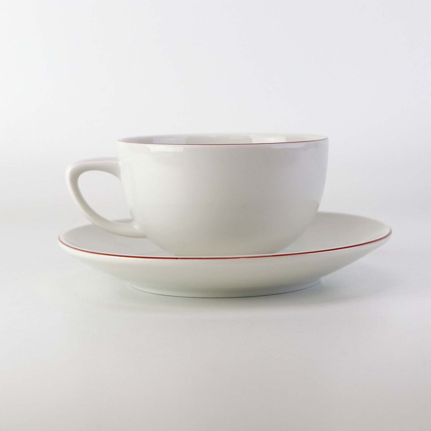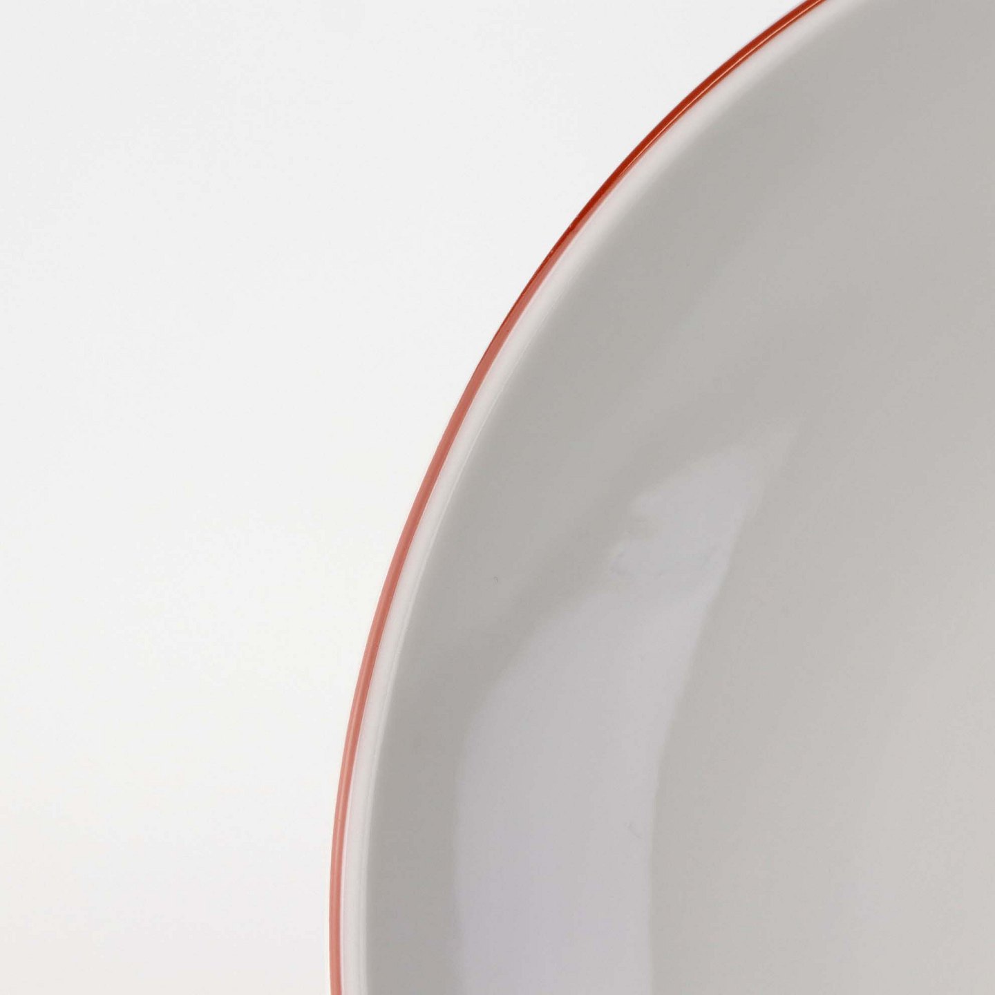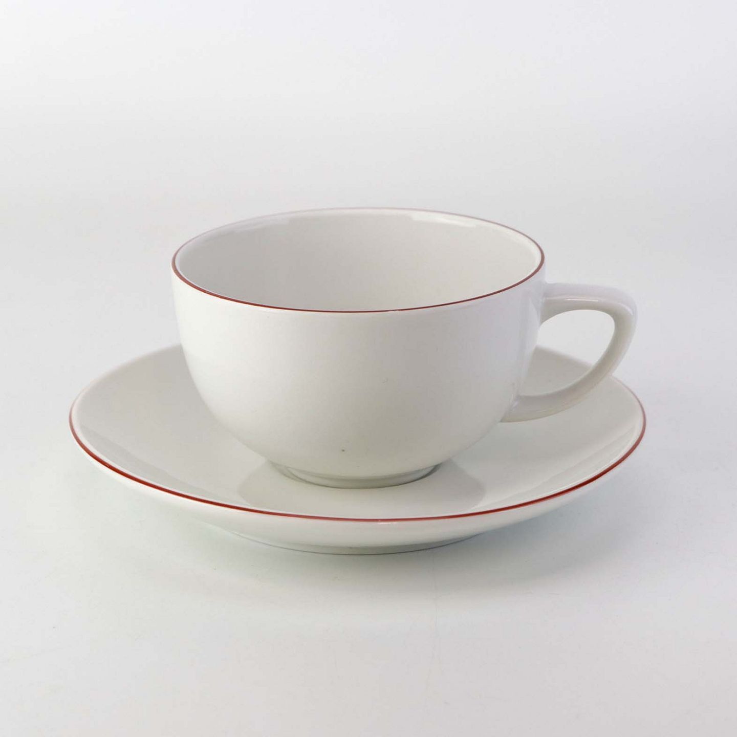 Service i glat hvidt porcelæn med dekoration i tynd rød streg.