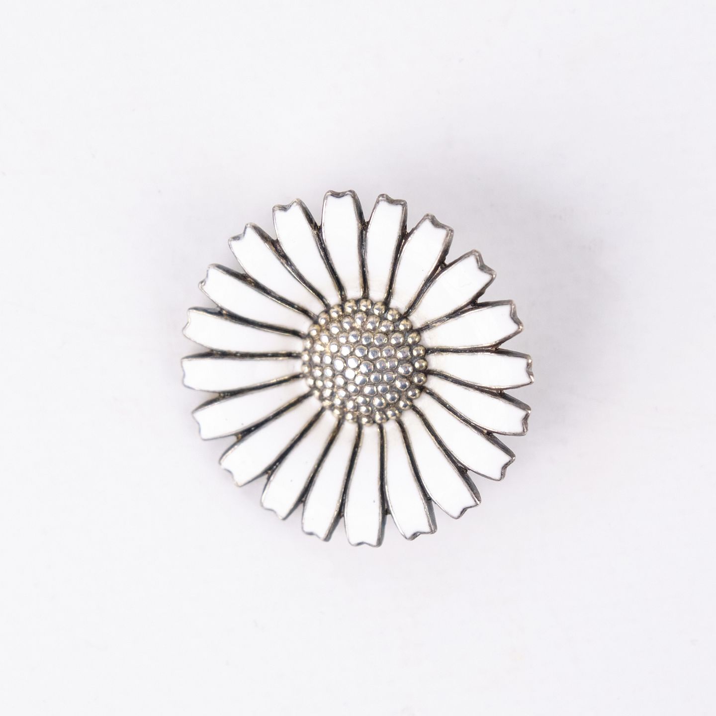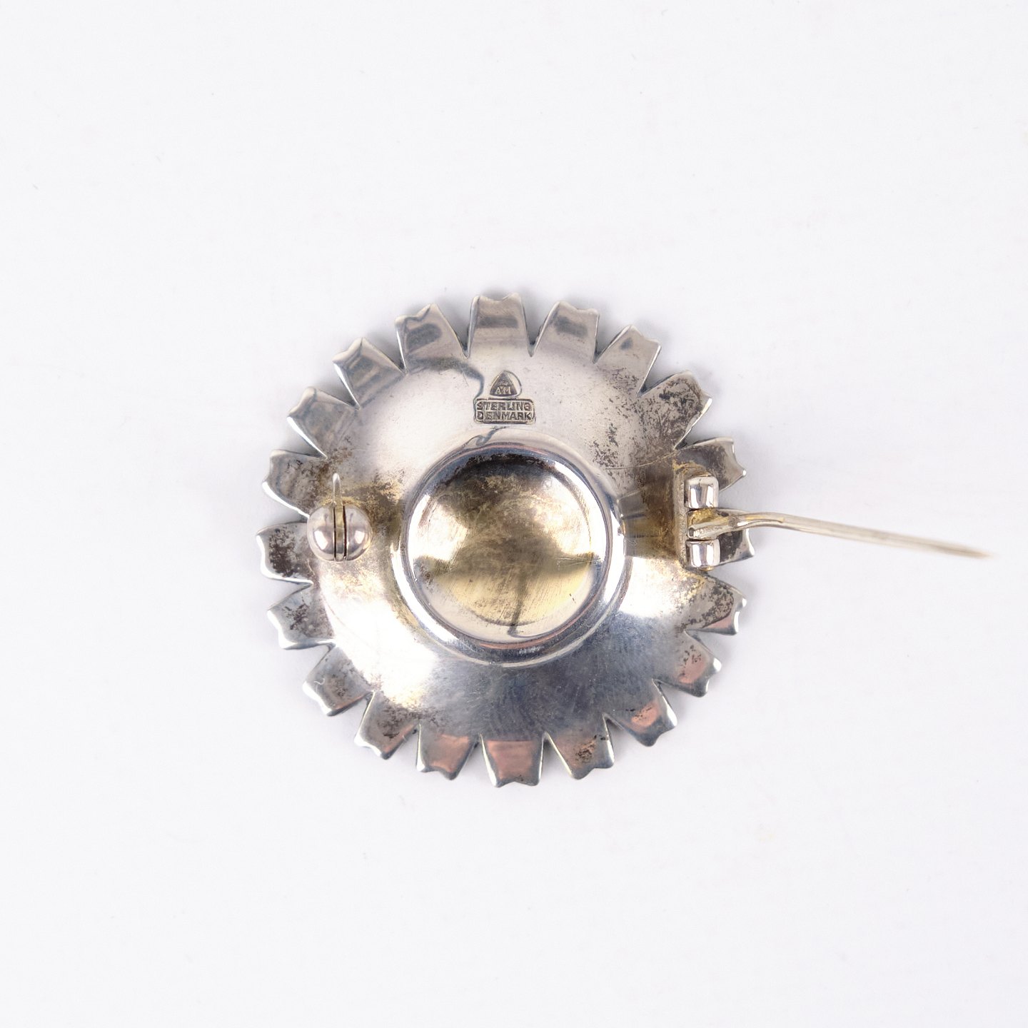 Beskrivelse: Broche fra 1940’erne udført af Anton Michelsen, stemplet AM Sterling Danmark. Forgyldt og med intakt emalje, udført i klassisk dansk smykkekunst med karakteristisk marguerit- eller blomsterinspireret formsprog. Et tidstypisk og dekorativt smykke fra en anerkendt producent.
