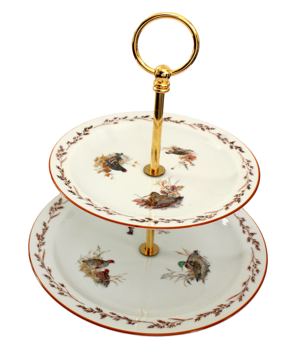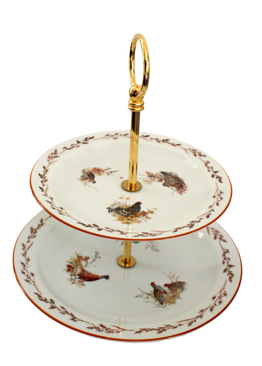 Beskrivelse: Jagtstellet designet af Mads Stage for Imerco. Tallerken etagere, Tallerken opsats. Yderst sjælden. Der er 3 forskellige vildtfugle på hver tallerken, som svarer til de 6 vildtfuglemotiver på stellet.