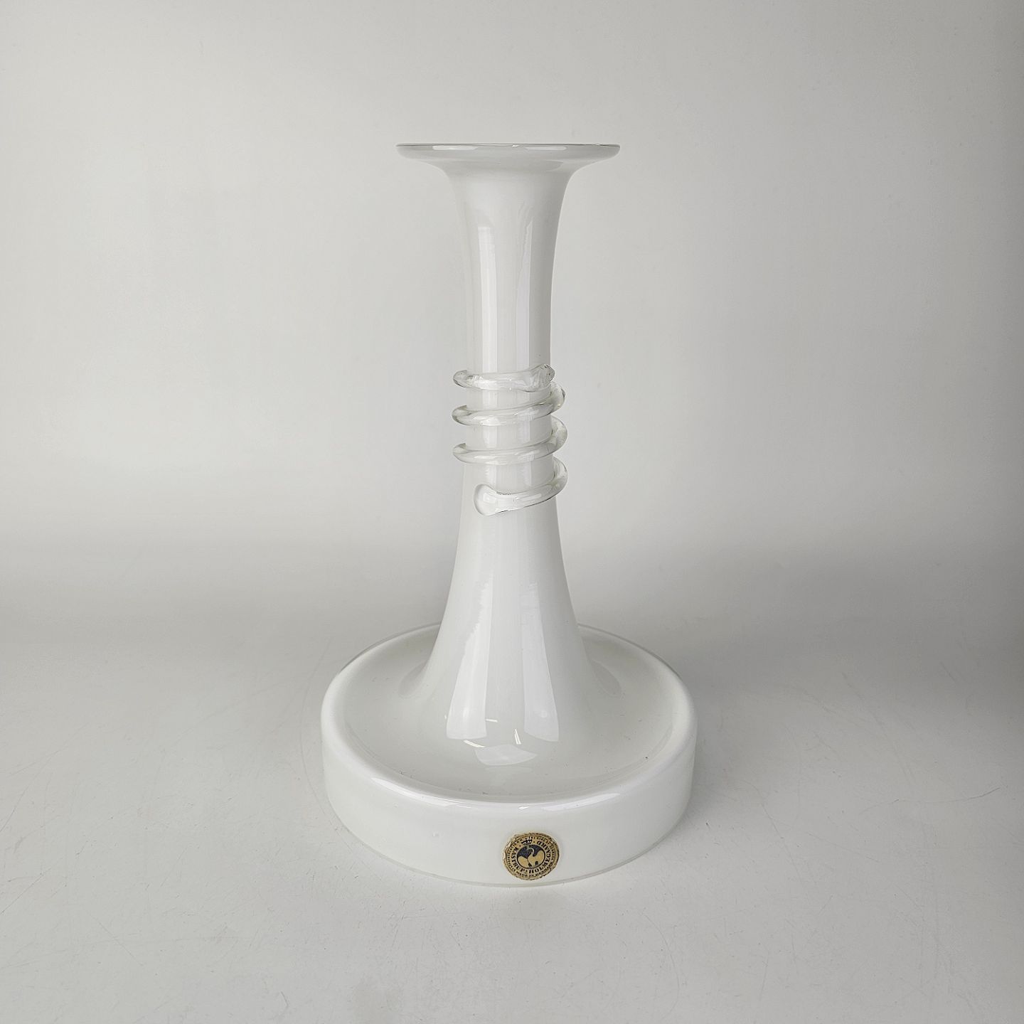 Beskrivelse: Lysestage i hvidt opalglas omviklet med en klar glastråd fra serien Napoli