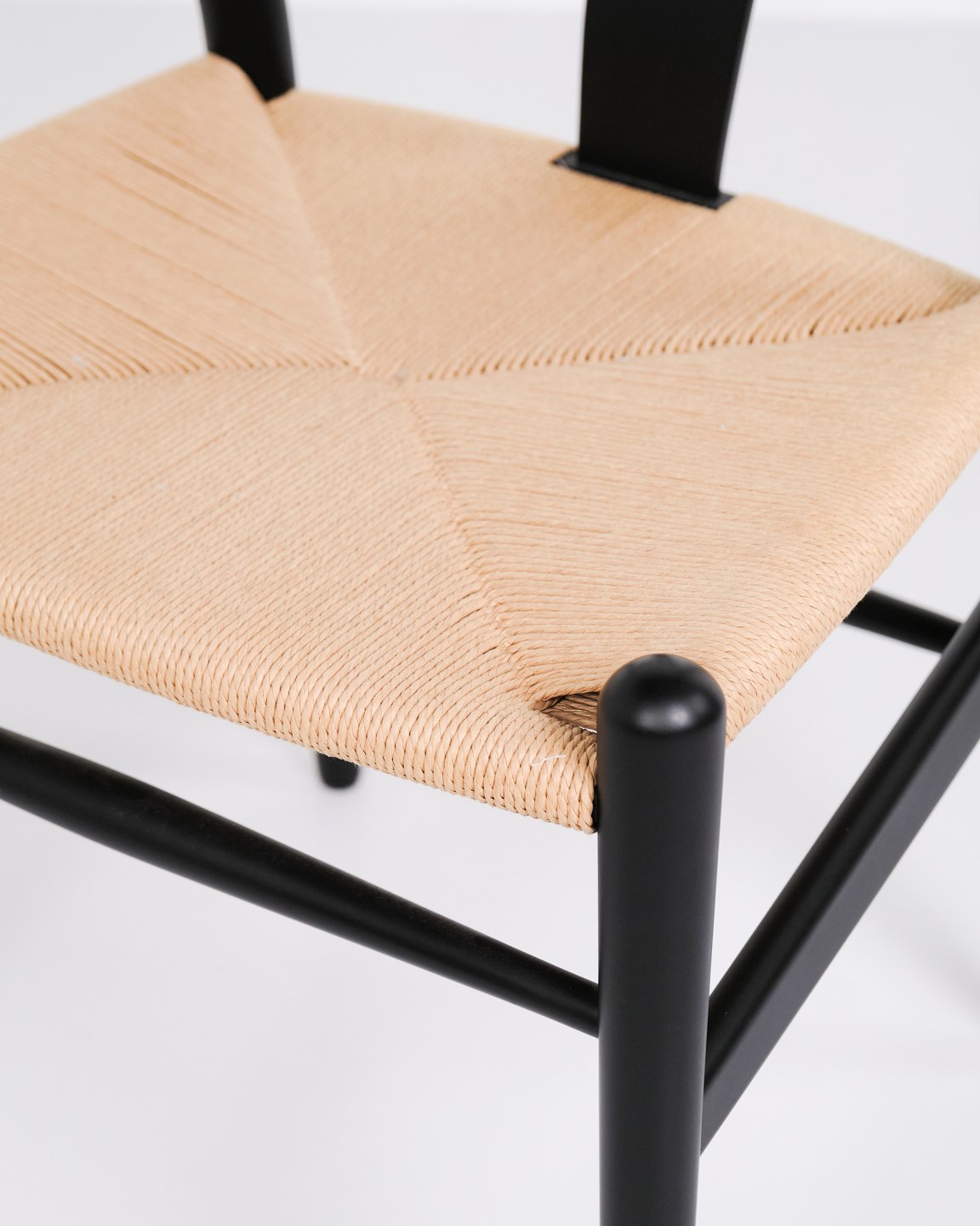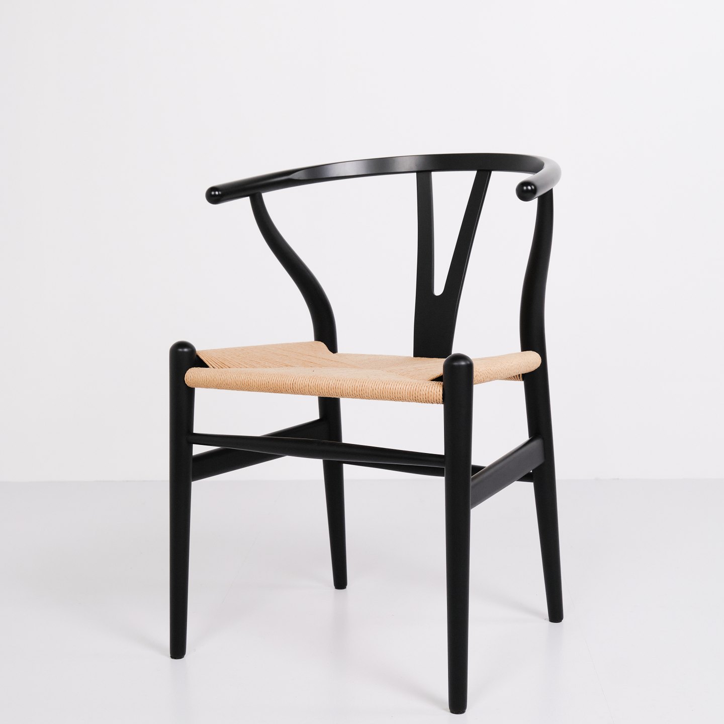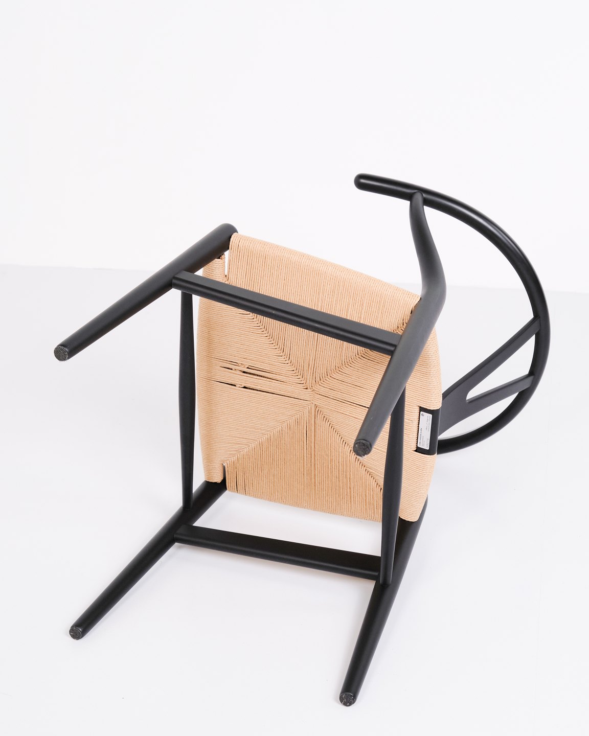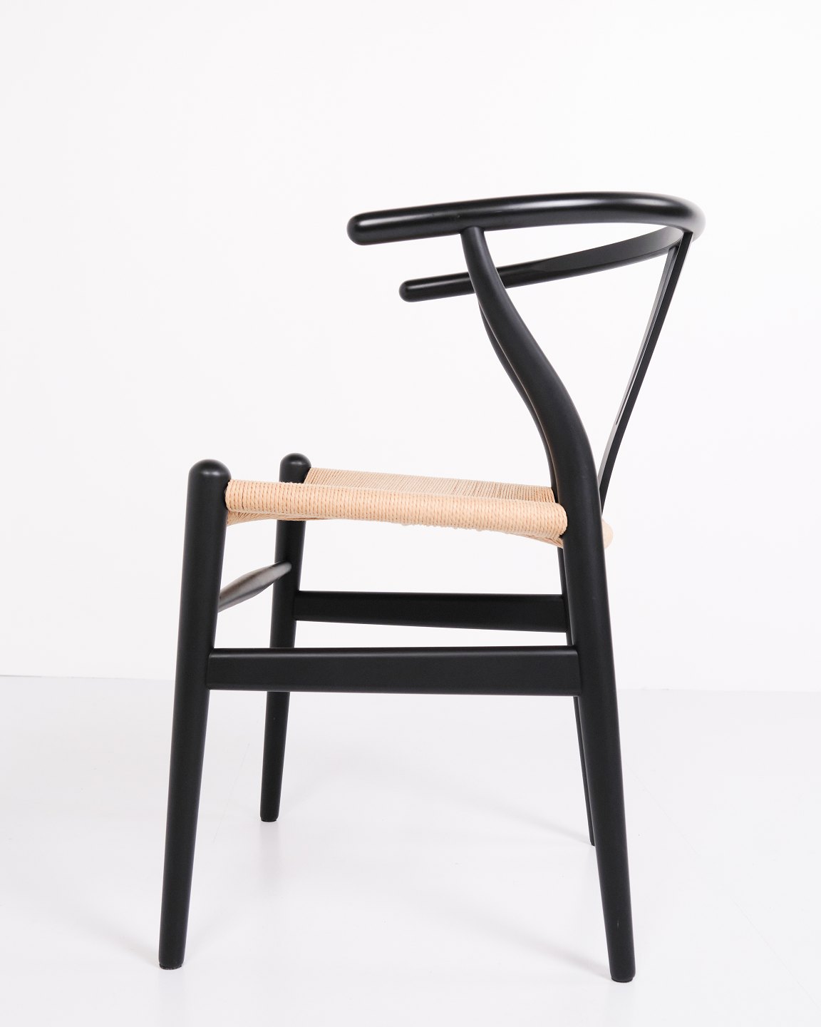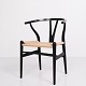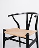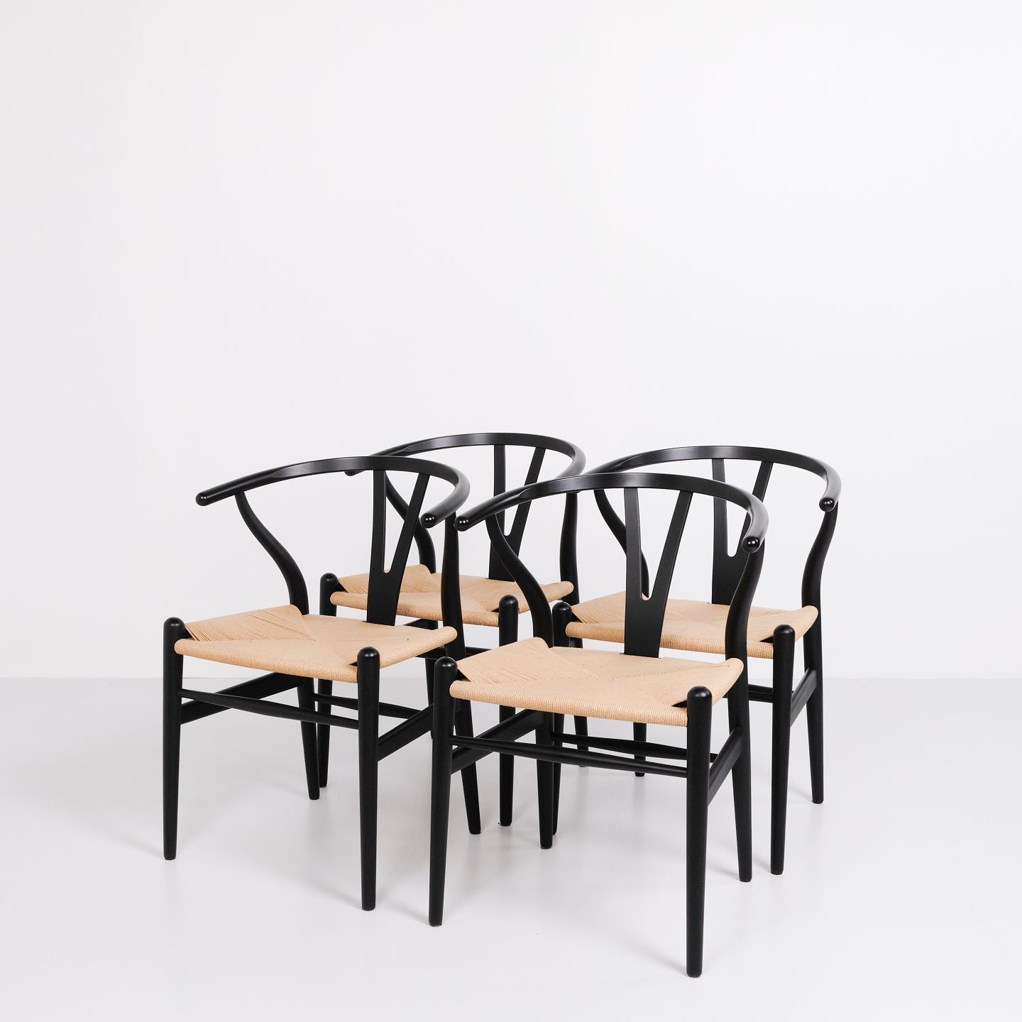 Beskrivelse: Sæt af fire Y-stole, model CH24, designet af Hans J. Wegner og produceret af Carl Hansen & Søn. Stolene er udført i massivt træ, lakeret i Soft Black, og med sæde i flettet naturpapir.