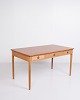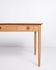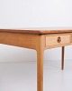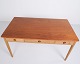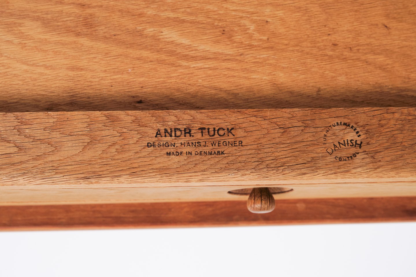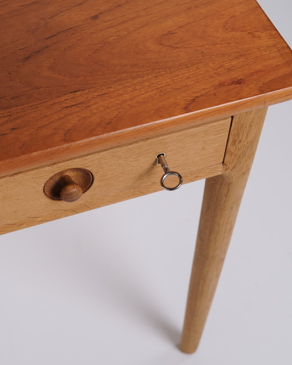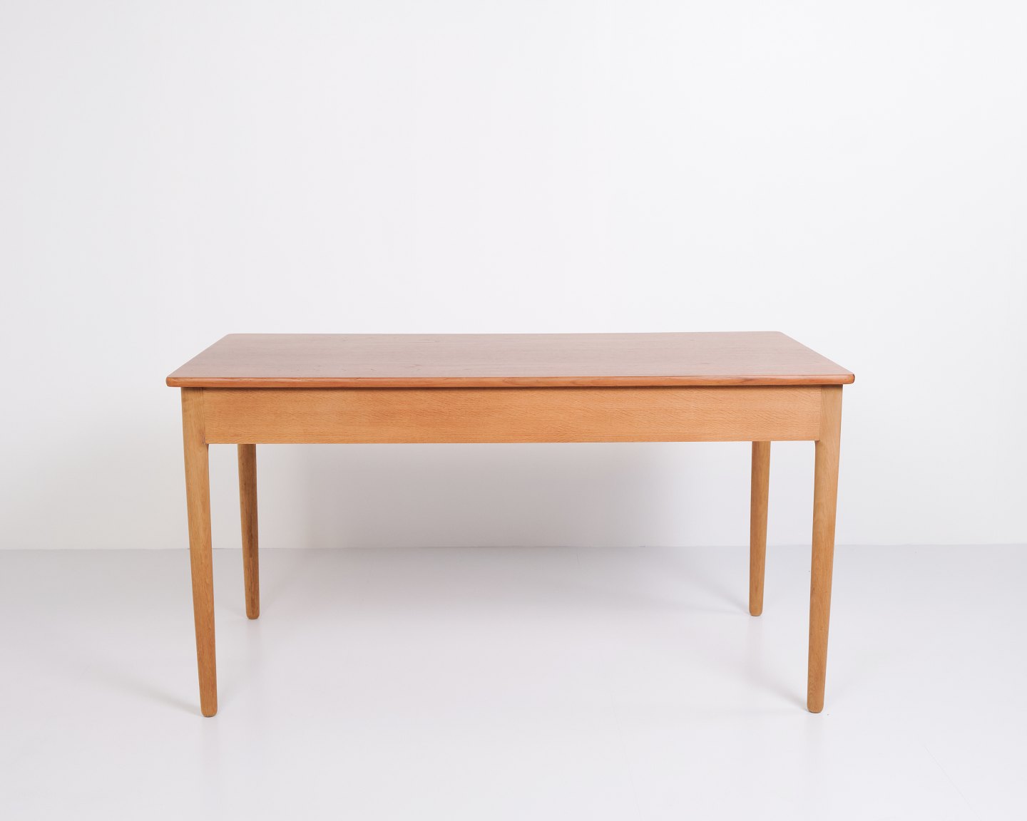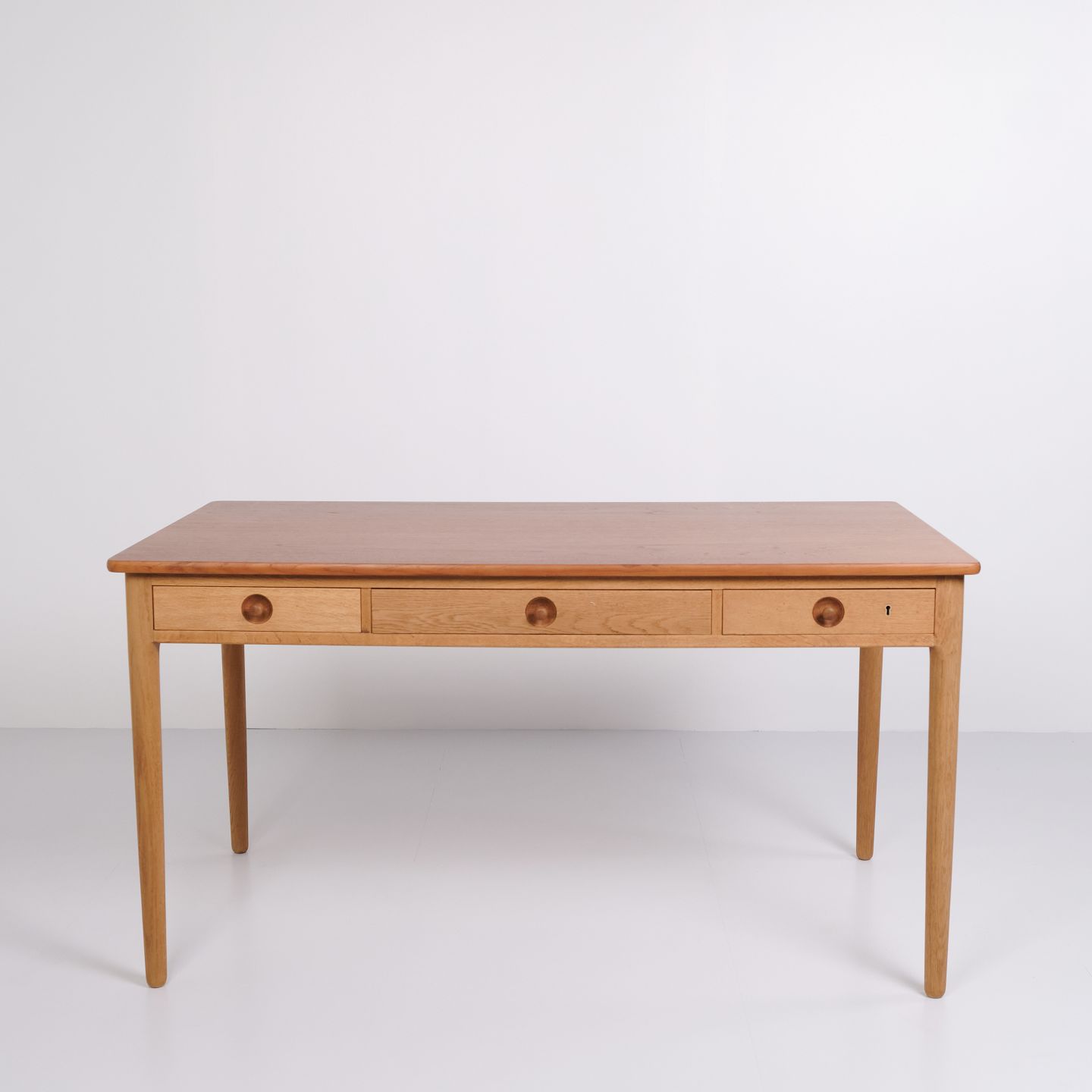 Beskrivelse: Skrivebord designet af Hans J. Wegner og produceret af Andreas Tuck i 1960’erne. Bordet er udført i teak med benkonstruktion i eg – en klassisk materialekombination, der fremhæver Wegners sans for proportioner og naturlig balance. Bordet har skuffer i fronten.