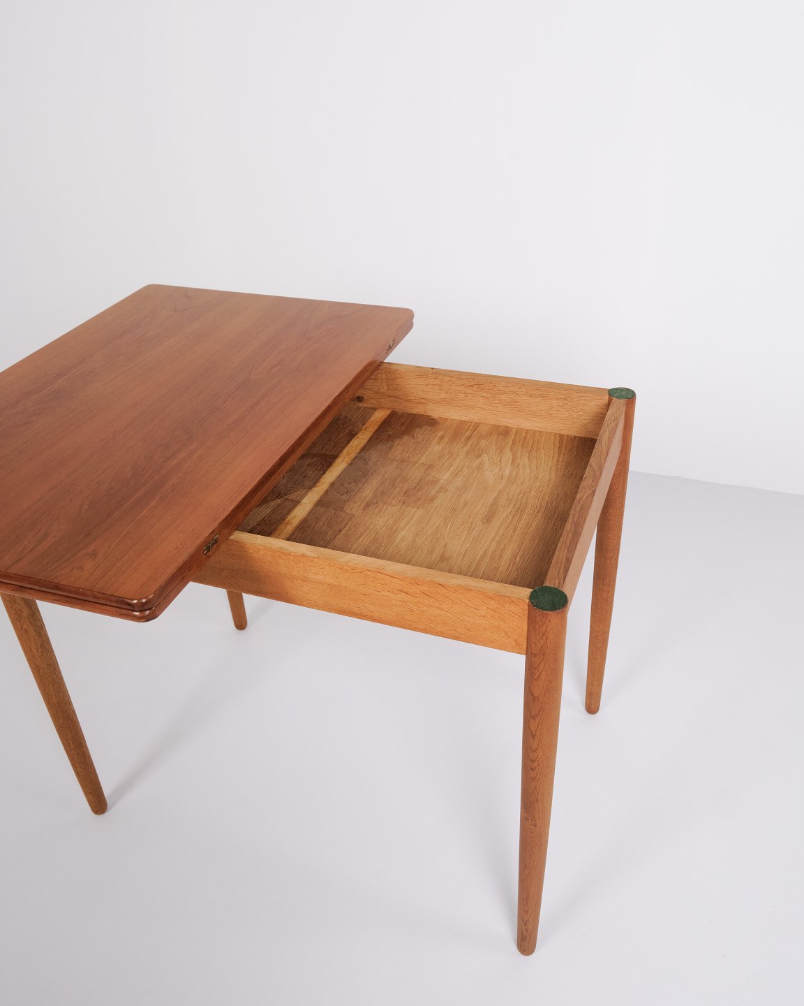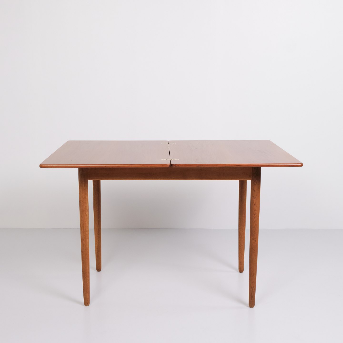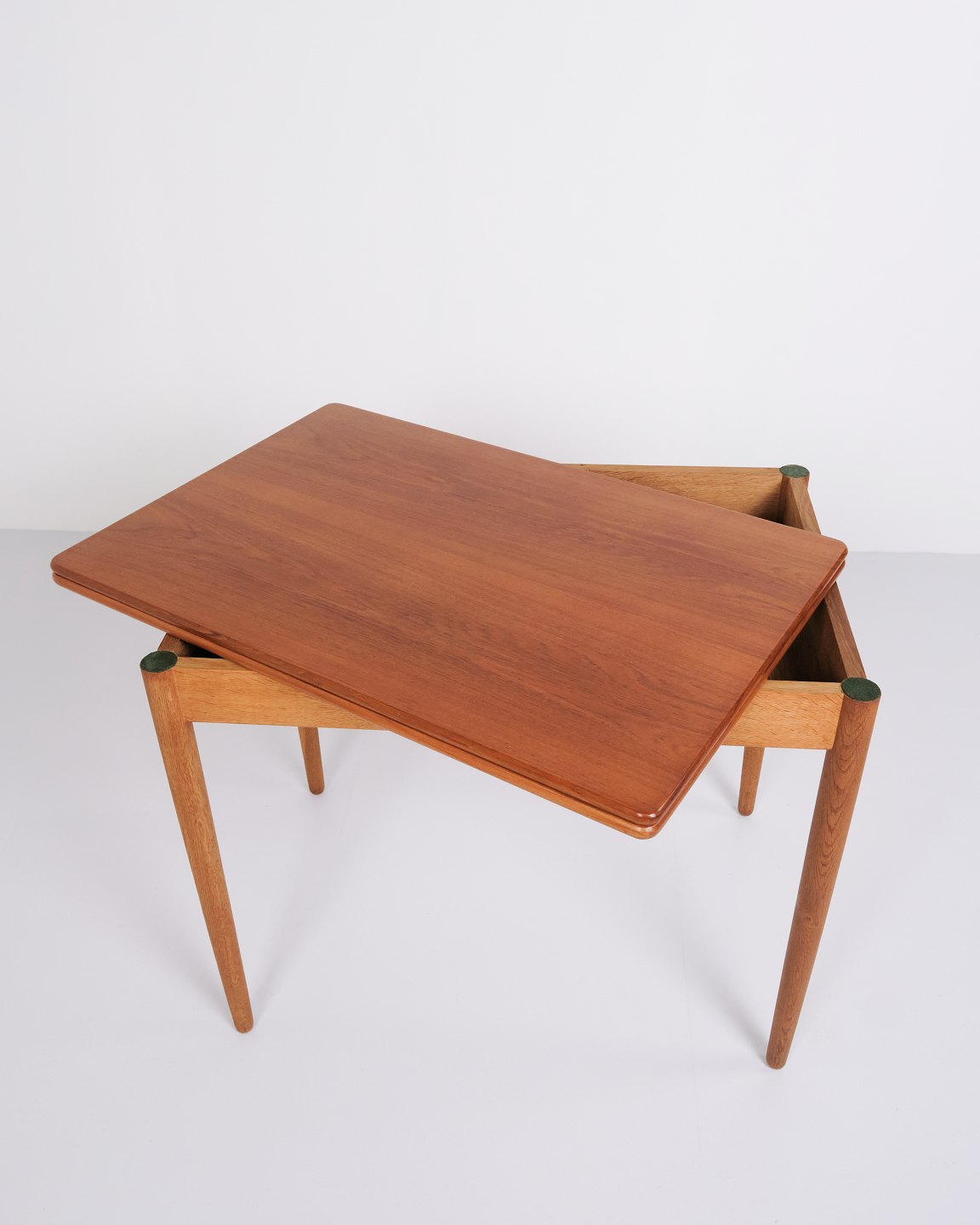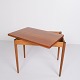 Beskrivelse: Hans J. Wegner spise/spillebord for Andreas Tuck. Teak og eg, 1960’erne. Indbygget opbevaring.