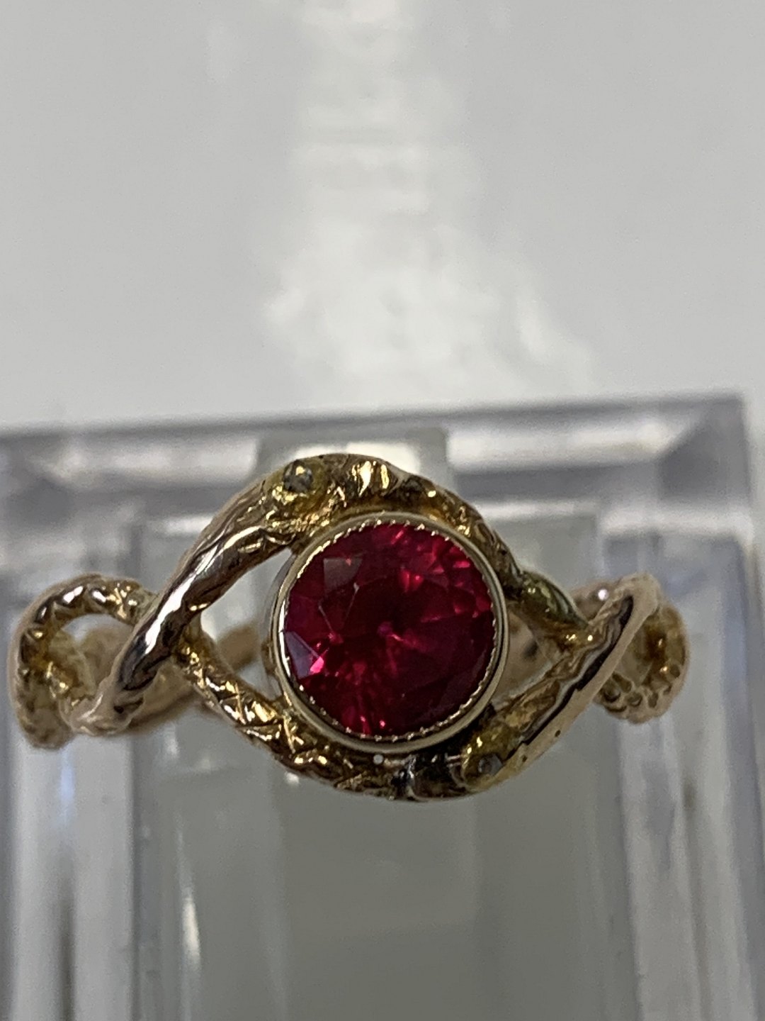 Beskrivelse: Smuk og elegant guldring med flot stor rød sten, og to mindre diamanter. Den røde sten giver ringen liv og styrke, men de to mindre diamanter reflekterer lyset, og giver ringen liv.