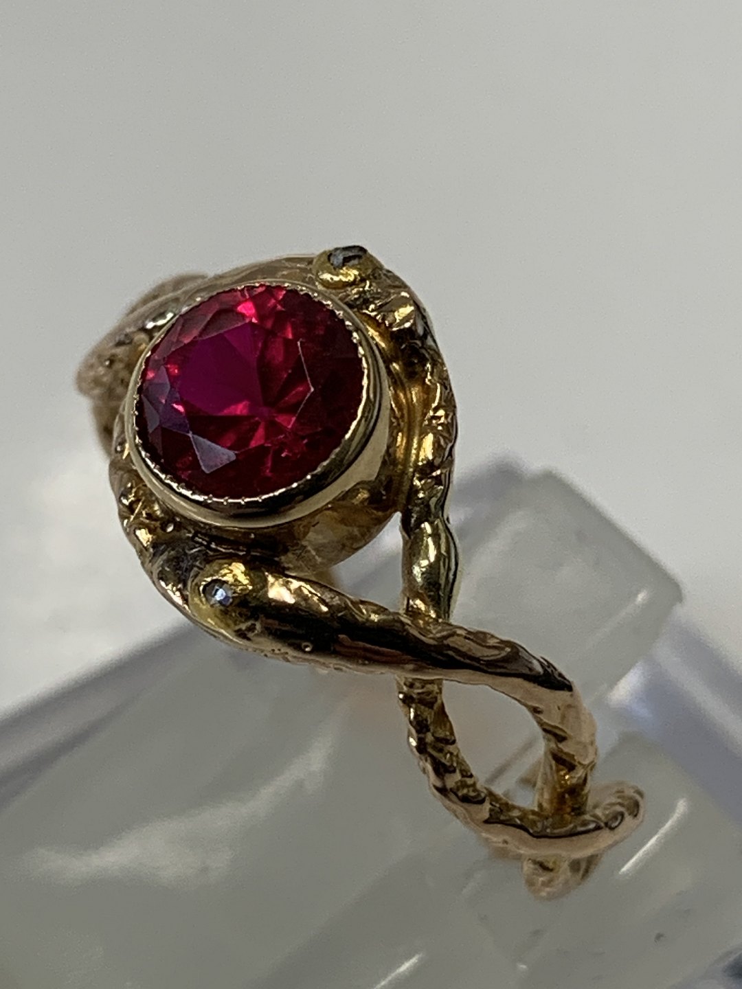 14 karat guldring med rød facetslebet sten og diamanter. Stemplet 585.