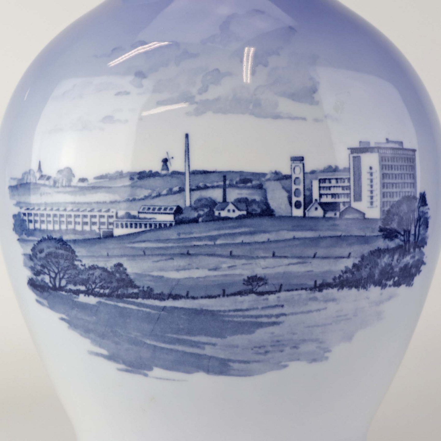 Beskrivelse: Oval jubilæumsvase i kongelig porcelæn med motiv af Danfoss fabriksbygninger. Nr. 3088