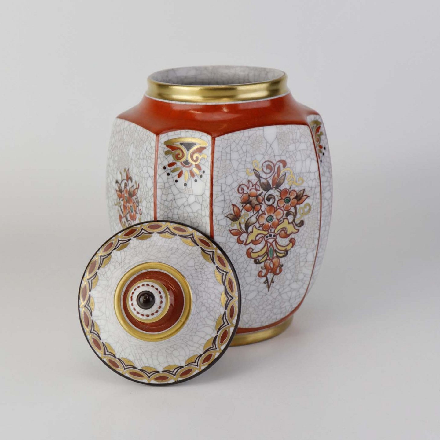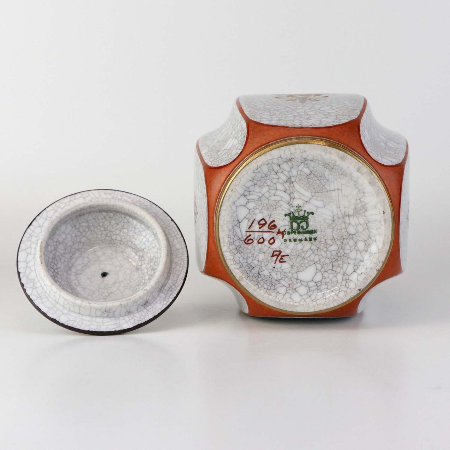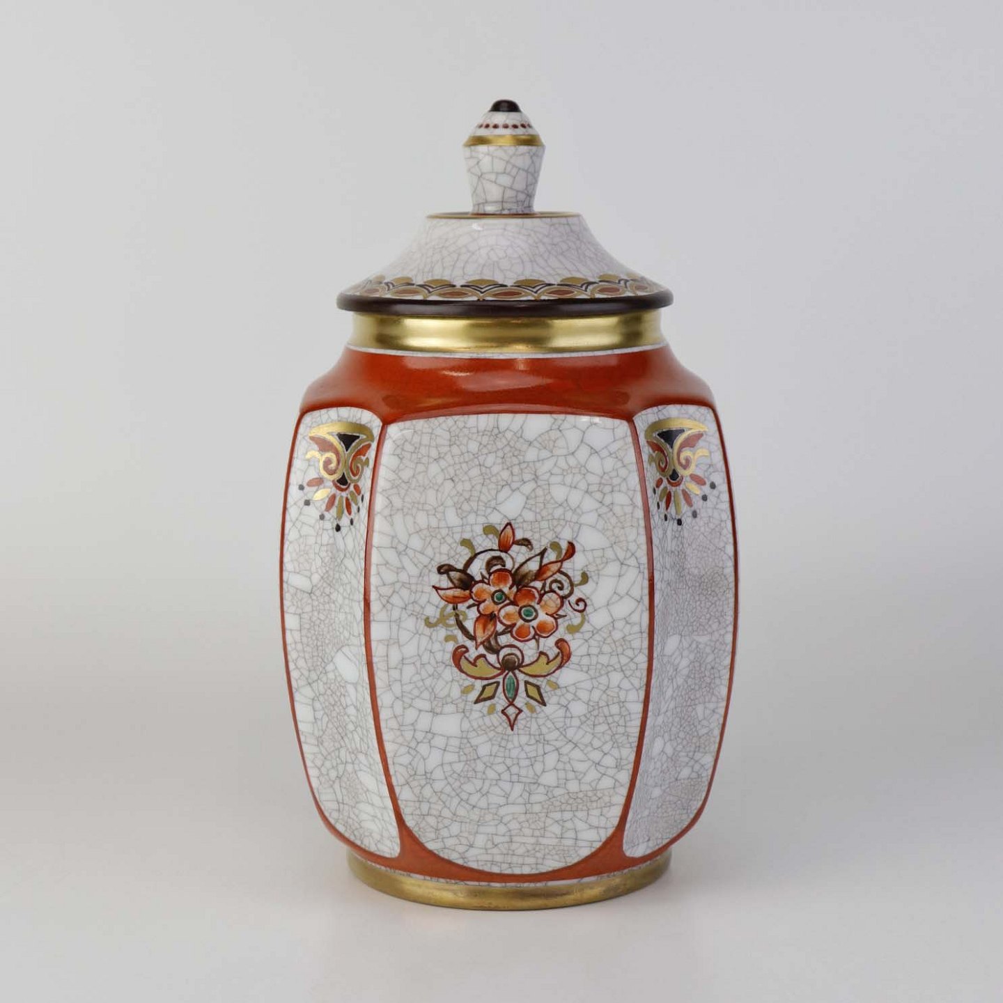 Beskrivelse: Kantet krukke med låg i porcelæn med krakele glasur og motiv af blomster samt kantet med orangerød bort og guld kant. Nr. 196/600