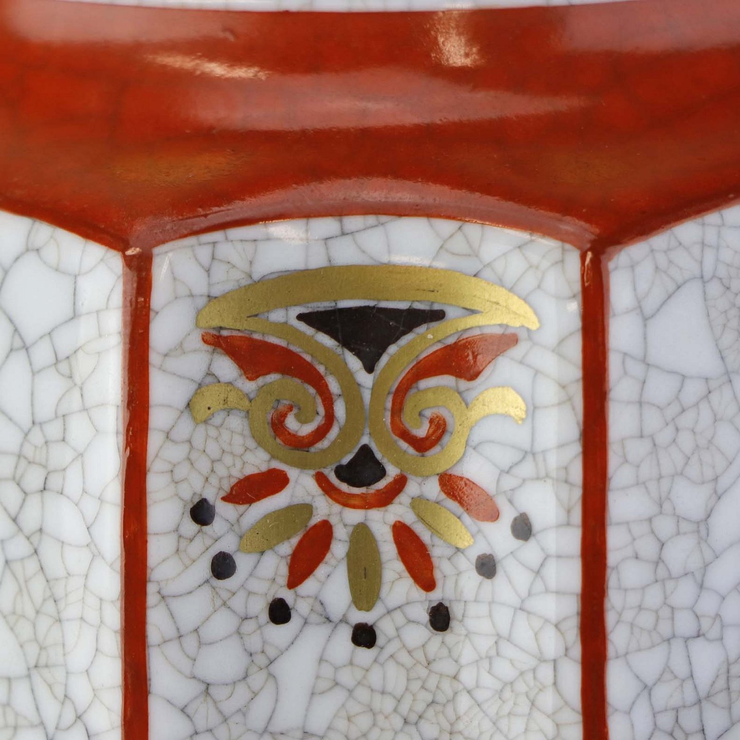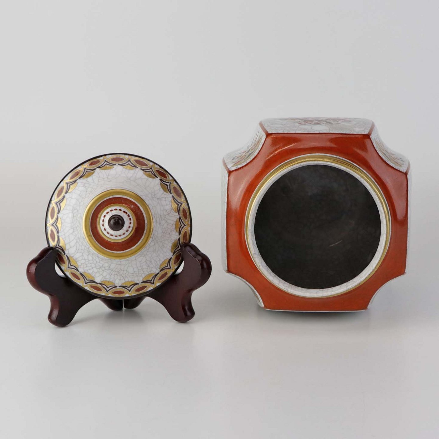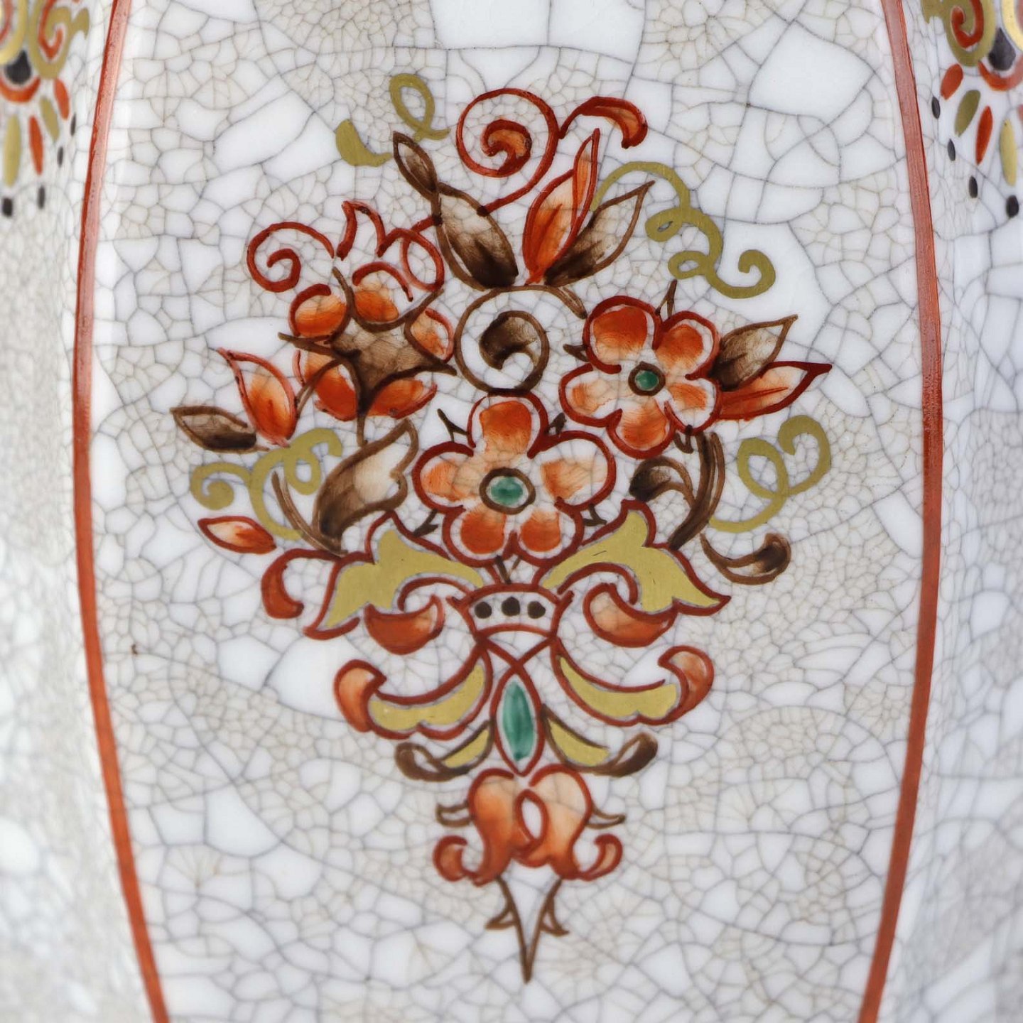 Beskrivelse: Kantet krukke med låg i porcelæn med krakele glasur og motiv af blomster samt kantet med orangerød bort og guld kant. Nr. 196/600