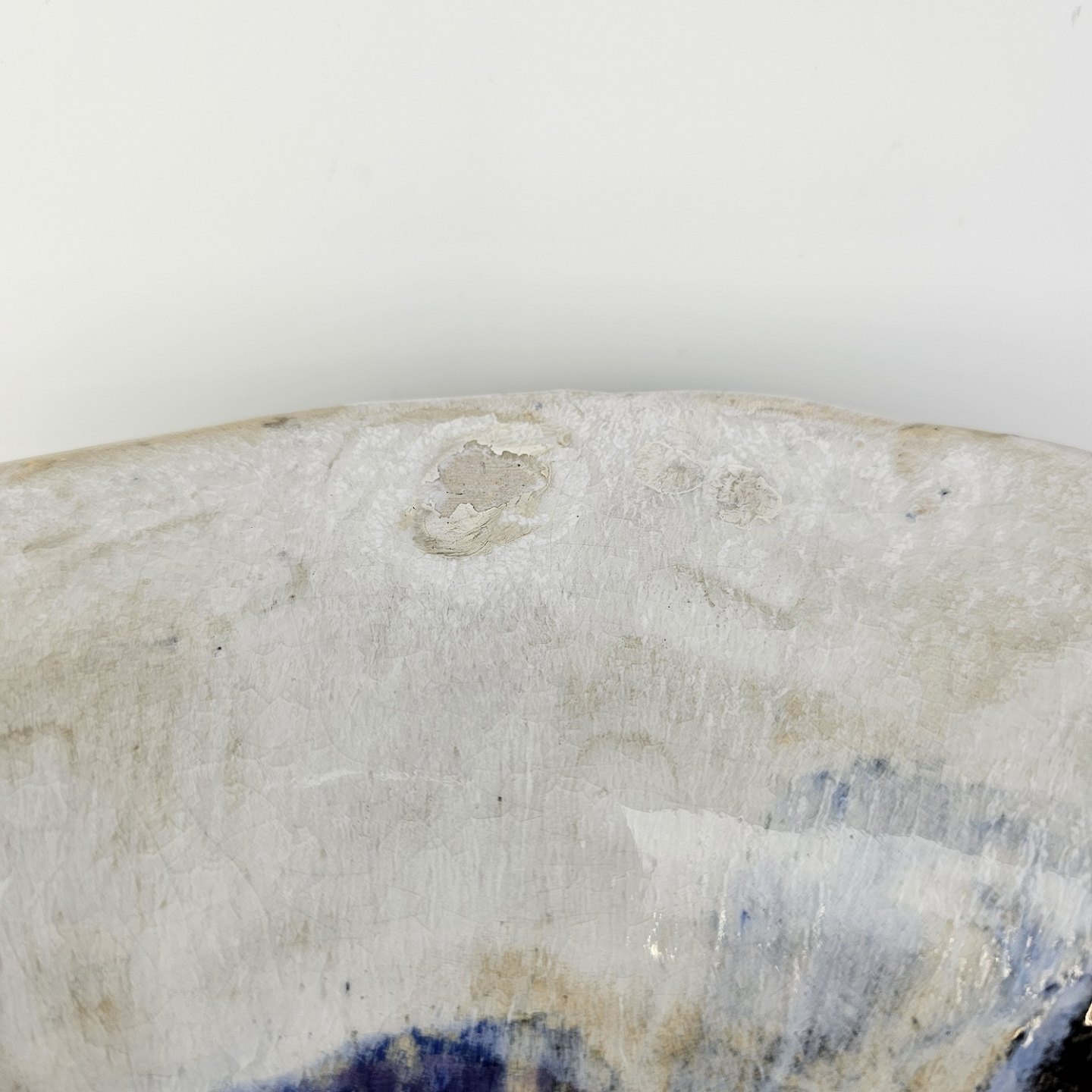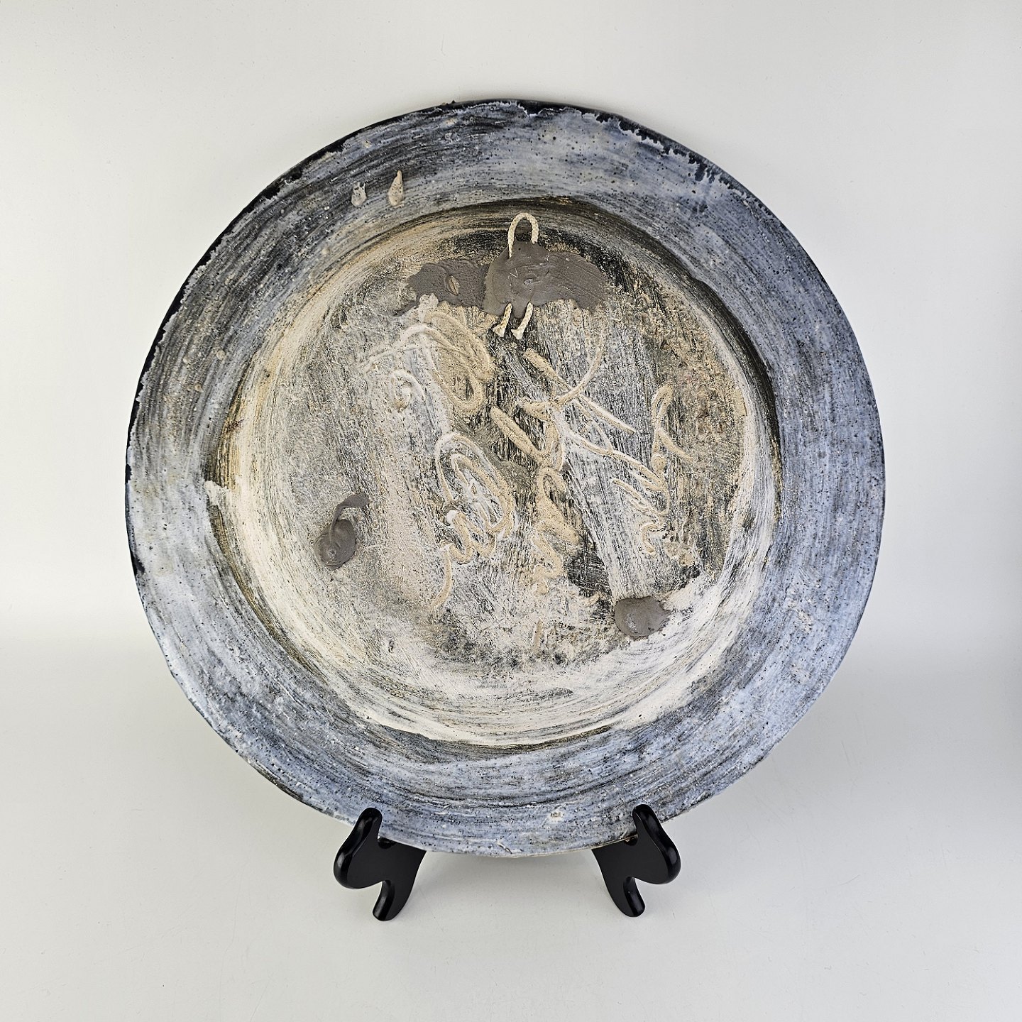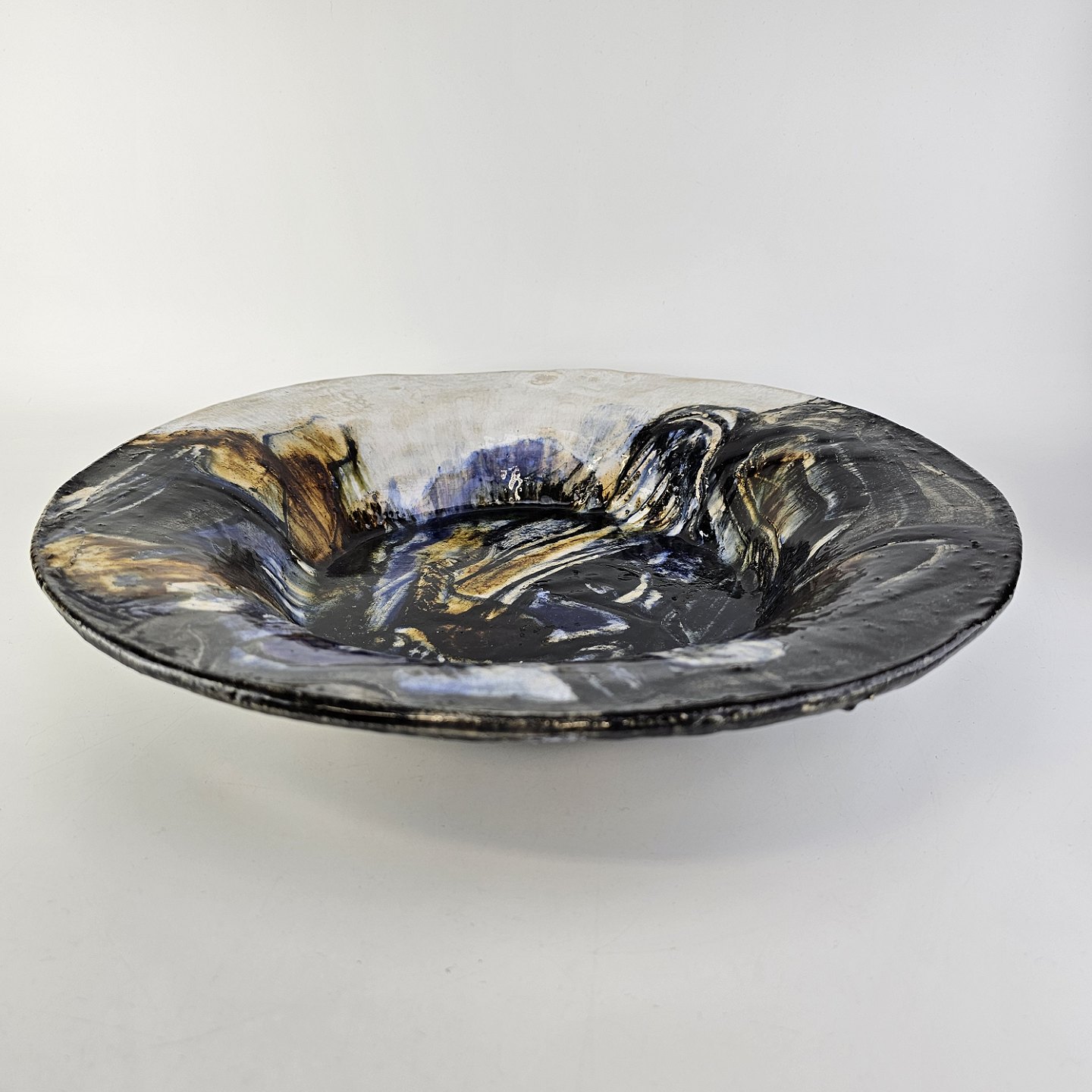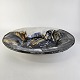 Beskrivelse: Stort rundt fad i glaseret keramik med abstrakt mønster i sorte, blå og brune nuancer