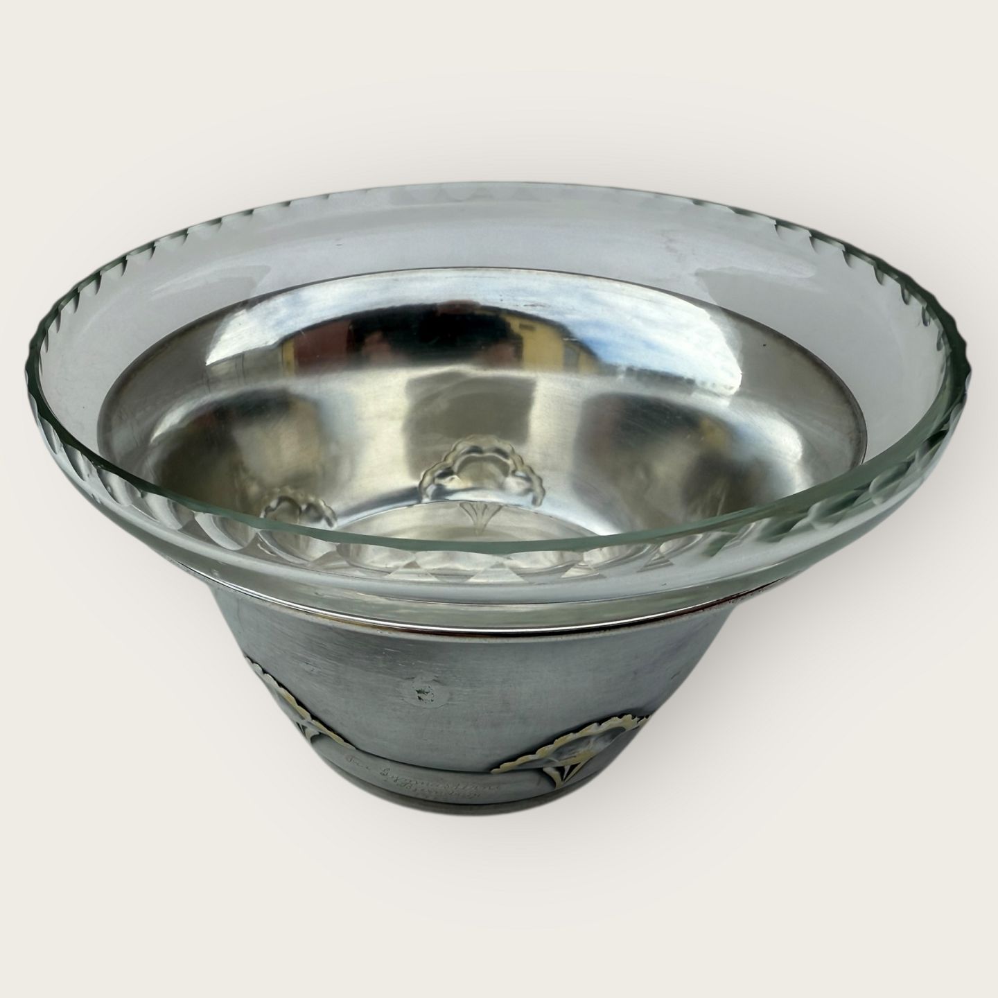 Beskrivelse: Mindre sølvpletskål med glasindsats, højde 8,5cm, diameter 13,8cm, glasindsatsen i fin stand, sølvpletskålen med patina og indgraveret: Fra gymnasterne i Bjerndrup 1942