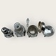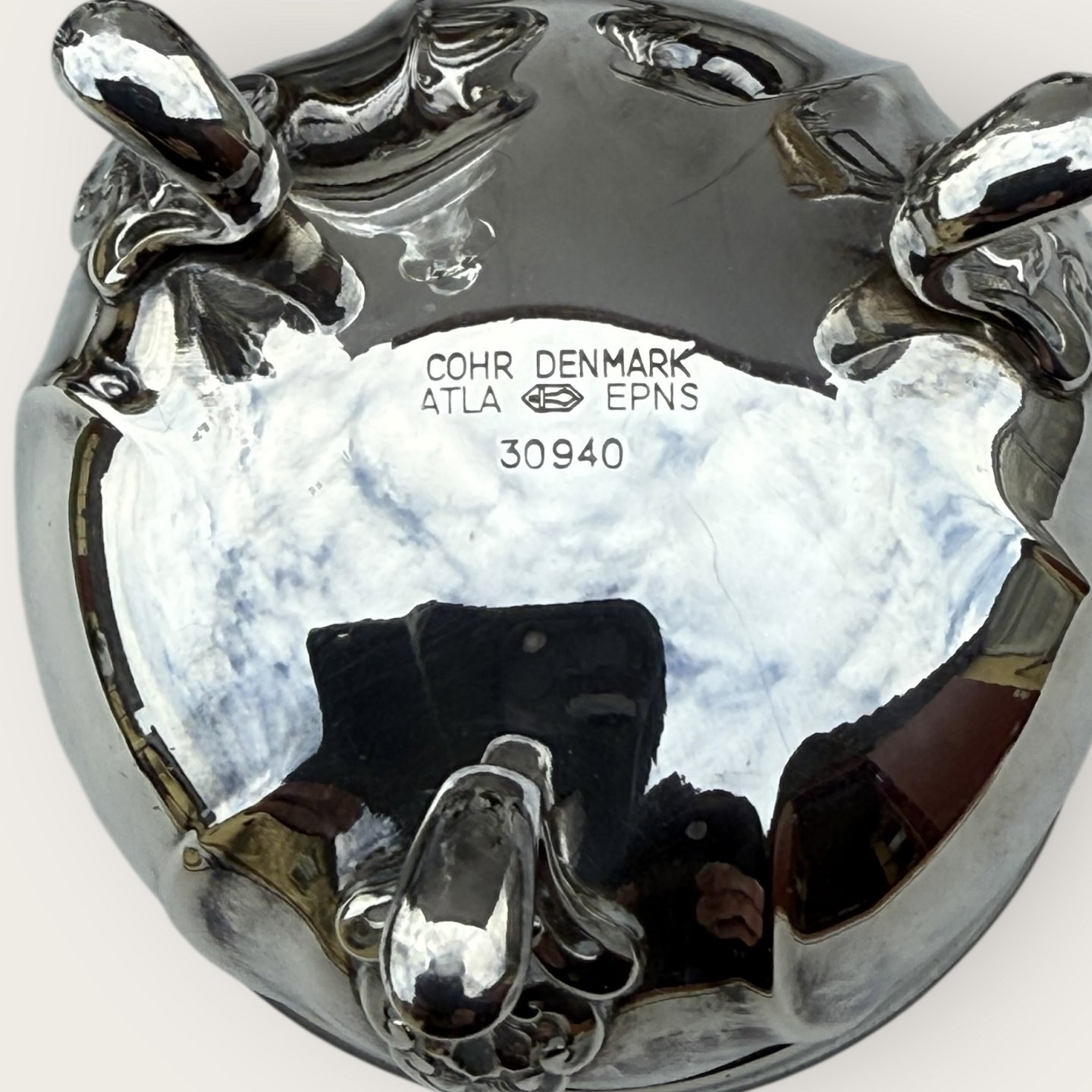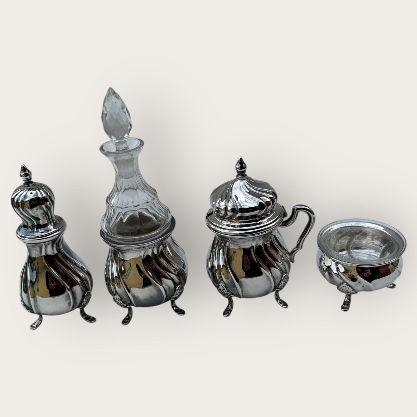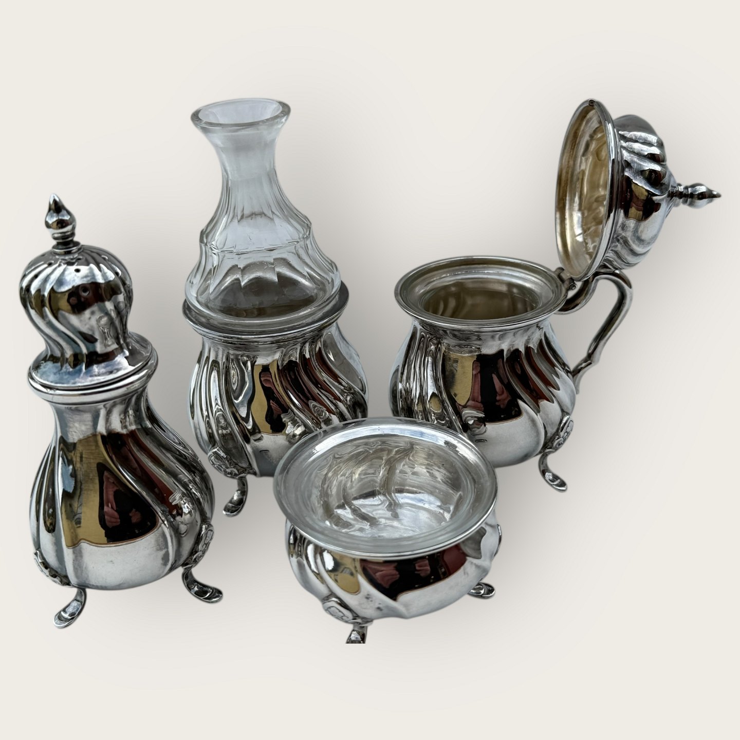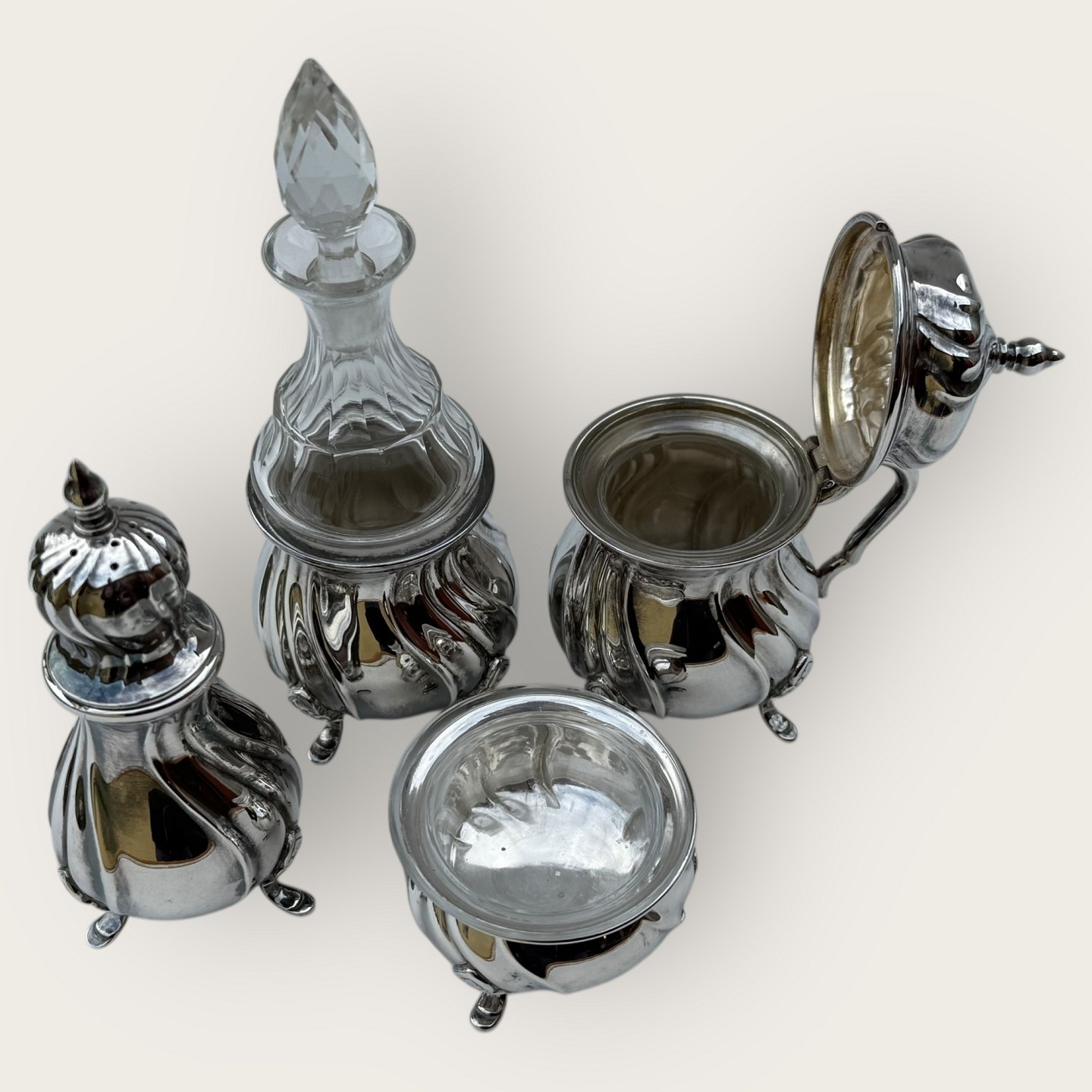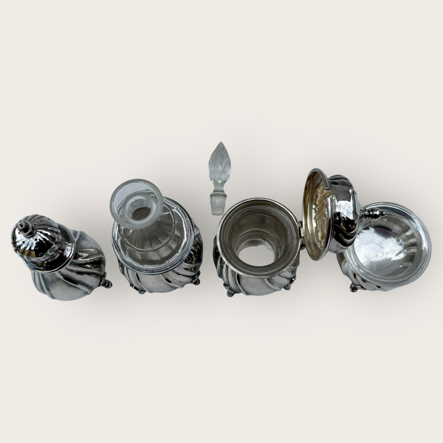 Beskrivelse: Cohr sølvvarefabrik, Plat de Menage, 4 dele, saltkar med glasindsats, sennepskrukke også med fin glasindsats og flaske / karaffel i fin stand (højde 15,5cm), Saltkar diameter 6cm, sennepskrukke 11cm høj, Peberbøsse 12cm høj