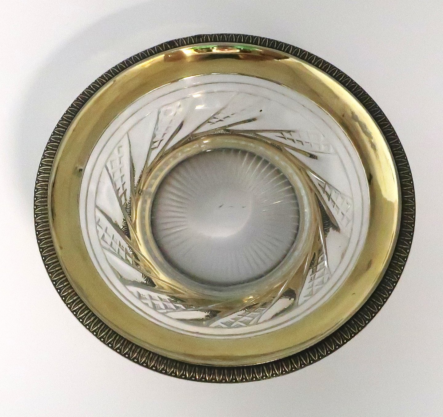 Beskrivelse: Fransk kop af krystal med sølv forgyldt montering. Kop og underkop. Højde 13 cm. Mindre kantafslag på undersiden af kop.