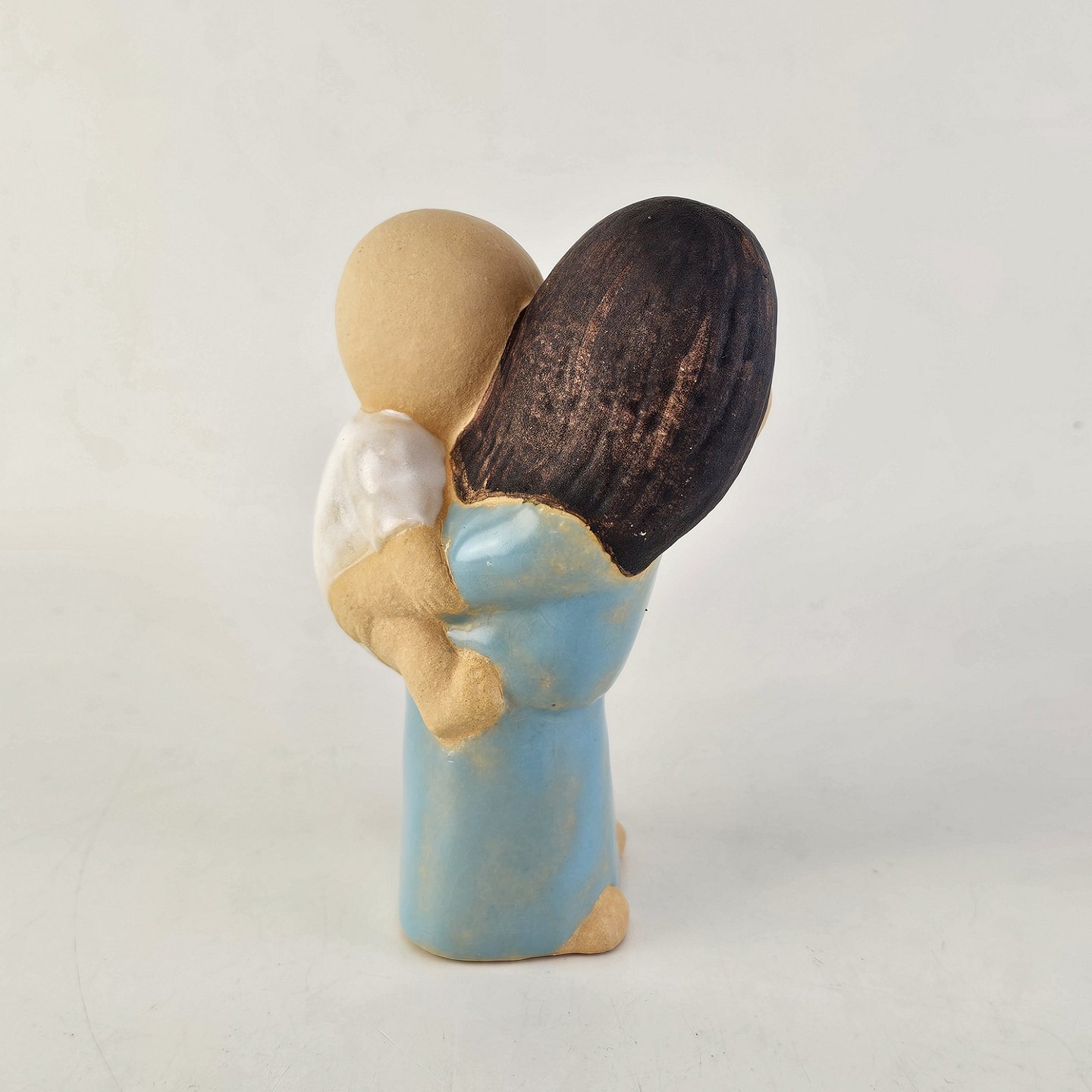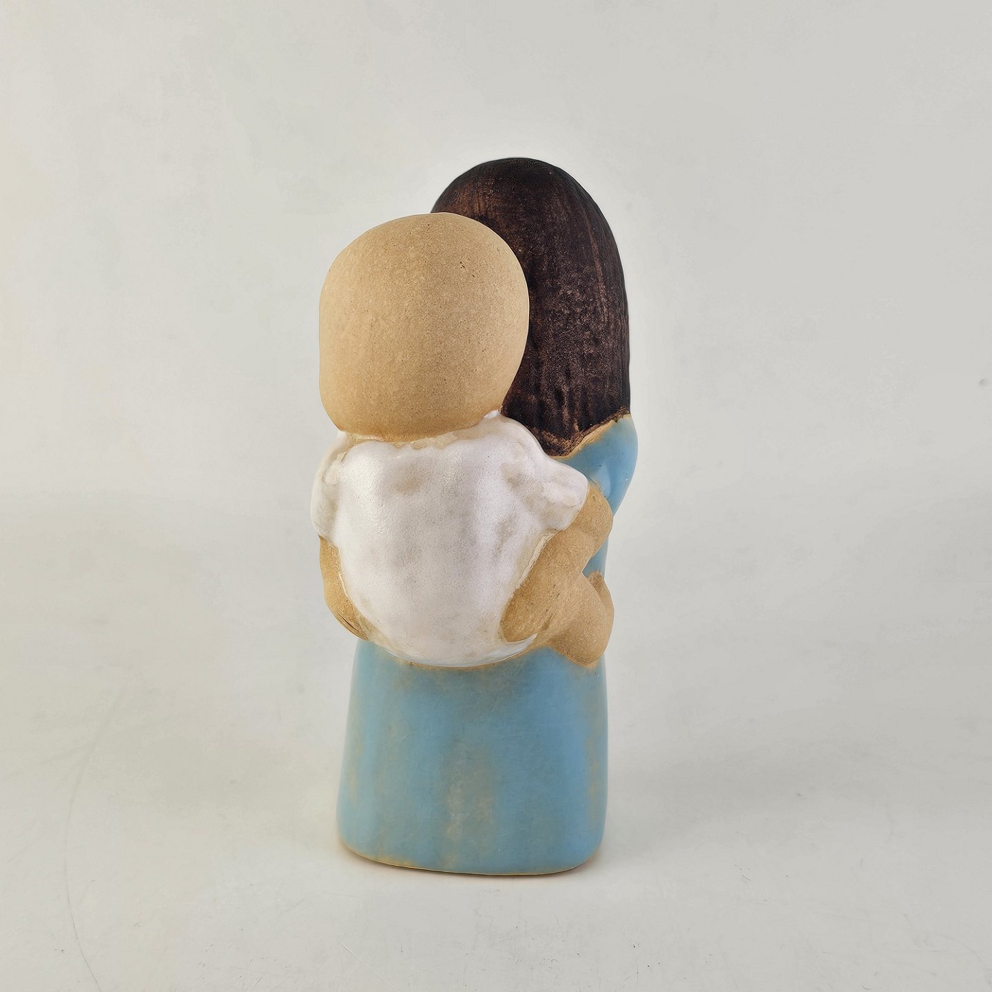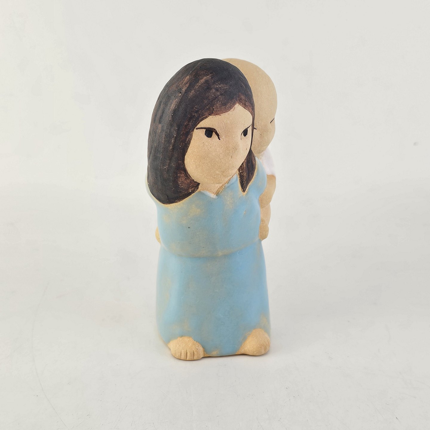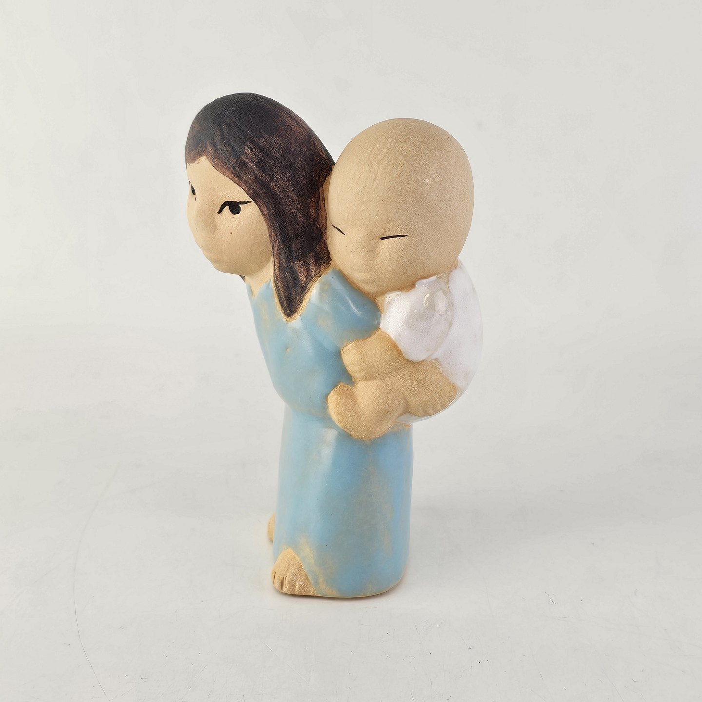 Beskrivelse: Figur i keramik med motiv af en pige med lys hud og brunt hår, som har et barn på ryggen.